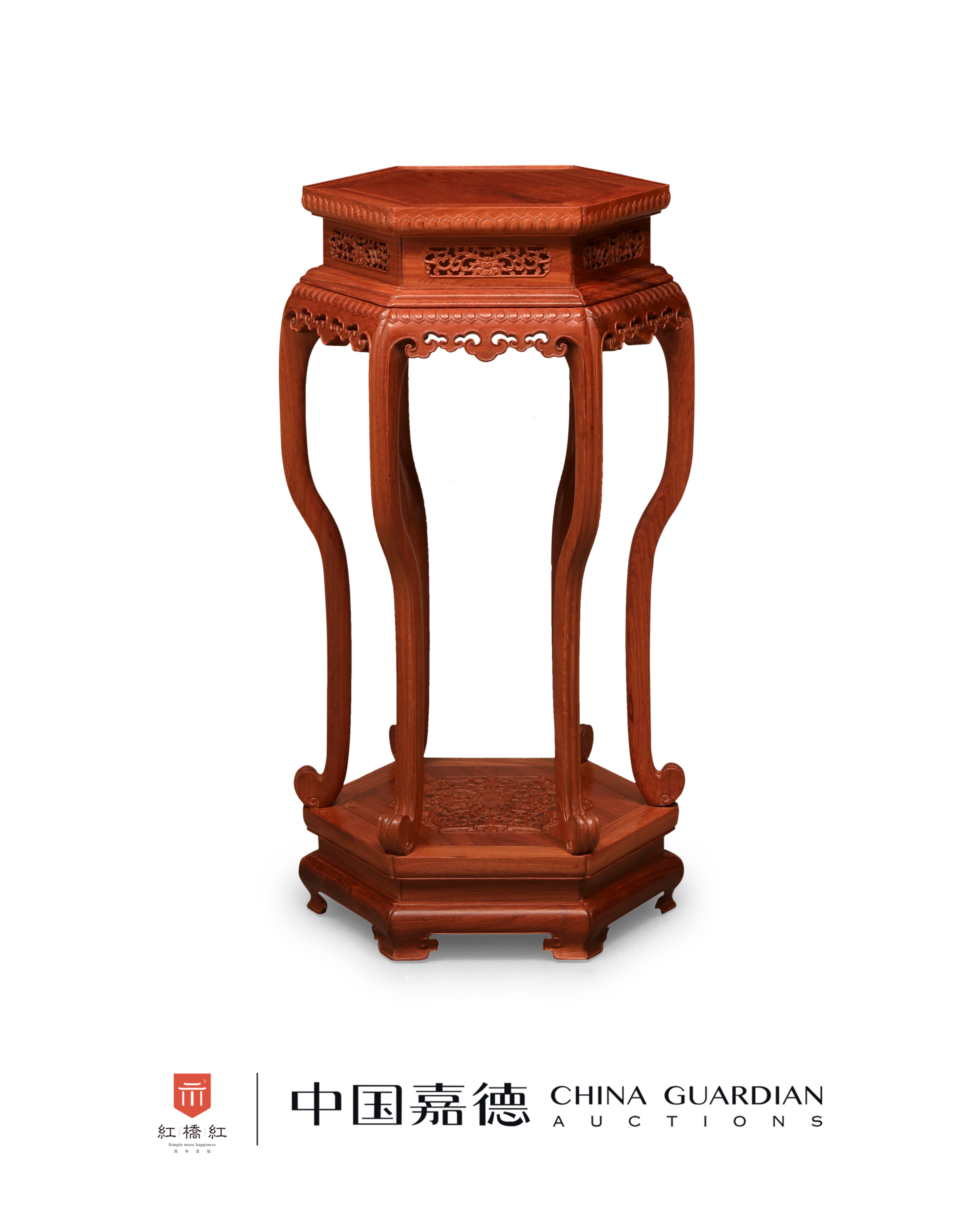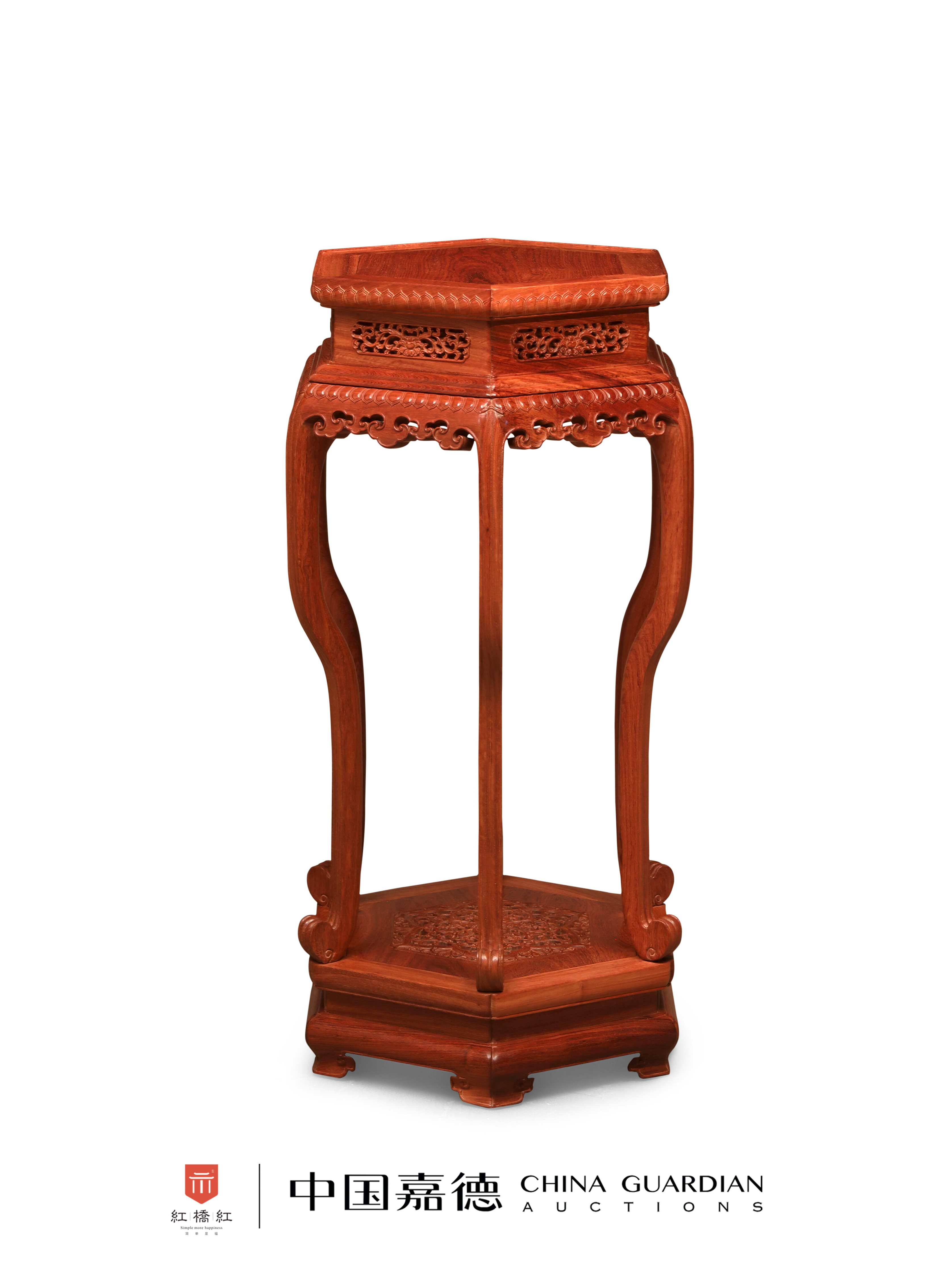底座同为六方形,须弥座式,座面中央镂雕花卉纹,其余光素,繁简相得益彰,保持节奏感。底座束腰平直,下又承如意足,结构严谨,上下呼应,设计紧凑而富韵律。香几整体运用了透雕、圆雕、浮雕等多种工艺,有清式家具巧思、富丽的韵致,而并不过分繁复。