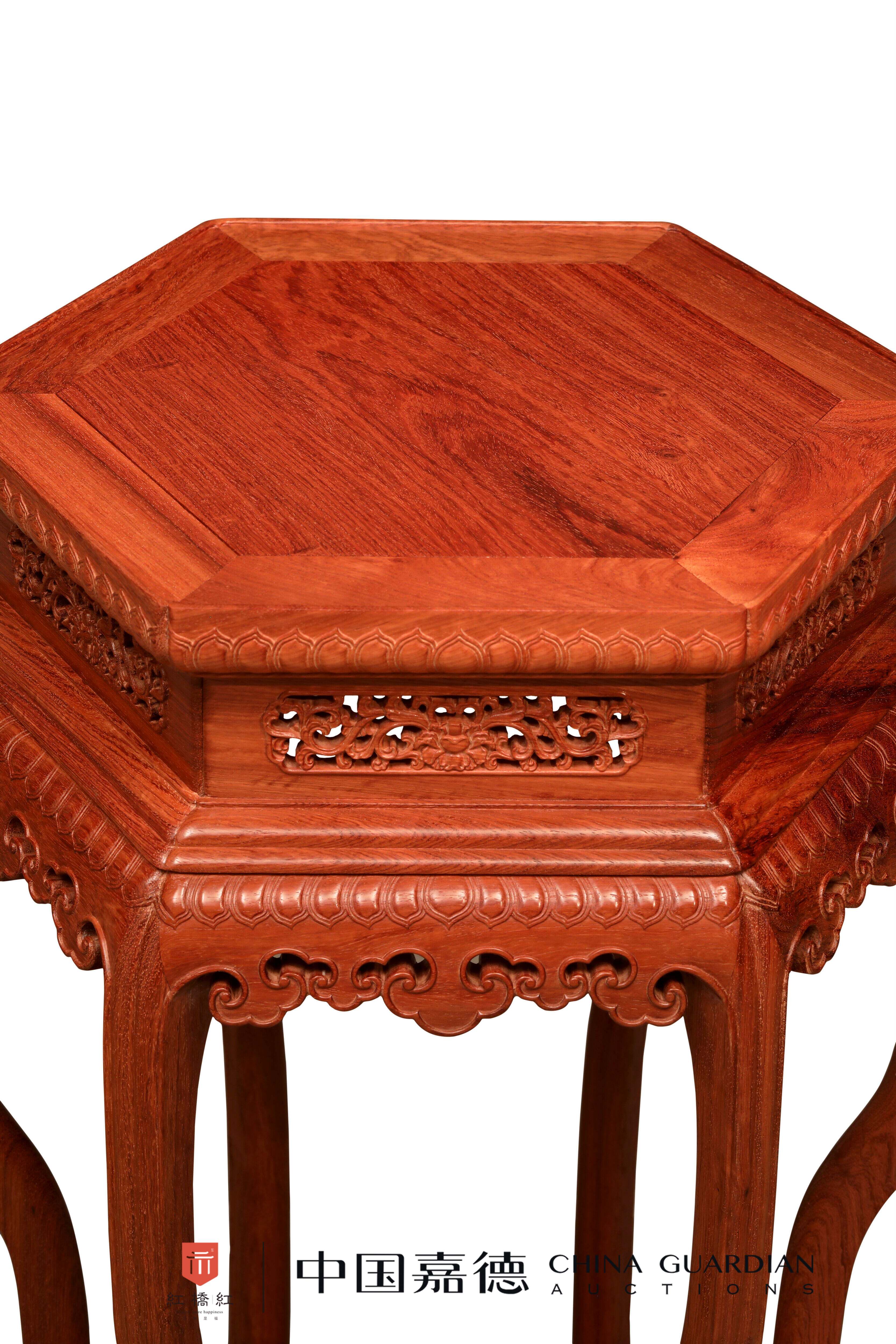 香几缅甸花梨木制,六边形,几面以格角攒框镶板,设拦水线,边抹较厚,雕刻俯莲瓣纹,与托腮下的仰莲瓣纹呼应,形成须弥座式的束腰。几面下高束腰部分镂雕宝相花纹饰,二阶式托腮光素。每面牙板均垂下大小不等的五朵云纹,形状精美又不失可爱,沿边起细致、流畅、连贯的灯草线。三弯腿足曲线优美,看面锼刻丰富的线脚,足端外翻如意。