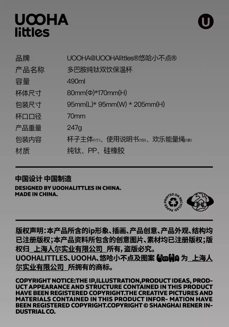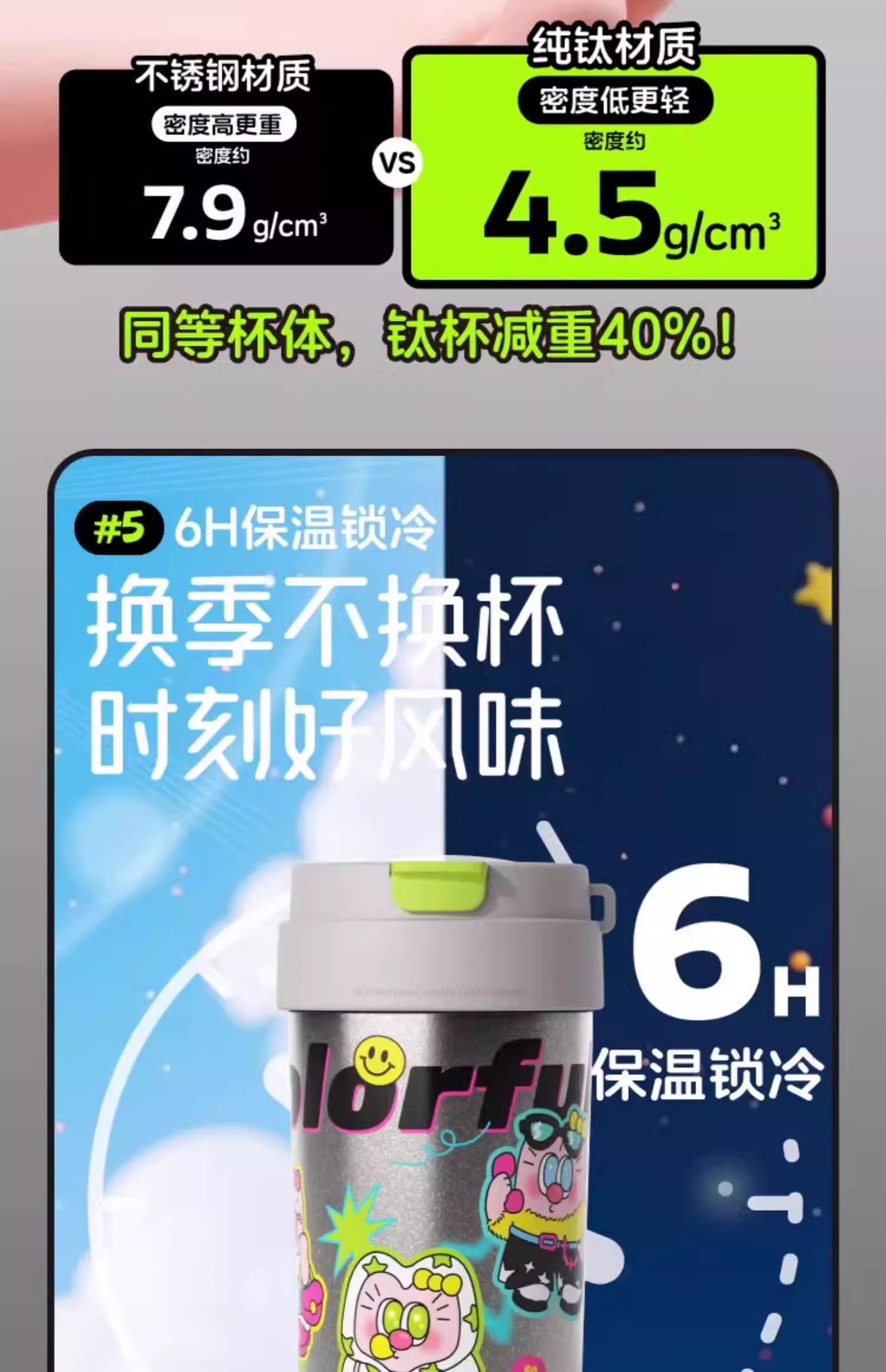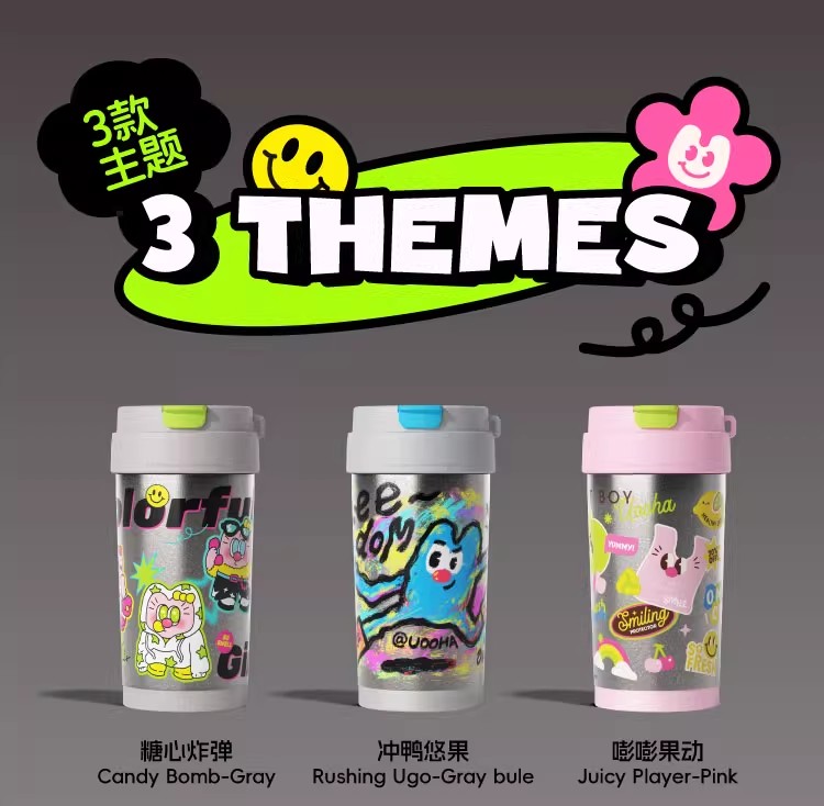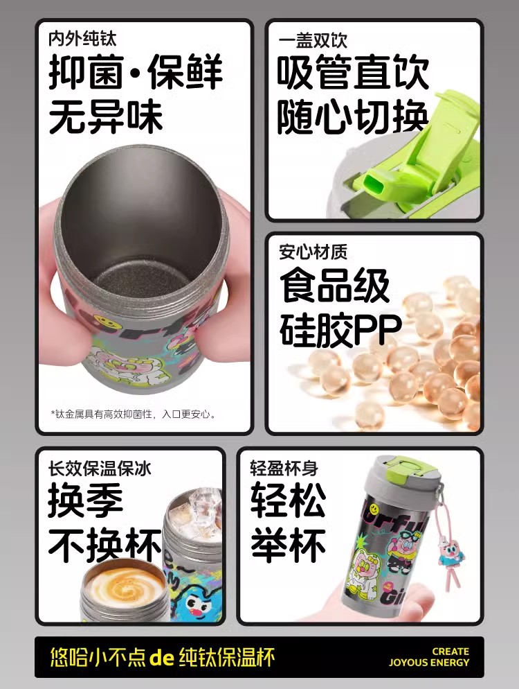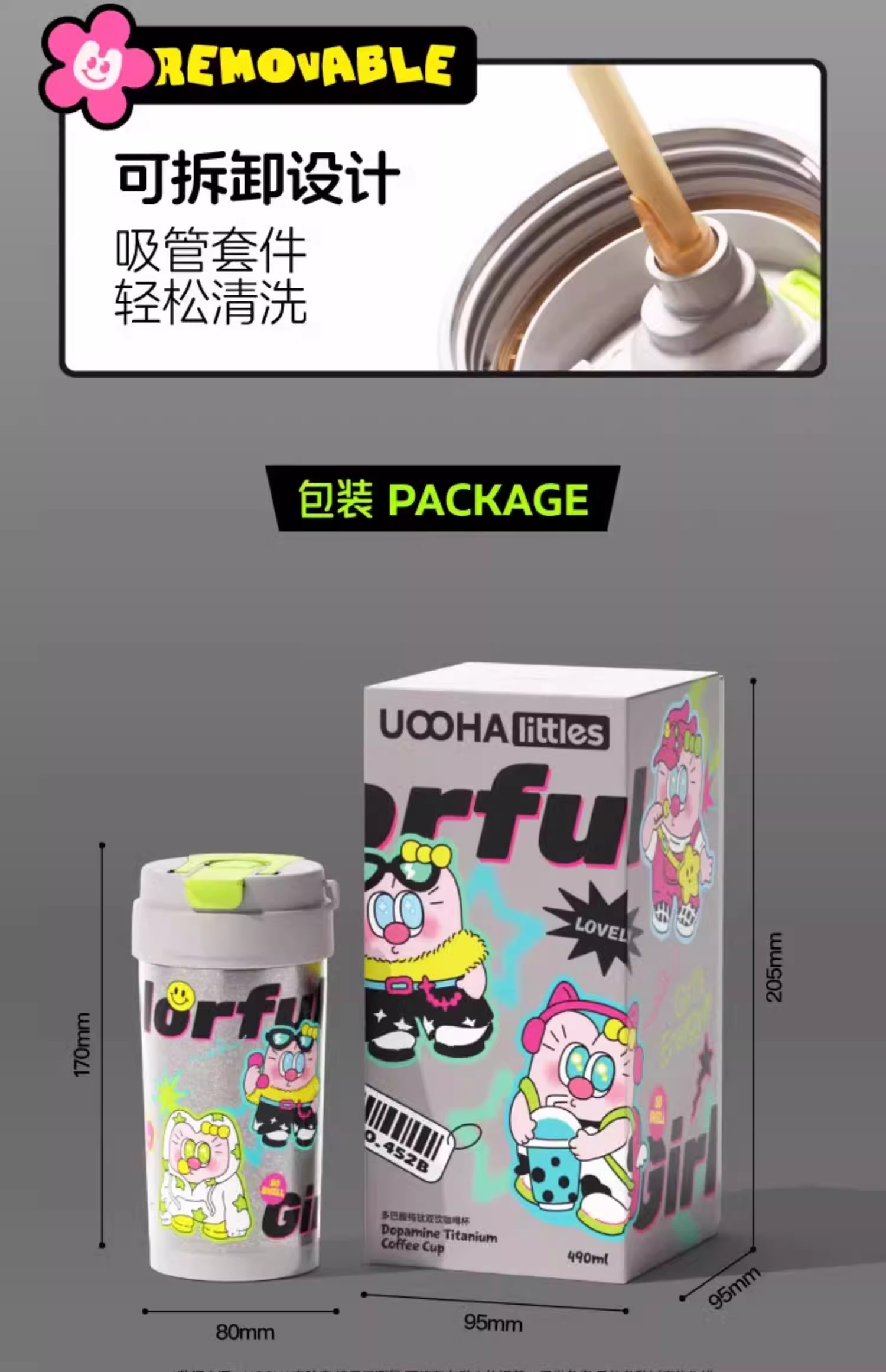 uooha多巴胺纯钛双饮咖啡杯冲鸭悠果-灰蓝 (490ml)