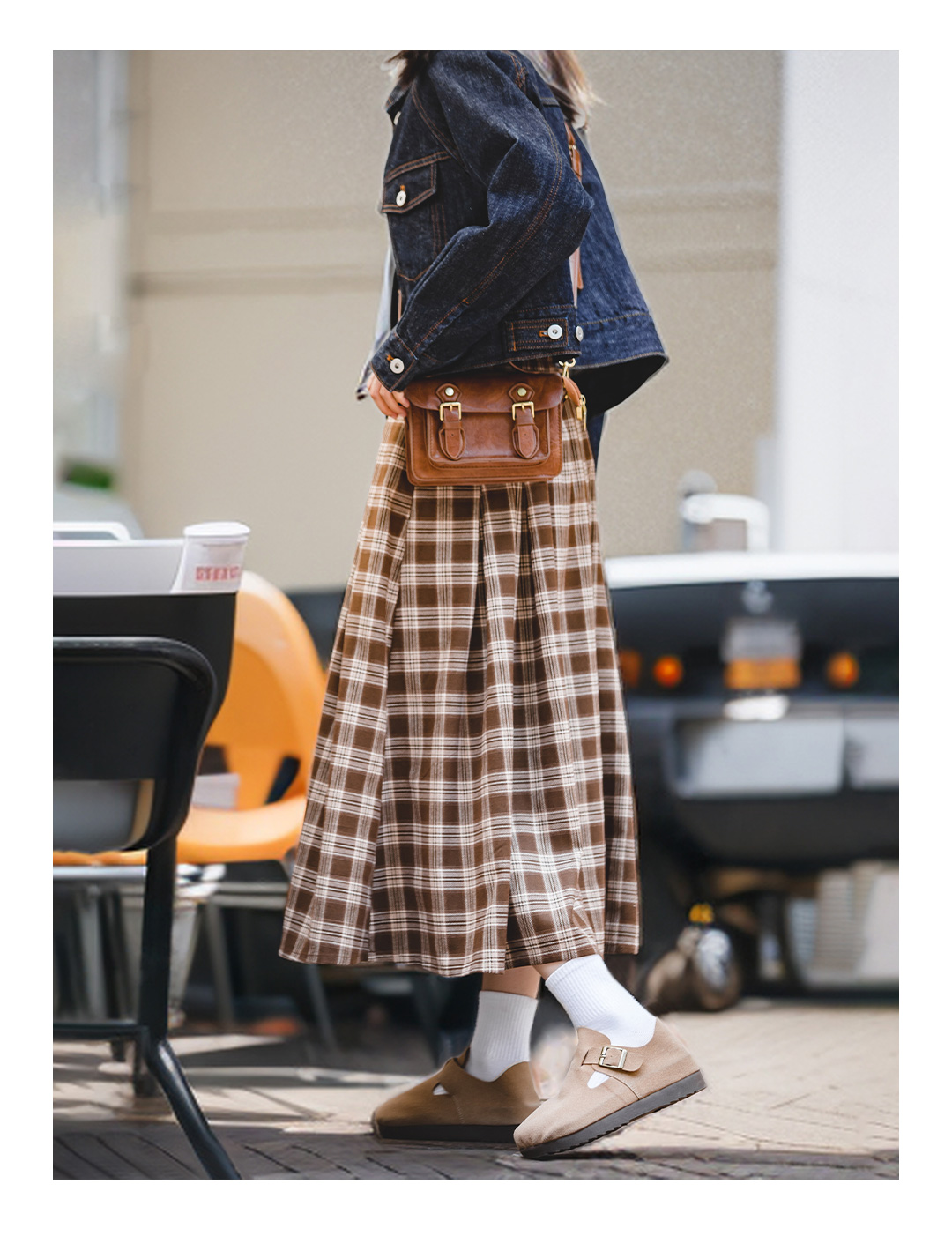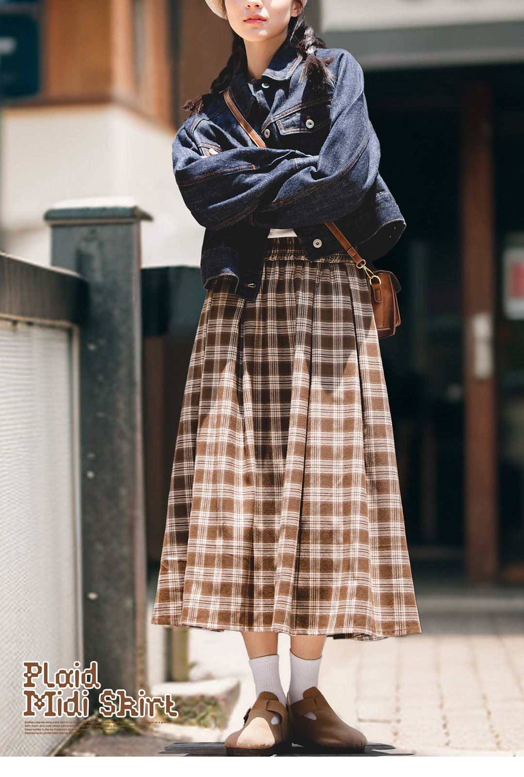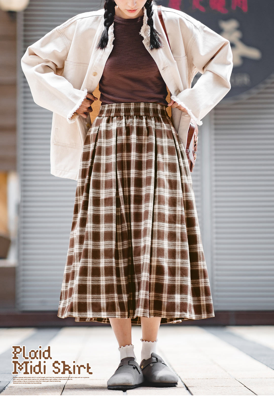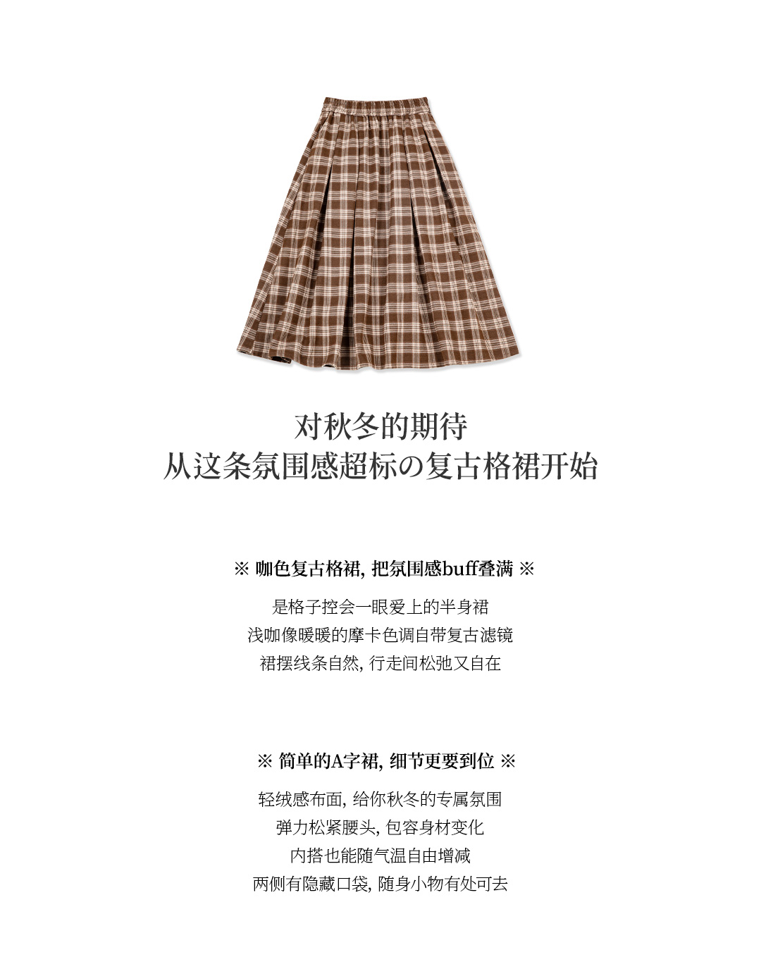 马登女装美式格子口袋半身裙宽松休闲显瘦显高复古格纹长伞裙秋季