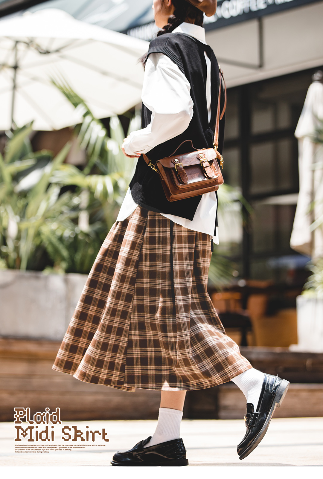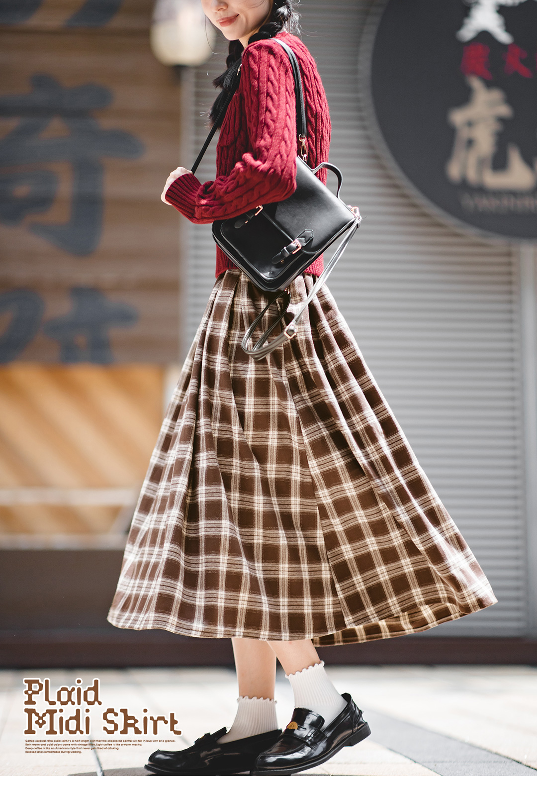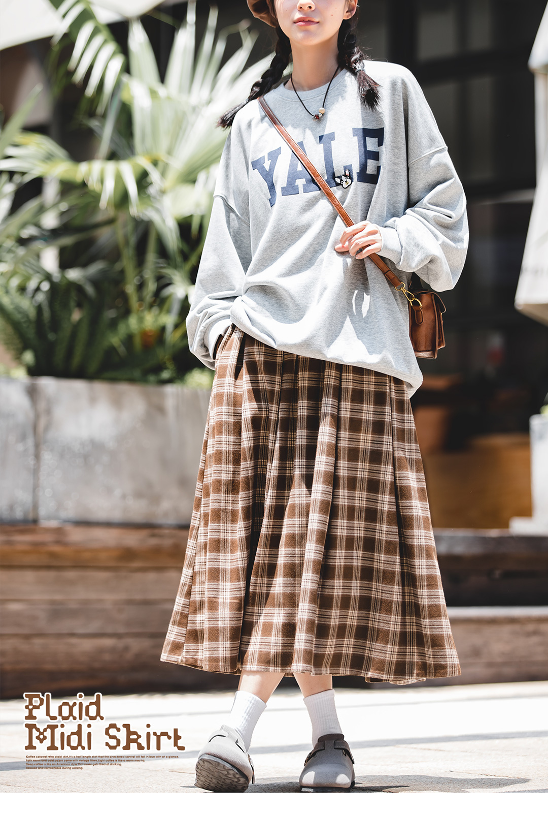 马登女装美式格子口袋半身裙宽松休闲显瘦显高复古格纹长伞裙秋季
