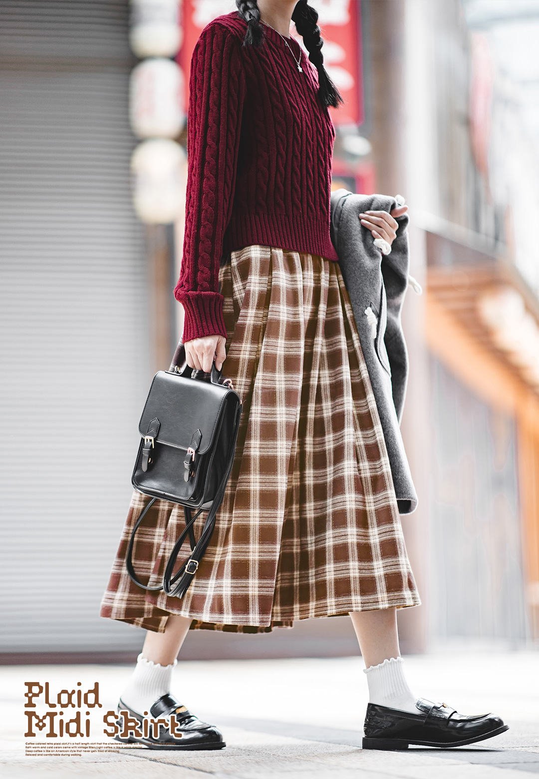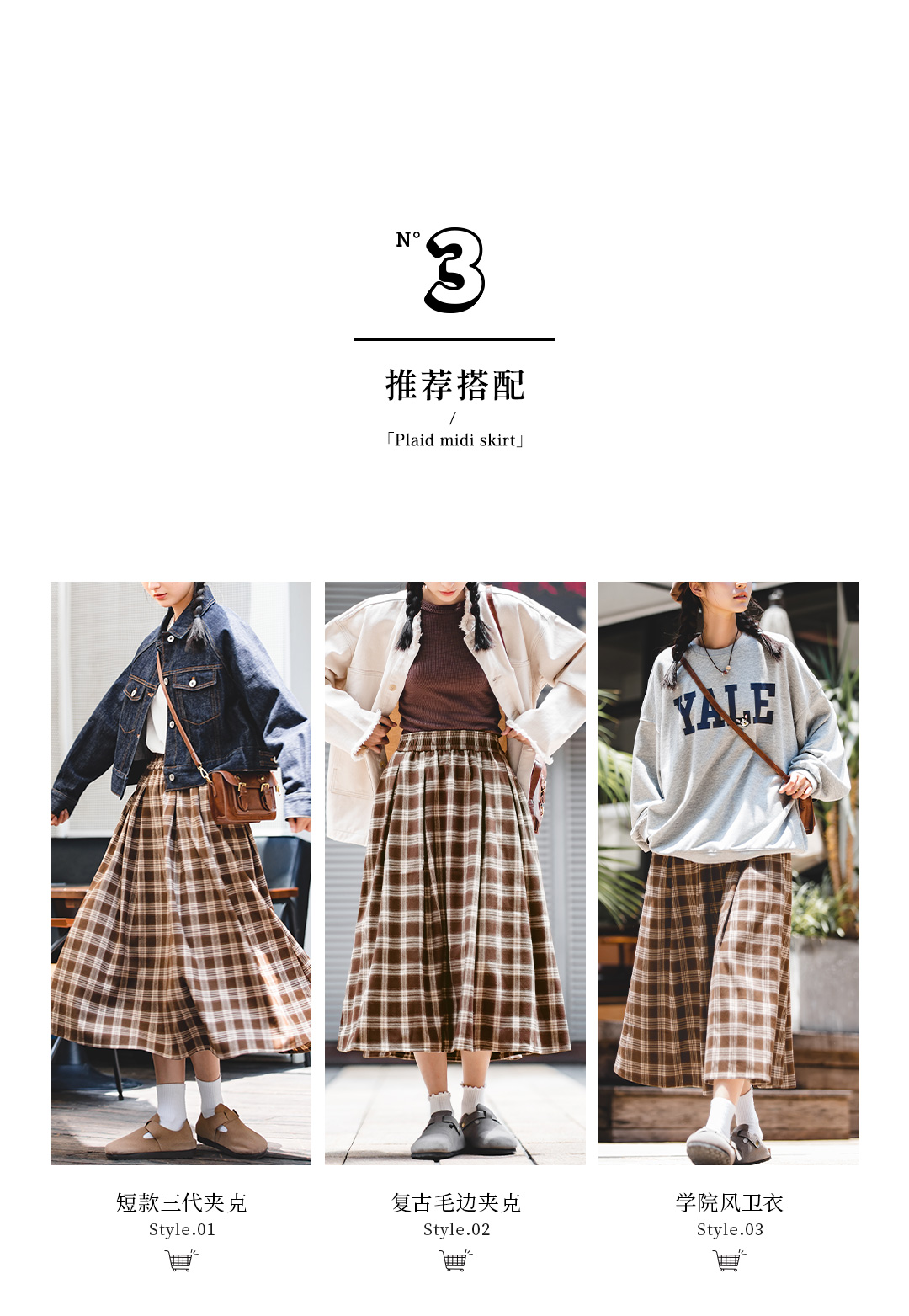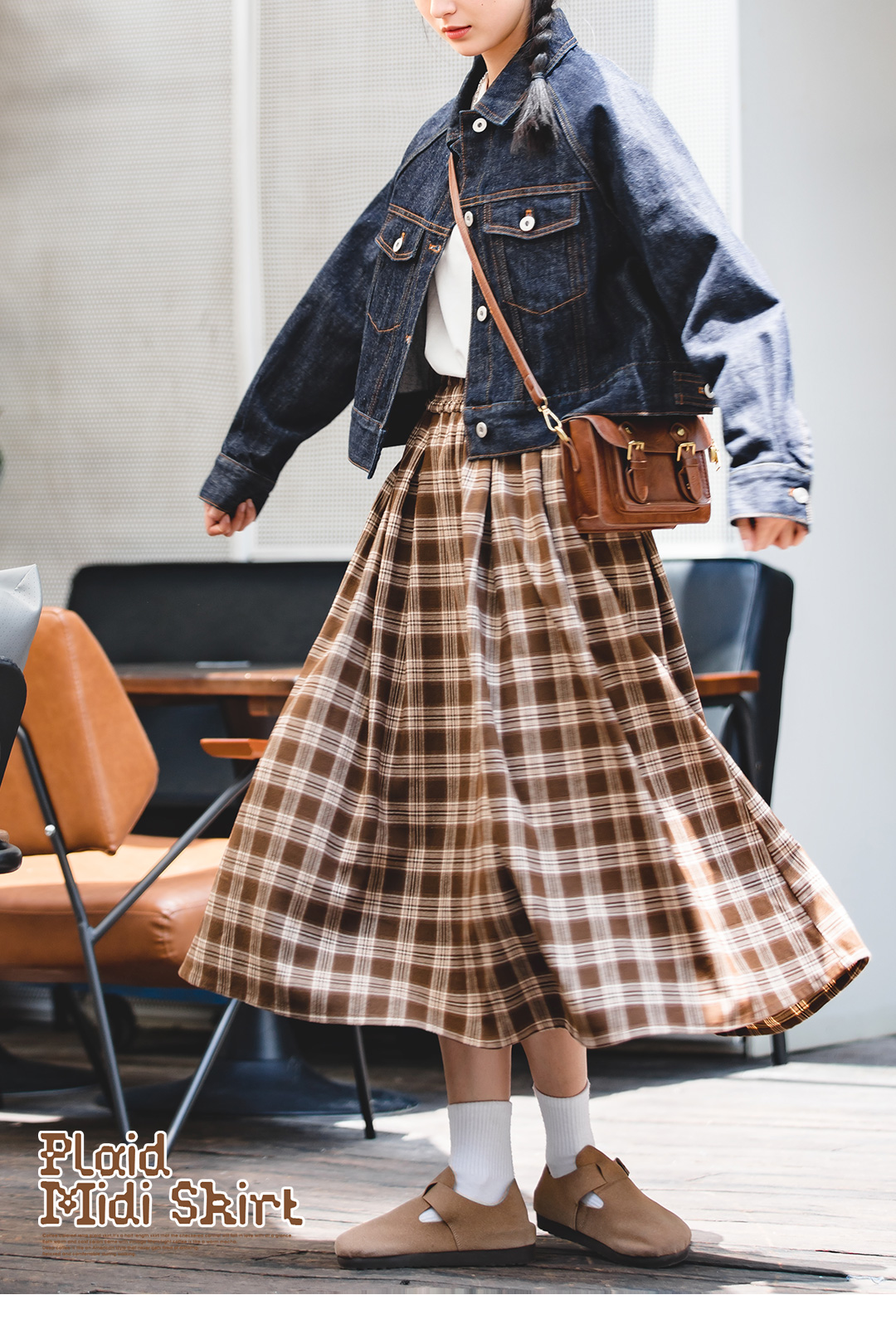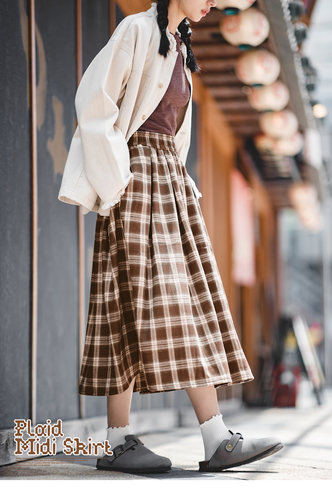 马登女装美式格子口袋半身裙宽松休闲显瘦显高复古格纹长伞裙秋季