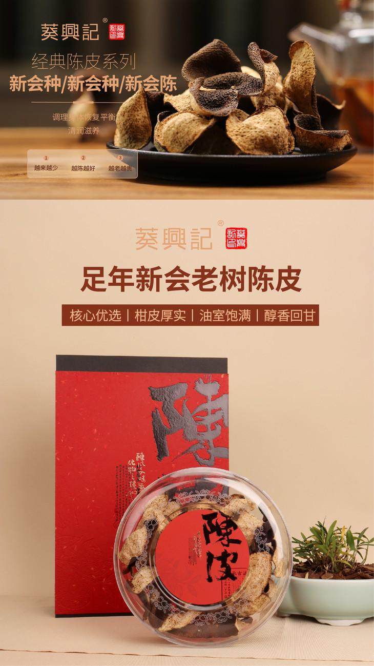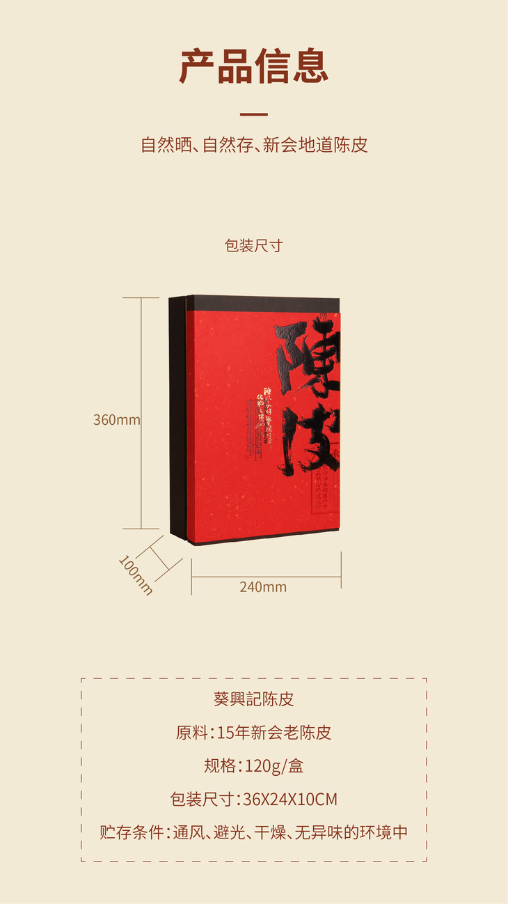| 产品名称 | 葵興記精选15年陈皮120克礼盒装 |
