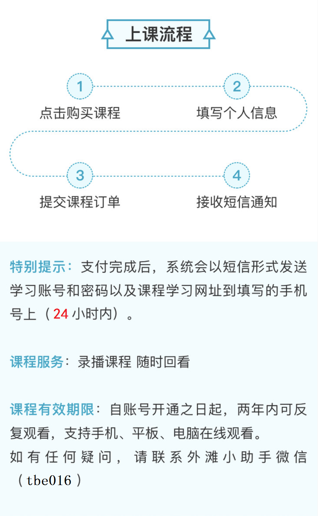 2、购买成功后,我们会在24小时之内,发送相关账号密码到您购买时留的微信号/手机号,登录即可参与课程。