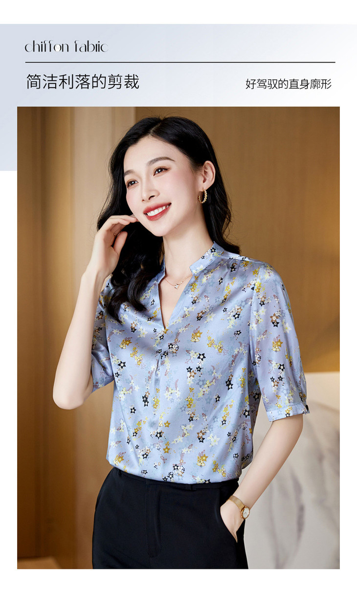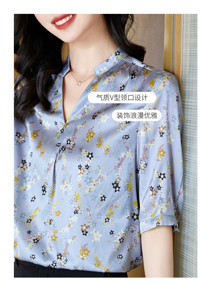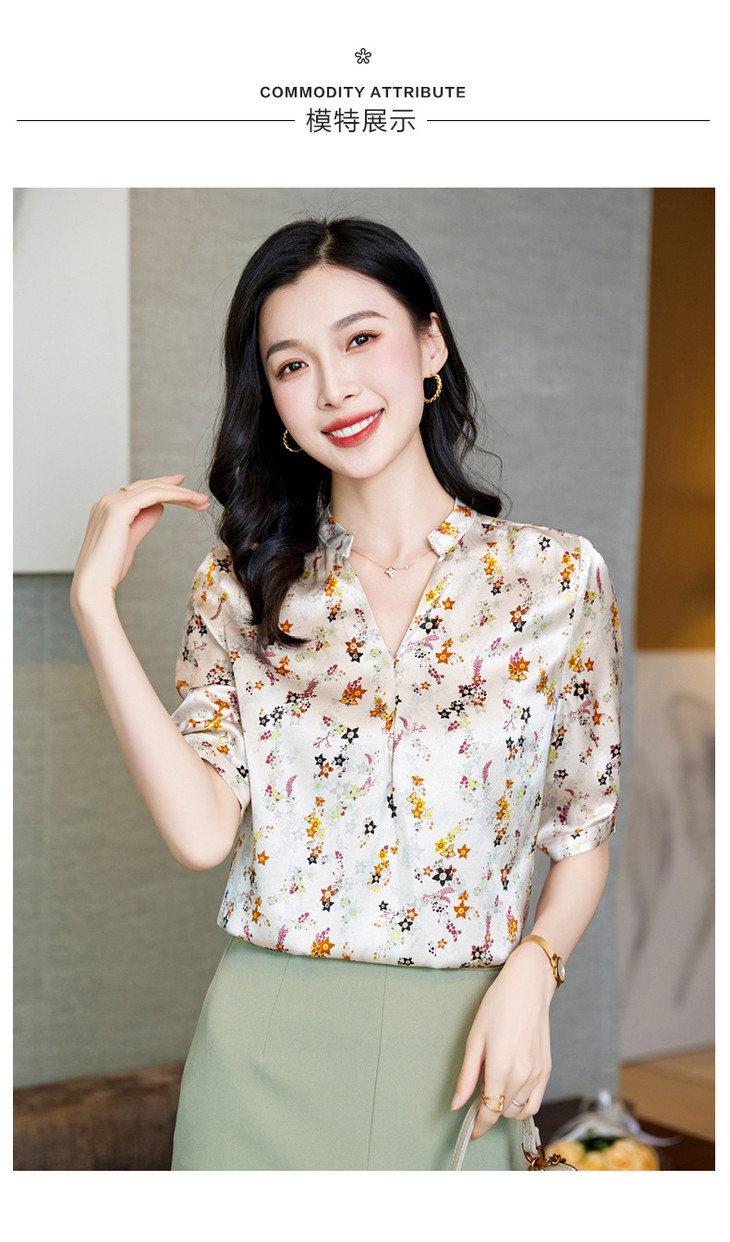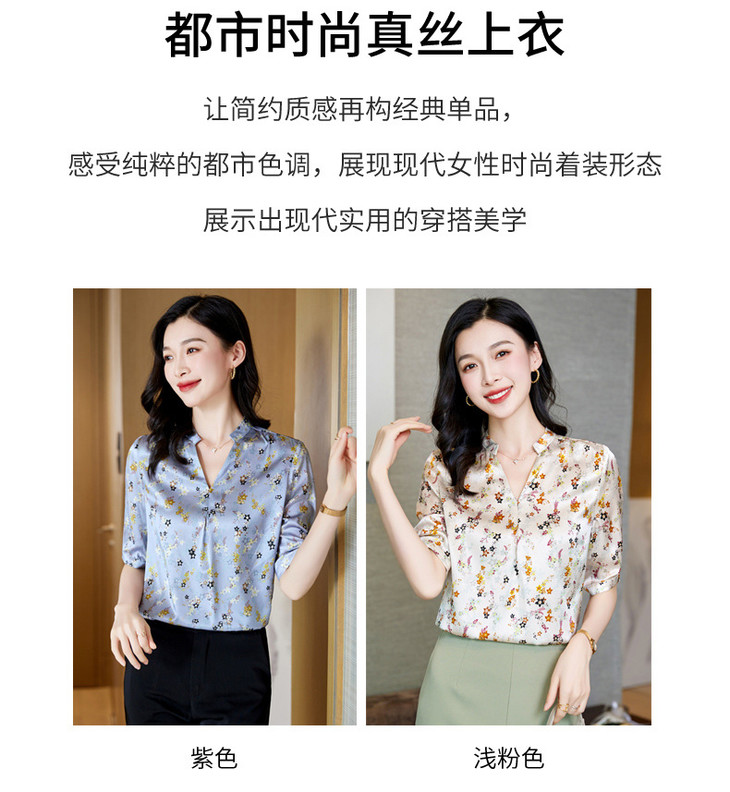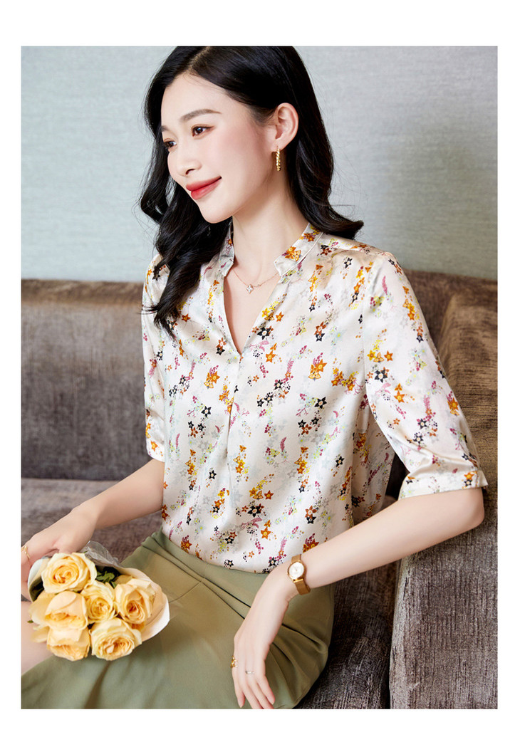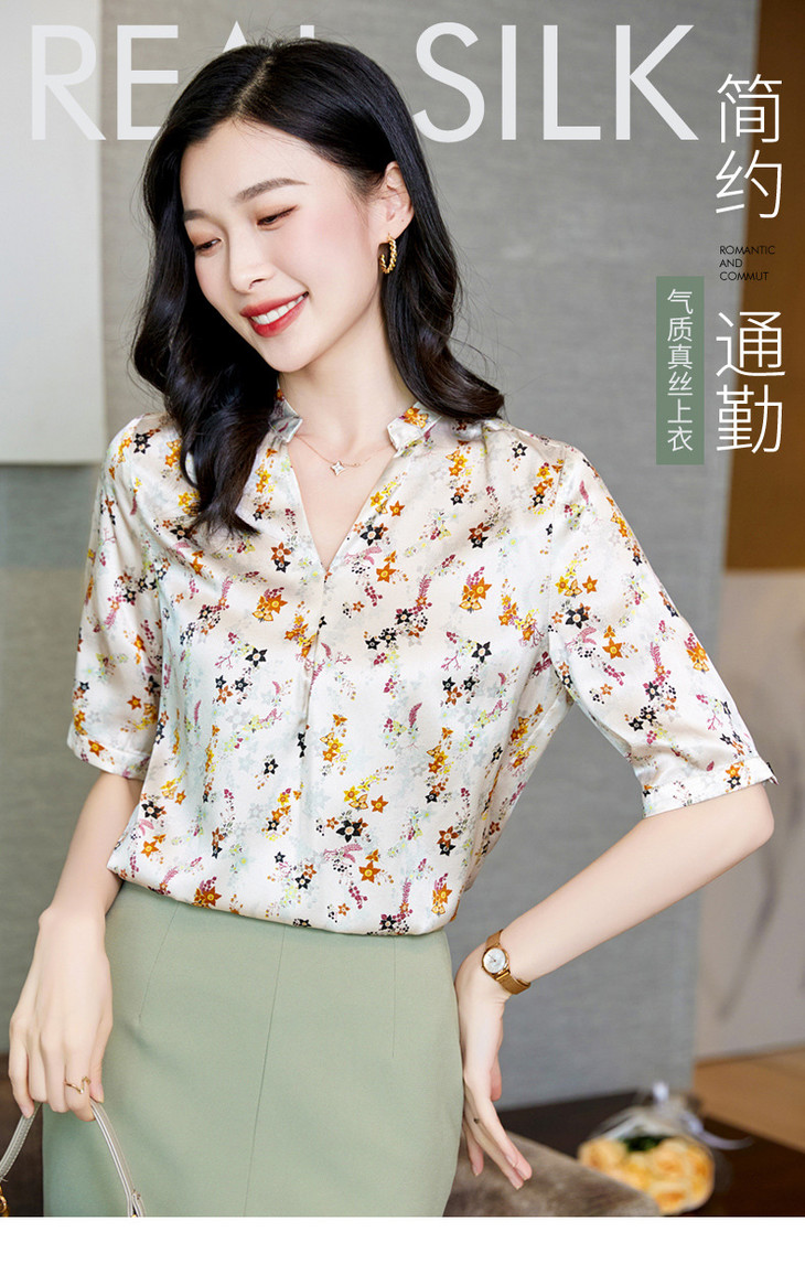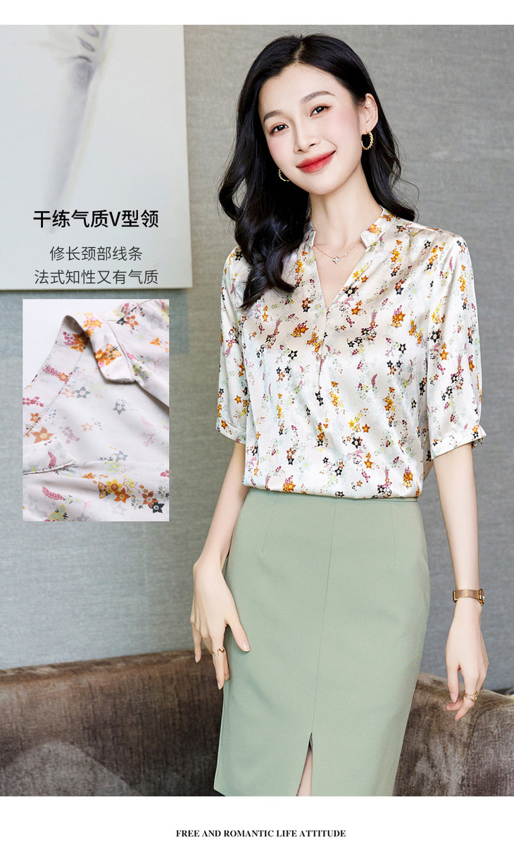YQ小清新碎花中袖时尚衬衫女夏2024新款气质V领轻熟高端桑蚕丝上衣