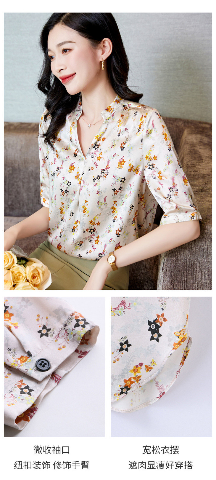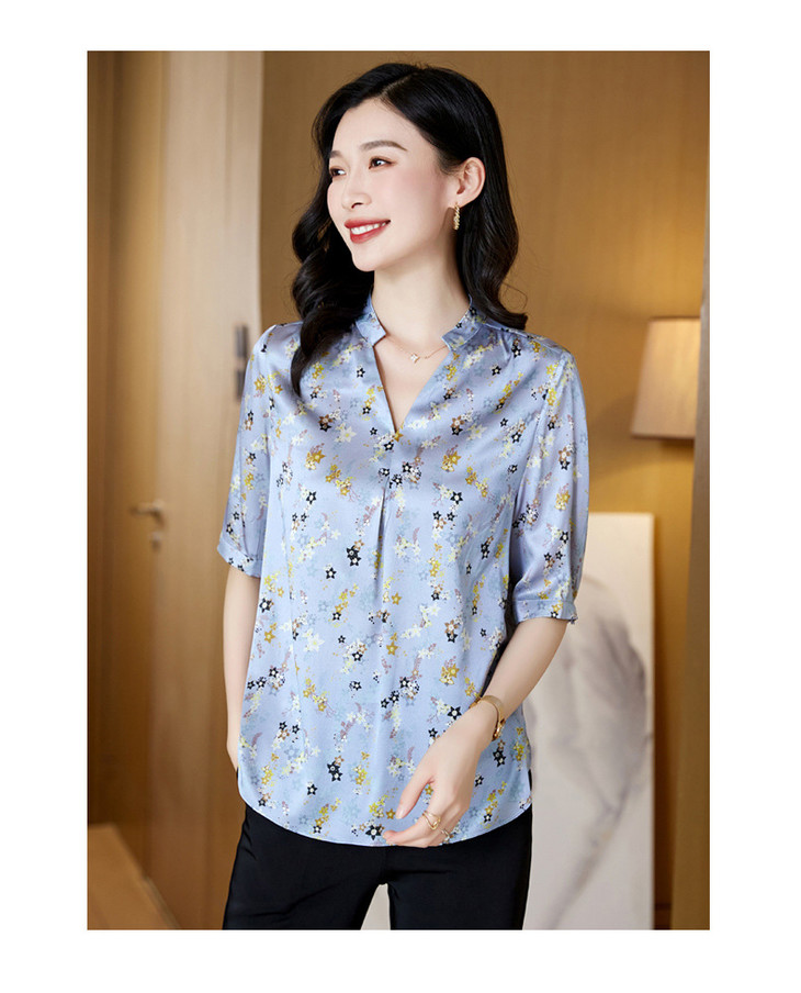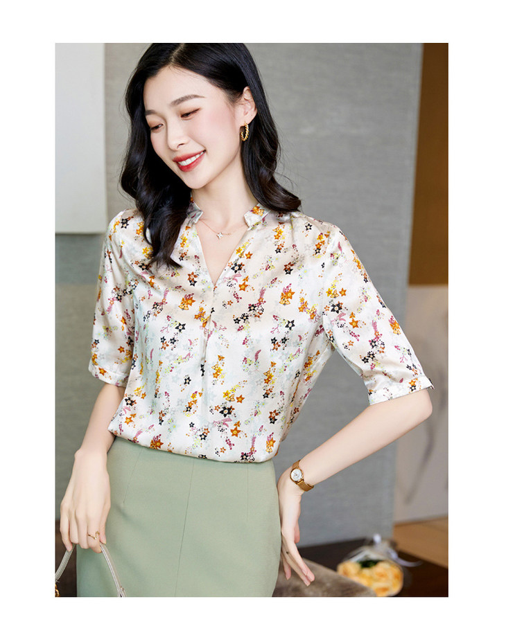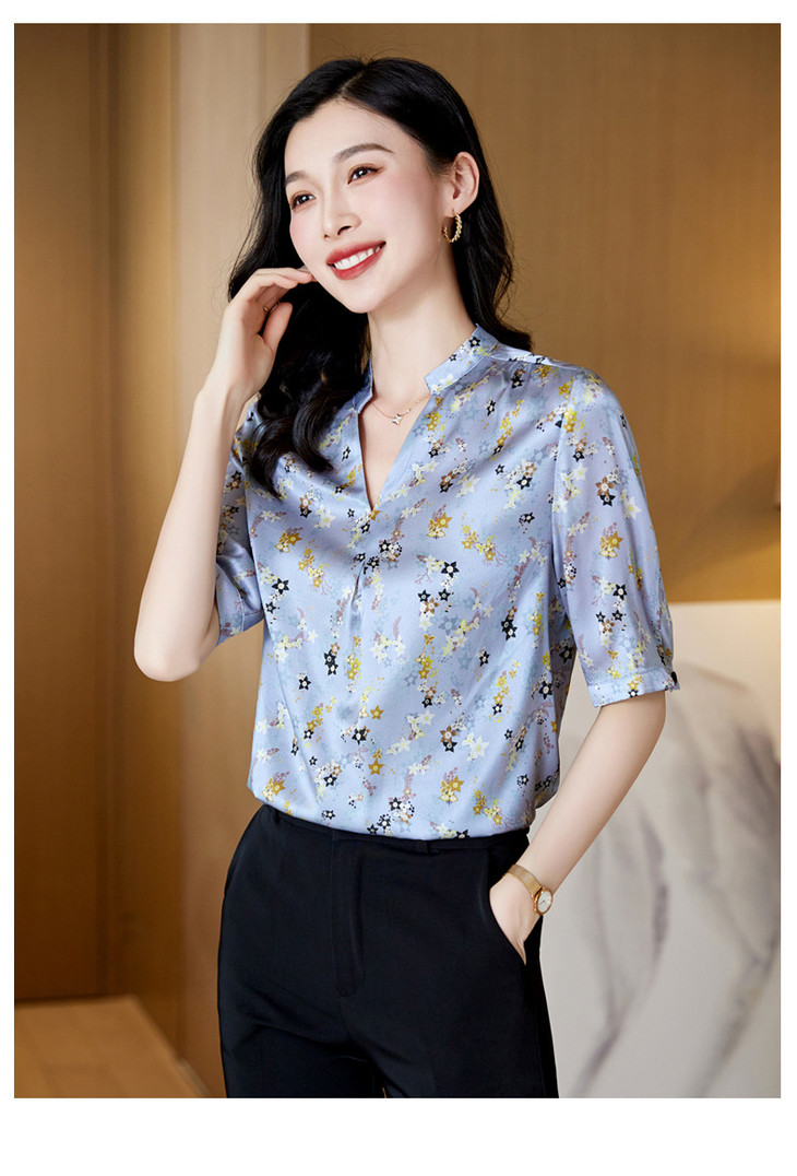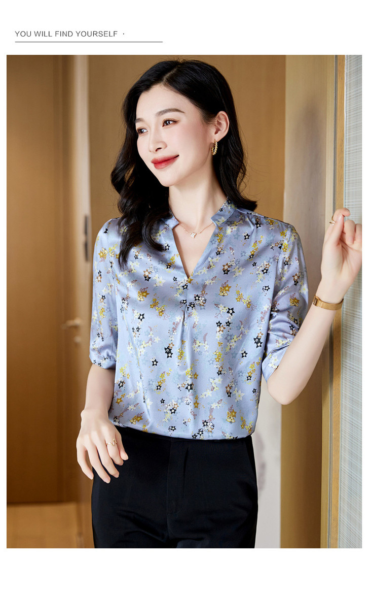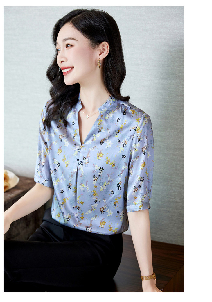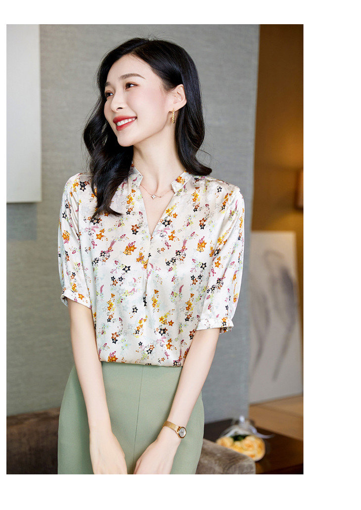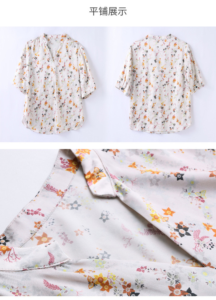 YQ小清新碎花中袖时尚衬衫女夏2024新款气质V领轻熟高端桑蚕丝上衣