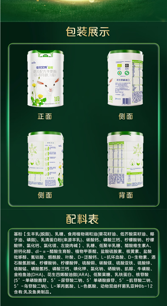 佳贝艾特晶绽有机婴幼儿羊奶粉1段800g