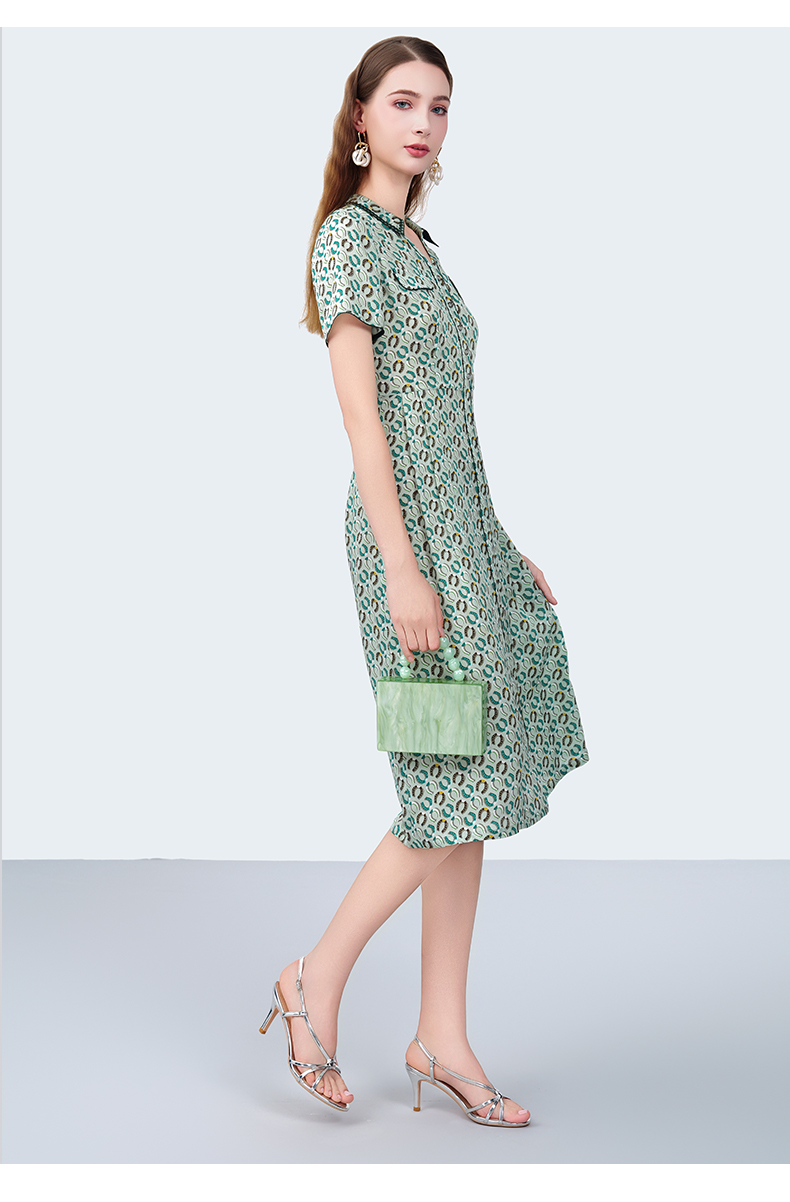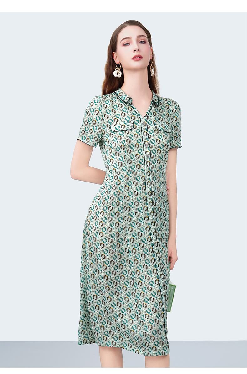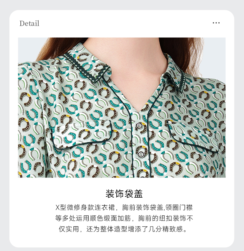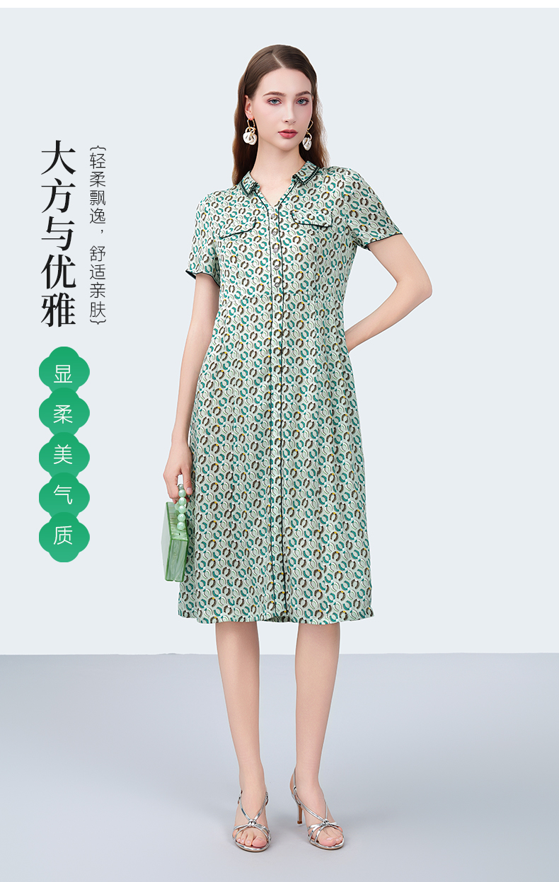 乔万尼新款100%真丝V领修身印花中长款连衣裙ED2E403