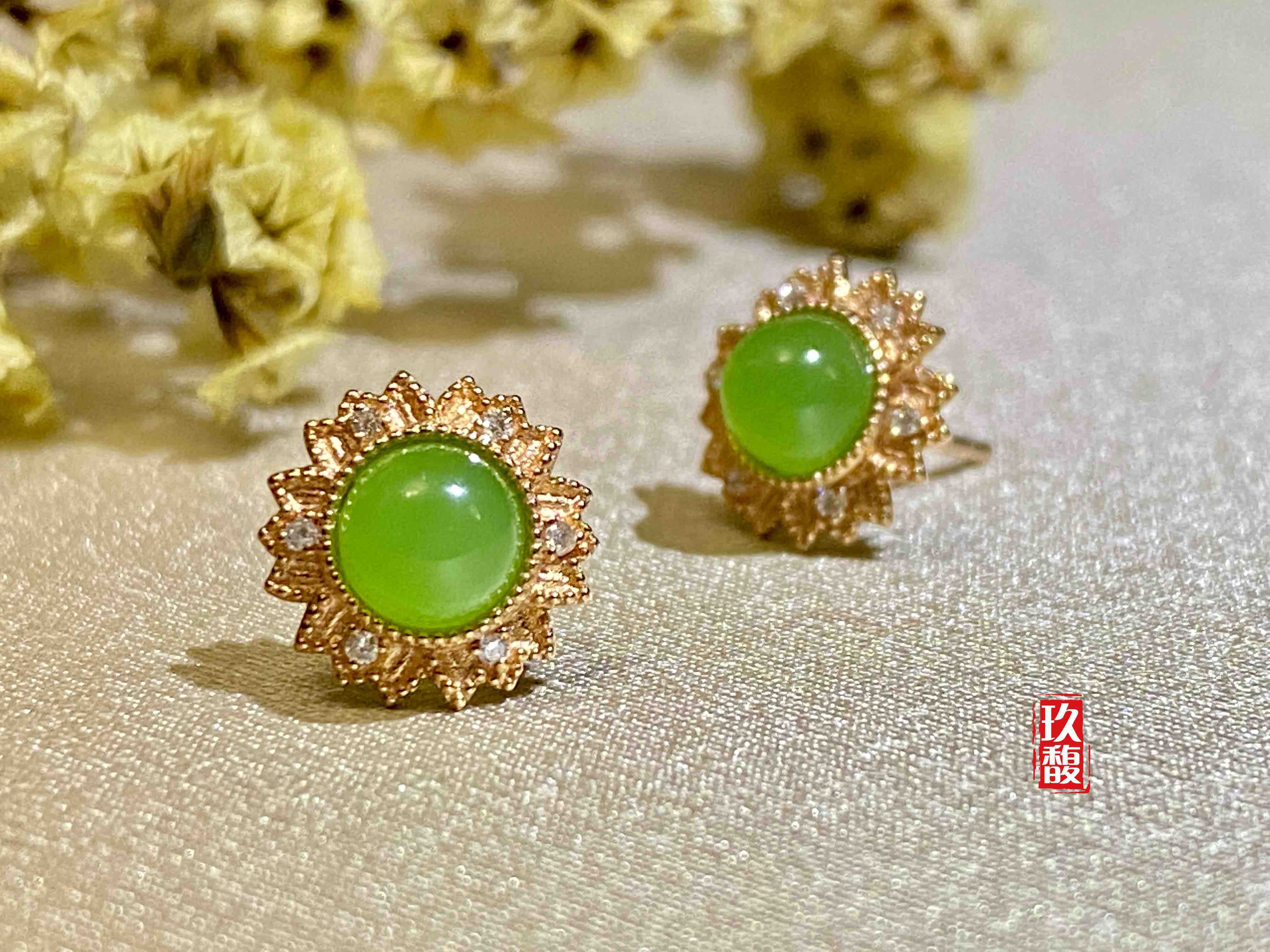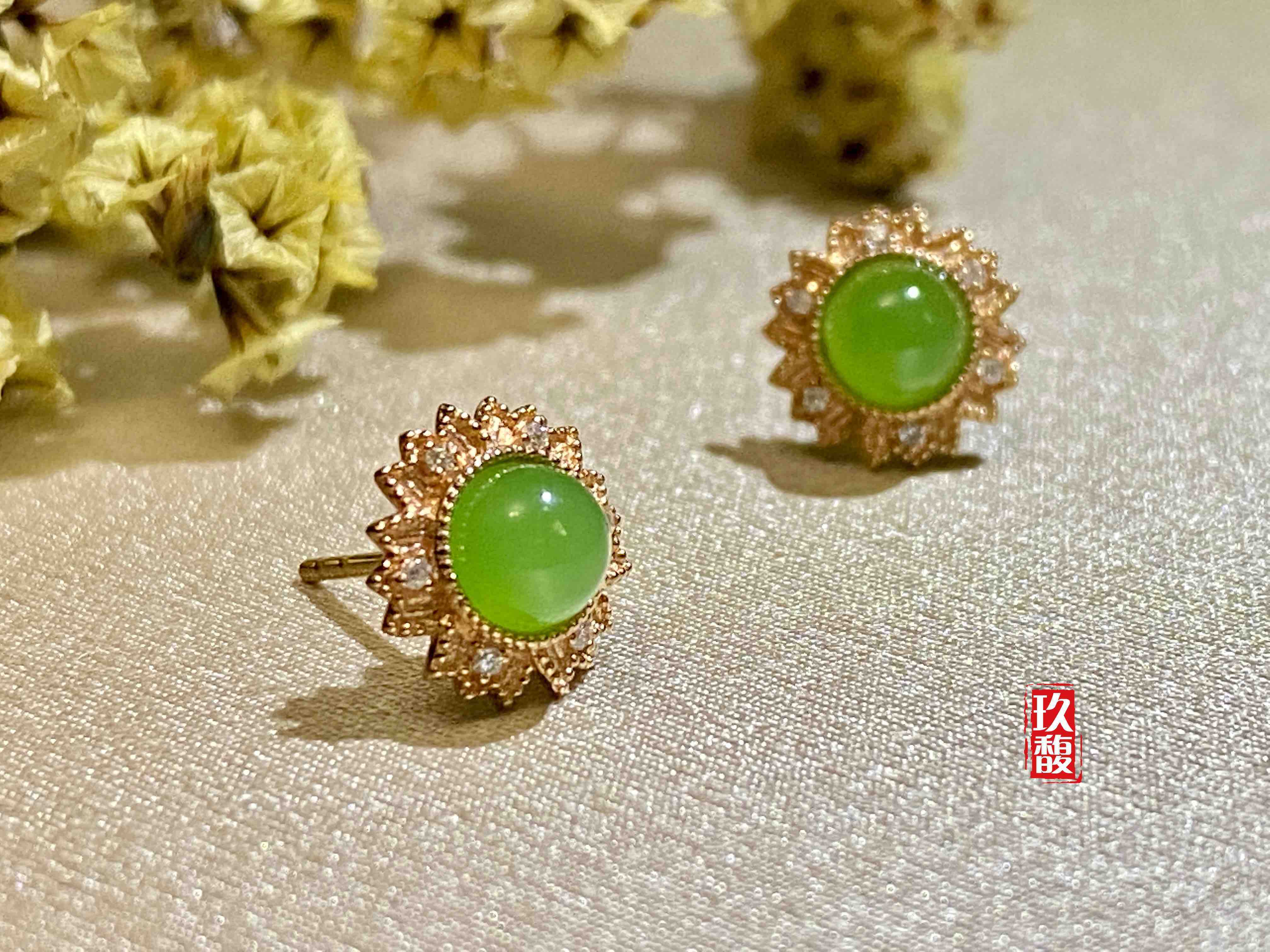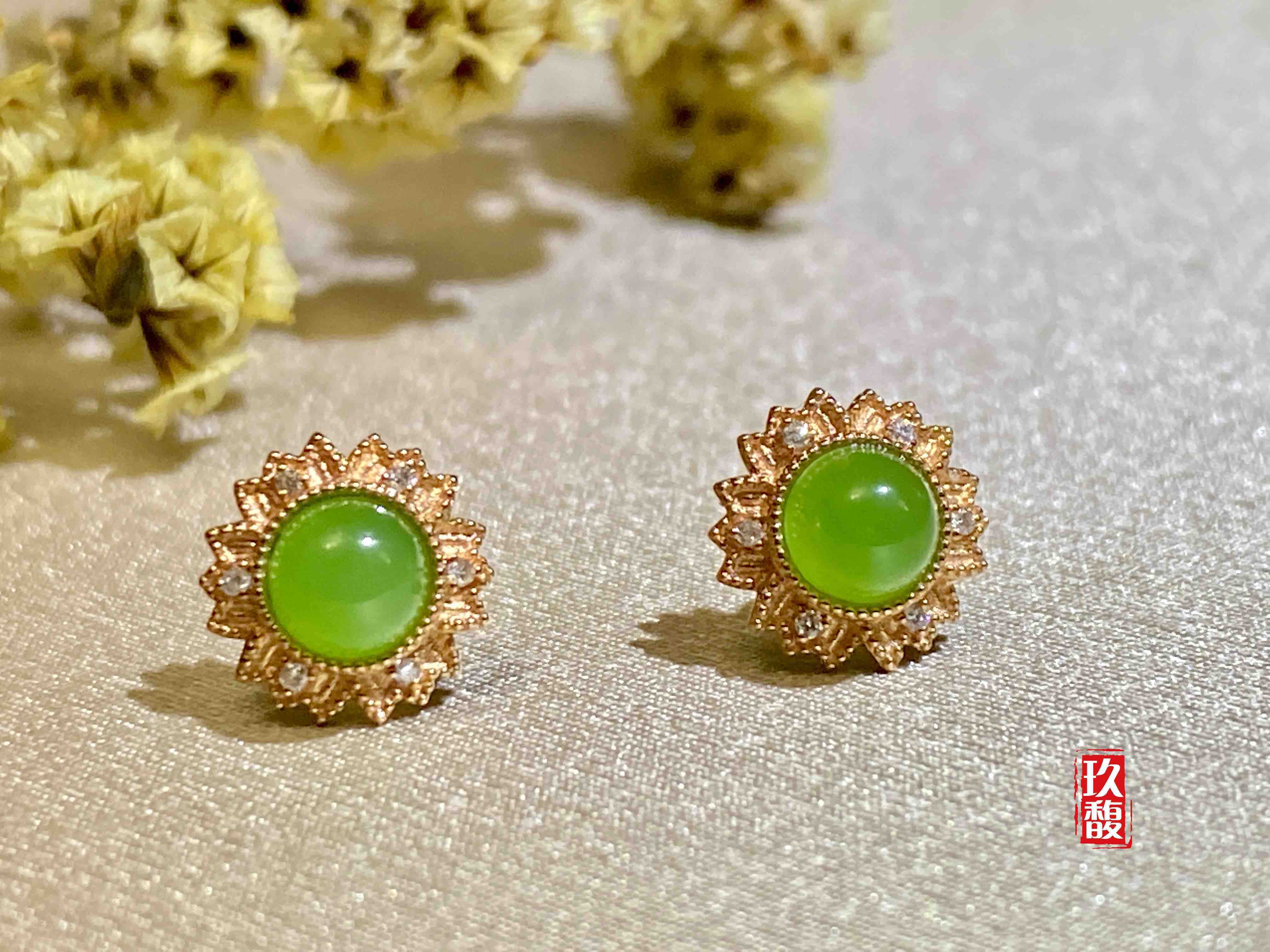 18K玫瑰金和田玉(碧玉)耳饰