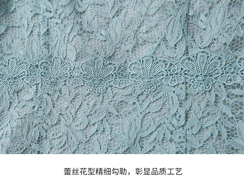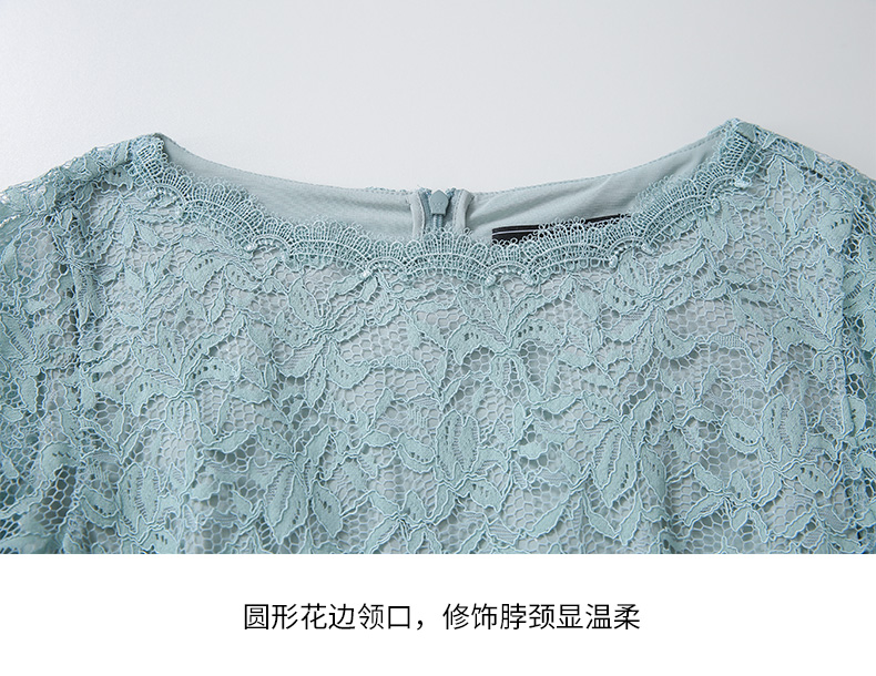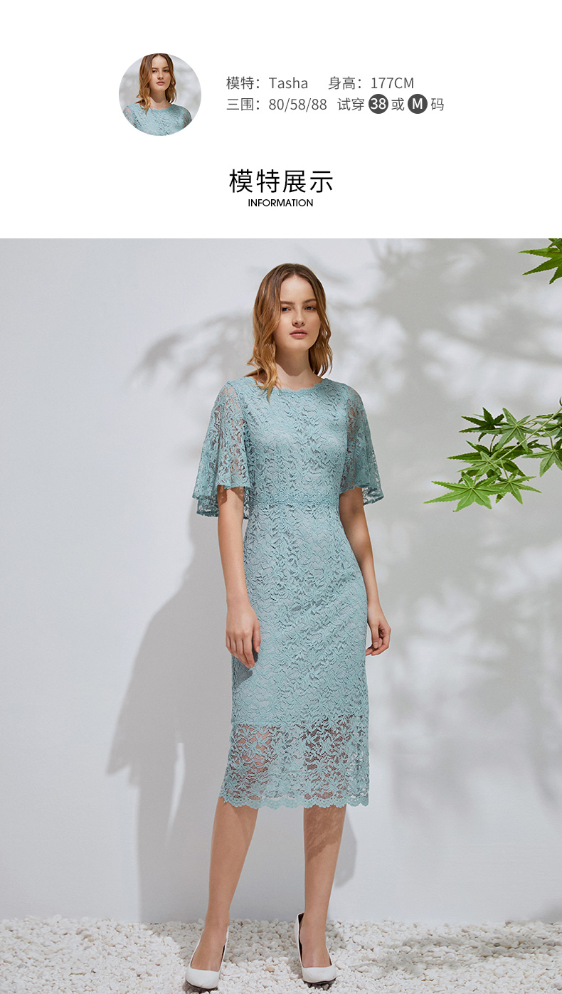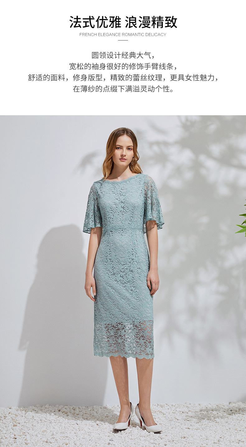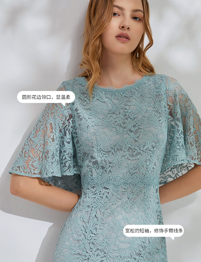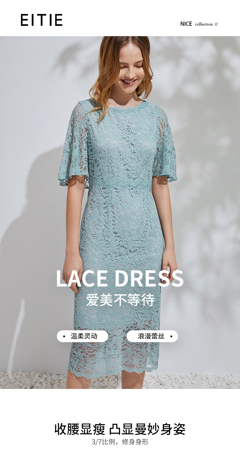EITIE爱特爱新款优雅气质镂空蕾丝收腰A字喇叭袖连衣裙女A2007411