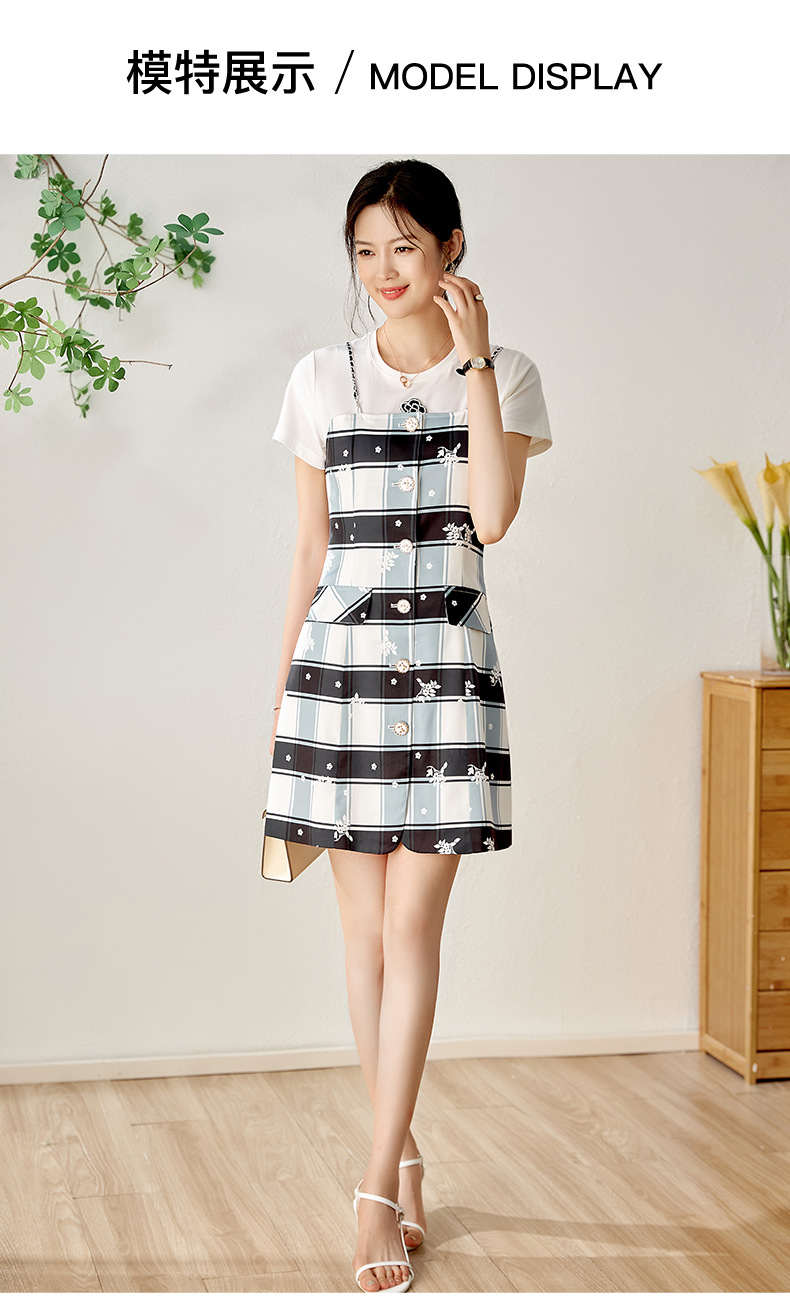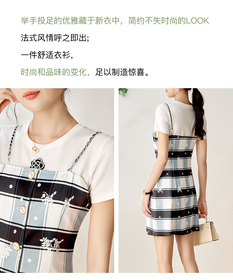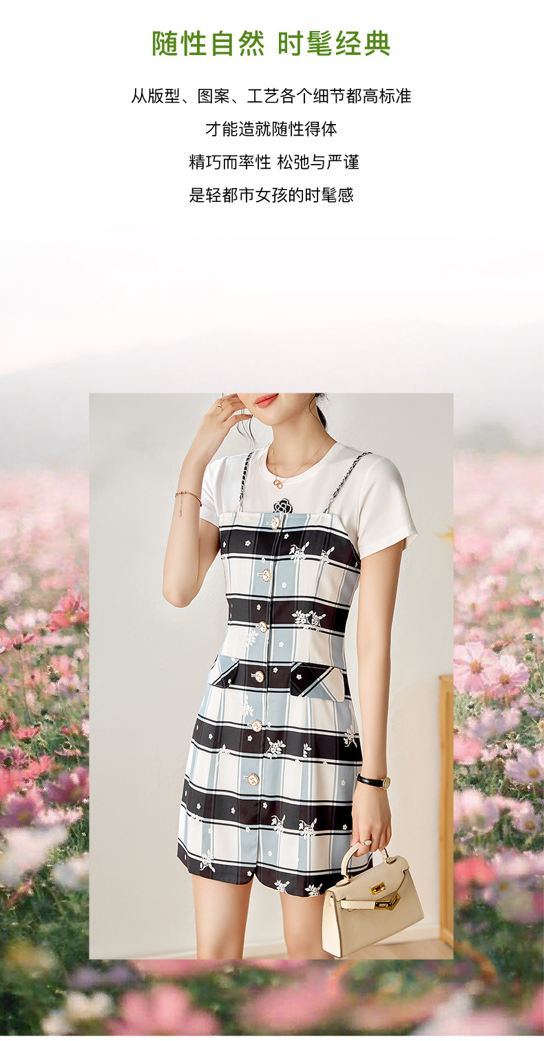 小香风山茶花,钉珠短袖+撞色格纹金属单排扣吊带裙两件套WLZD-2306504