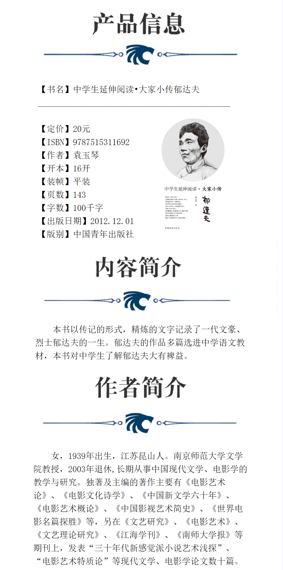 中学生延伸阅读•大家小传 郁达夫 袁玉琴著 中国青年出版社