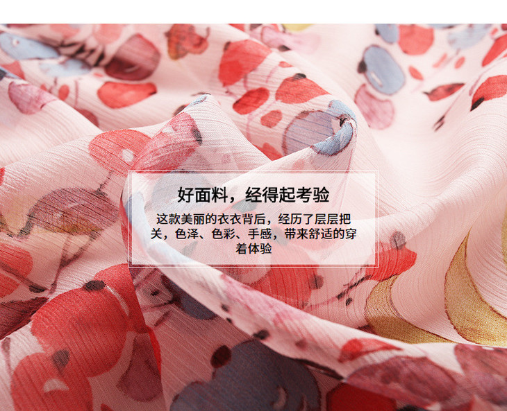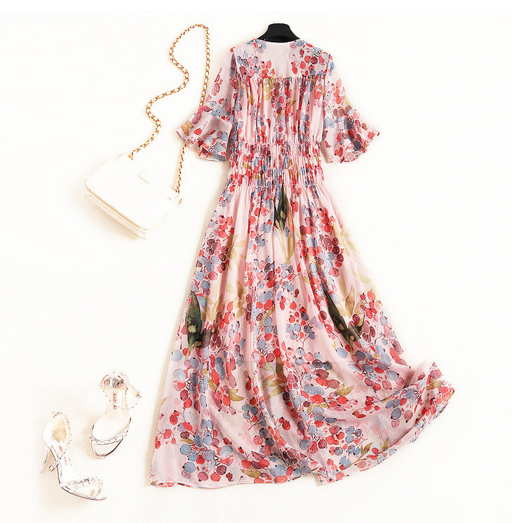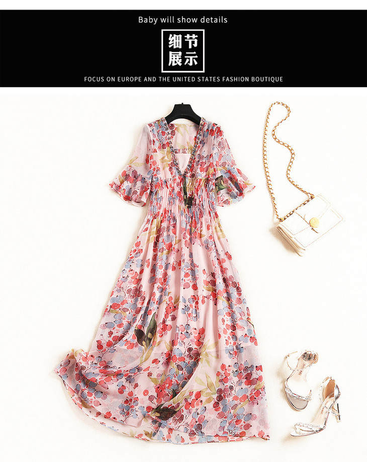 OL-C11436新品V领镶珠荷叶袖松紧显瘦高腰印花雪纺连衣裙TZW