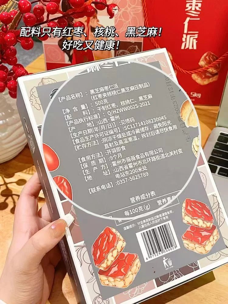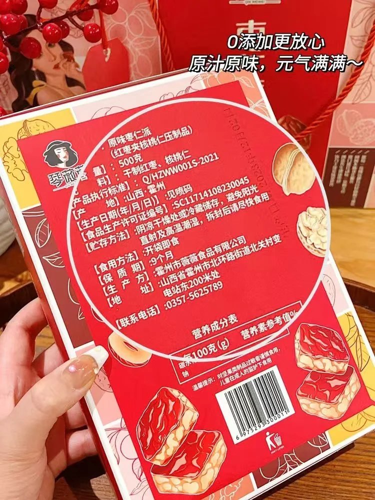 【口感推荐】:原味枣仁派口感有嚼劲,层次感明显,原料新鲜,核桃仁原材料特别足,厚度达到2cm。 【品名】:薇薇枣仁派 【规格】:净重500克/盒 【口味说明】: 1、原味:红枣夹核桃仁压制品(蒸熟大枣 山西古县老树核桃仁) 2、酸甜味:红枣夹核桃仁+山楂条压制品(蒸熟的大枣 山西古县老树核桃仁 无添加山楂条) 3、黑芝麻味:红枣夹核桃仁加炒熟黑芝麻压制品(蒸熟的大枣 山西古县老树核桃仁 炒熟黑芝麻) 【生产日期】:zui新生产日期见喷码 【保质期】:9个月(常温避光处储存,冷藏更佳) 【产地】:山西霍州 【发货地】:山西省临汾市 【快递说明】:中通快递 【发货时间】:接单之后48小时内发货 【发货区域】:新疆、西藏不发货 【售后标准 】 枣仁派基本无售后,偶尔有漏气不影响食用。质量问题请于24小时内联系客服