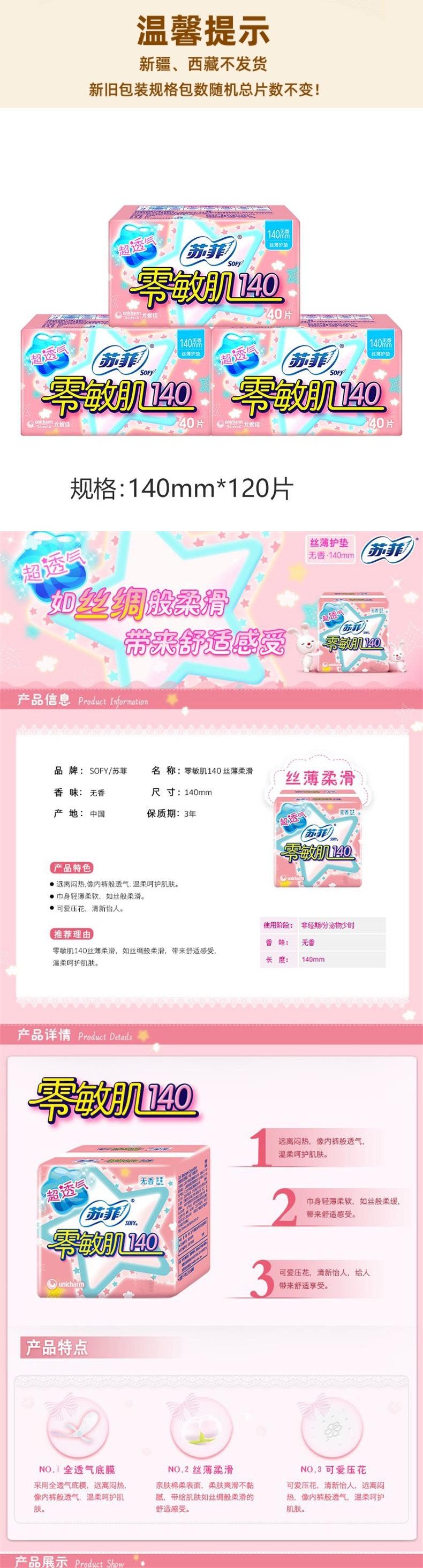 苏菲 零敏肌无香型护垫卫生巾140mm40片*3包 SFOJM40P3B