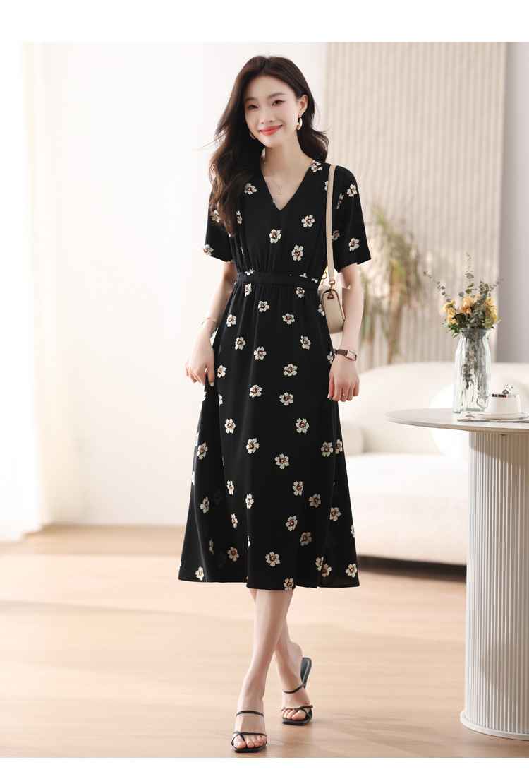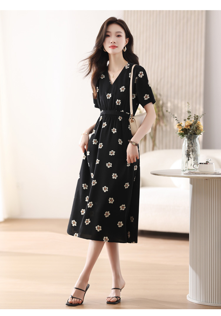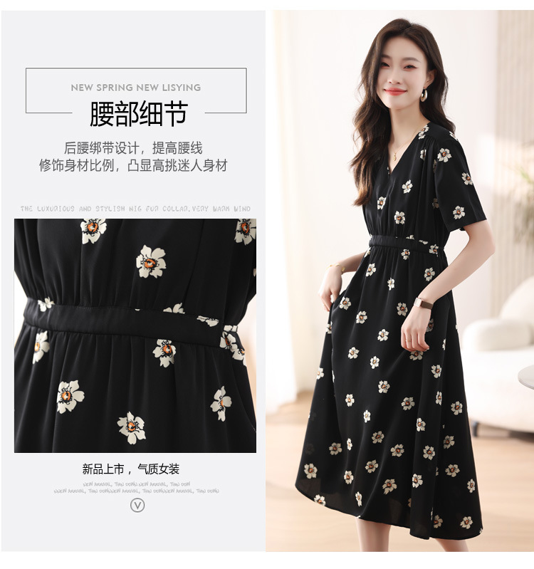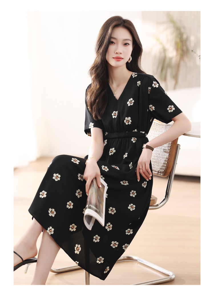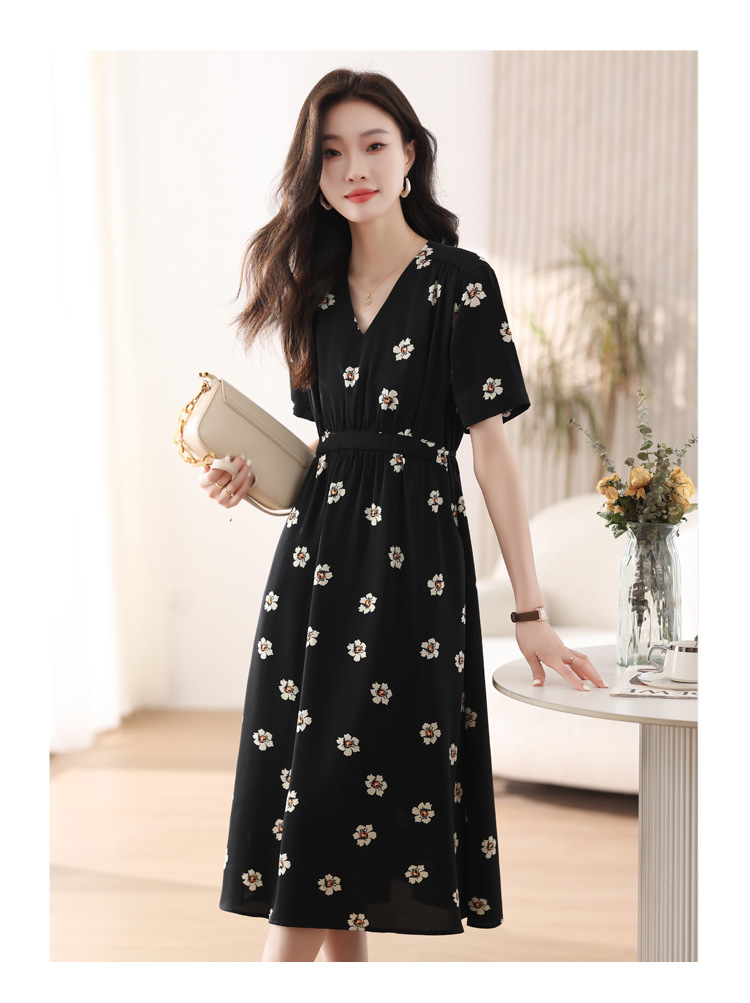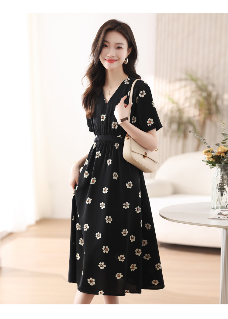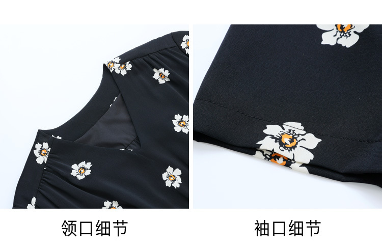 雀说 雪纺碎花v领连衣裙新款夏季女装收腰显瘦裙子气质黑色a字裙5ZF-9062