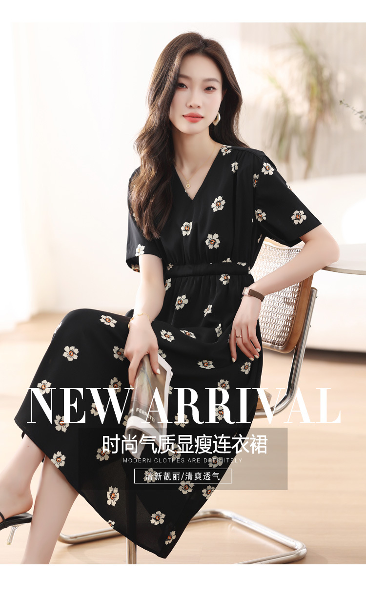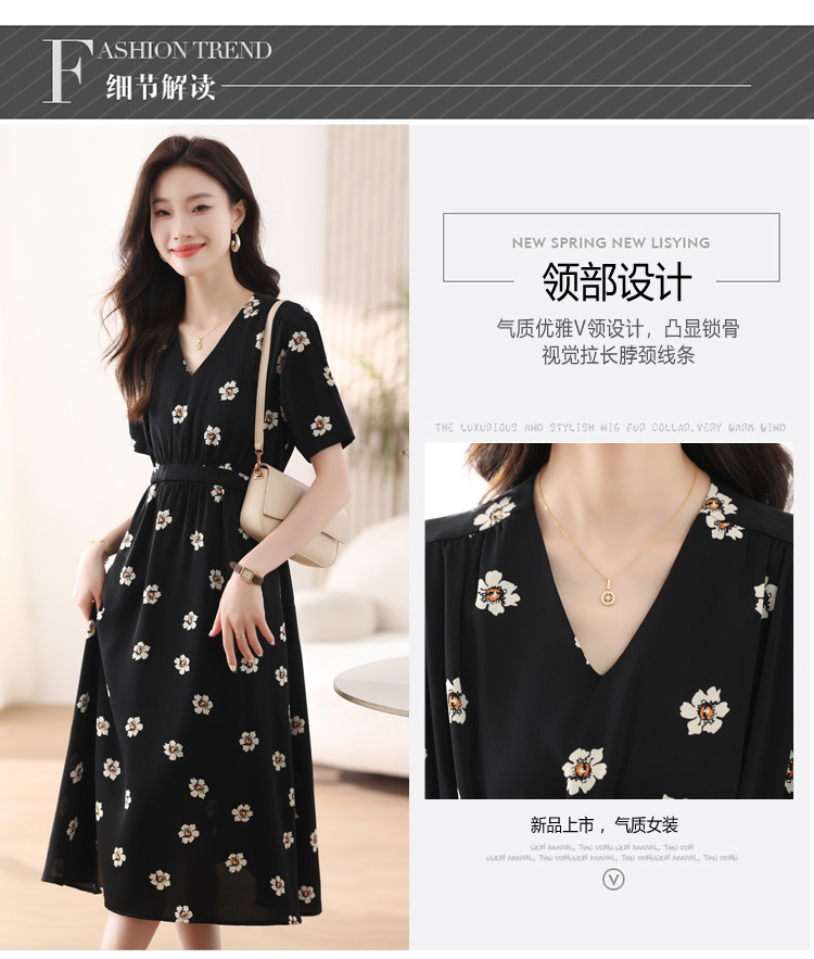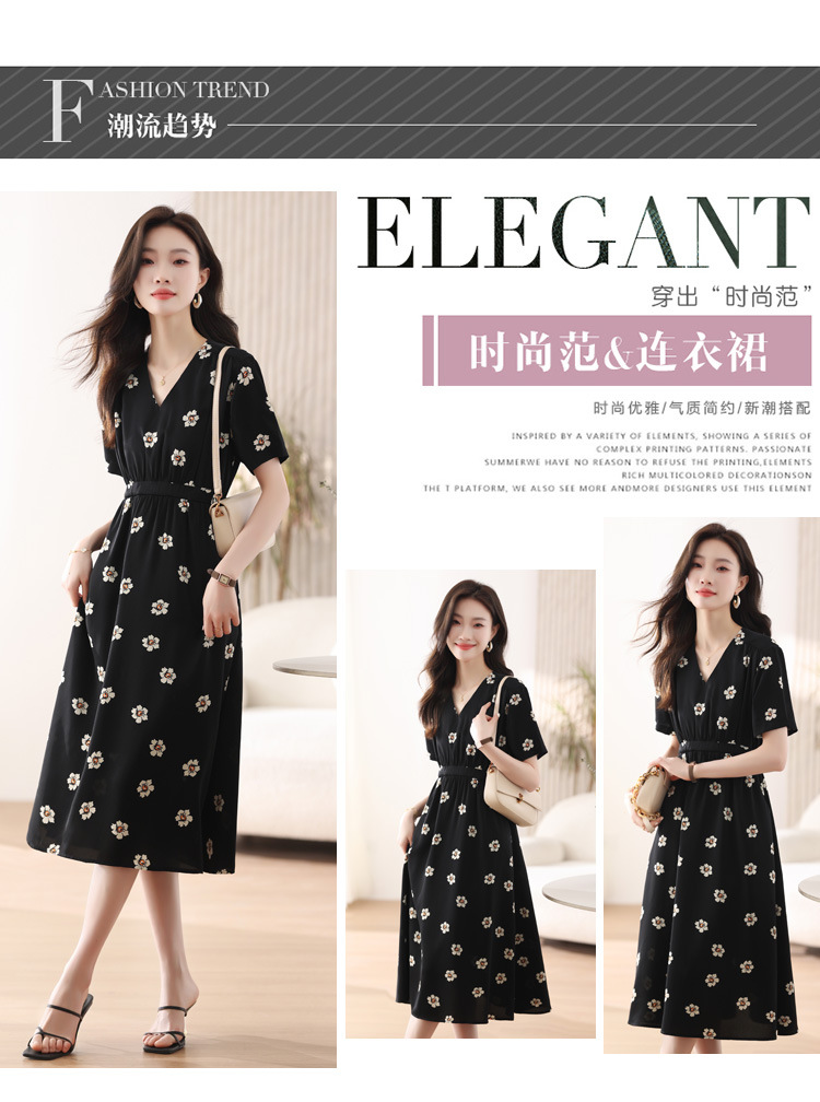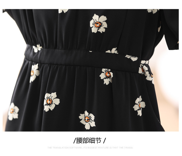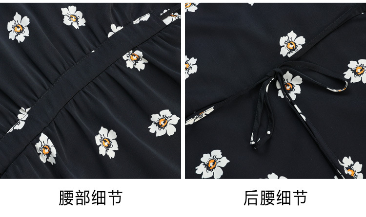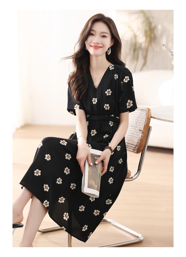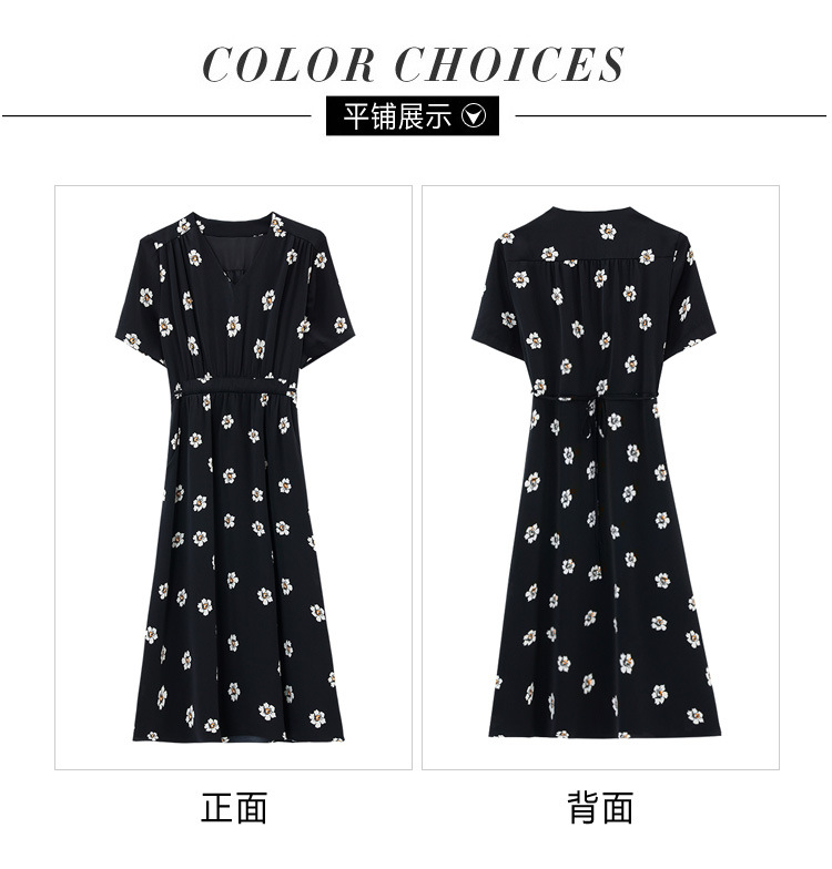雀说 雪纺碎花v领连衣裙新款夏季女装收腰显瘦裙子气质黑色a字裙5ZF-9062