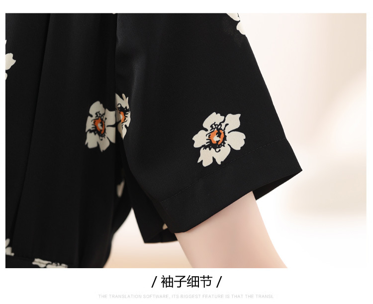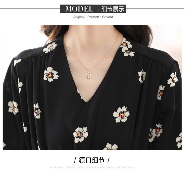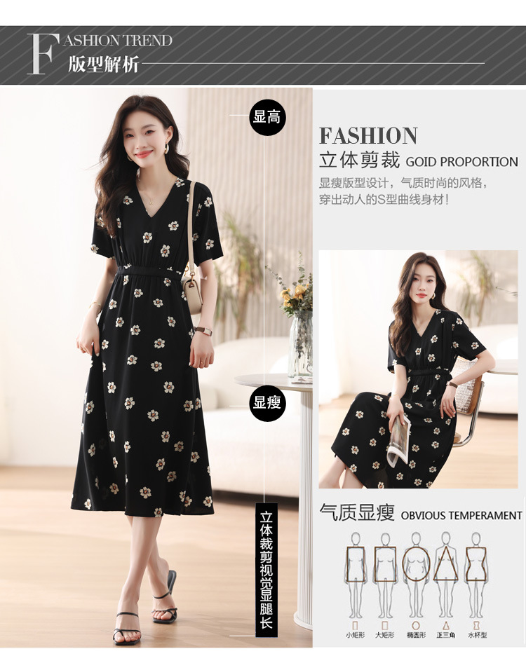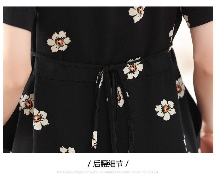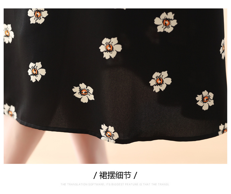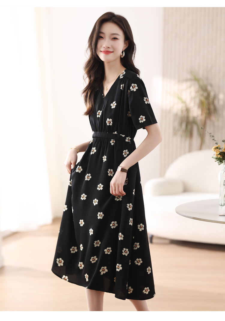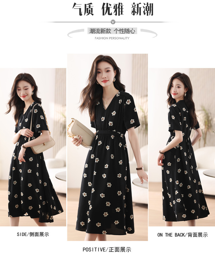雀说 雪纺碎花v领连衣裙新款夏季女装收腰显瘦裙子气质黑色a字裙5ZF-9062