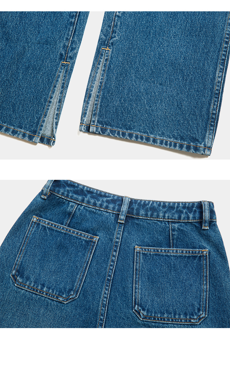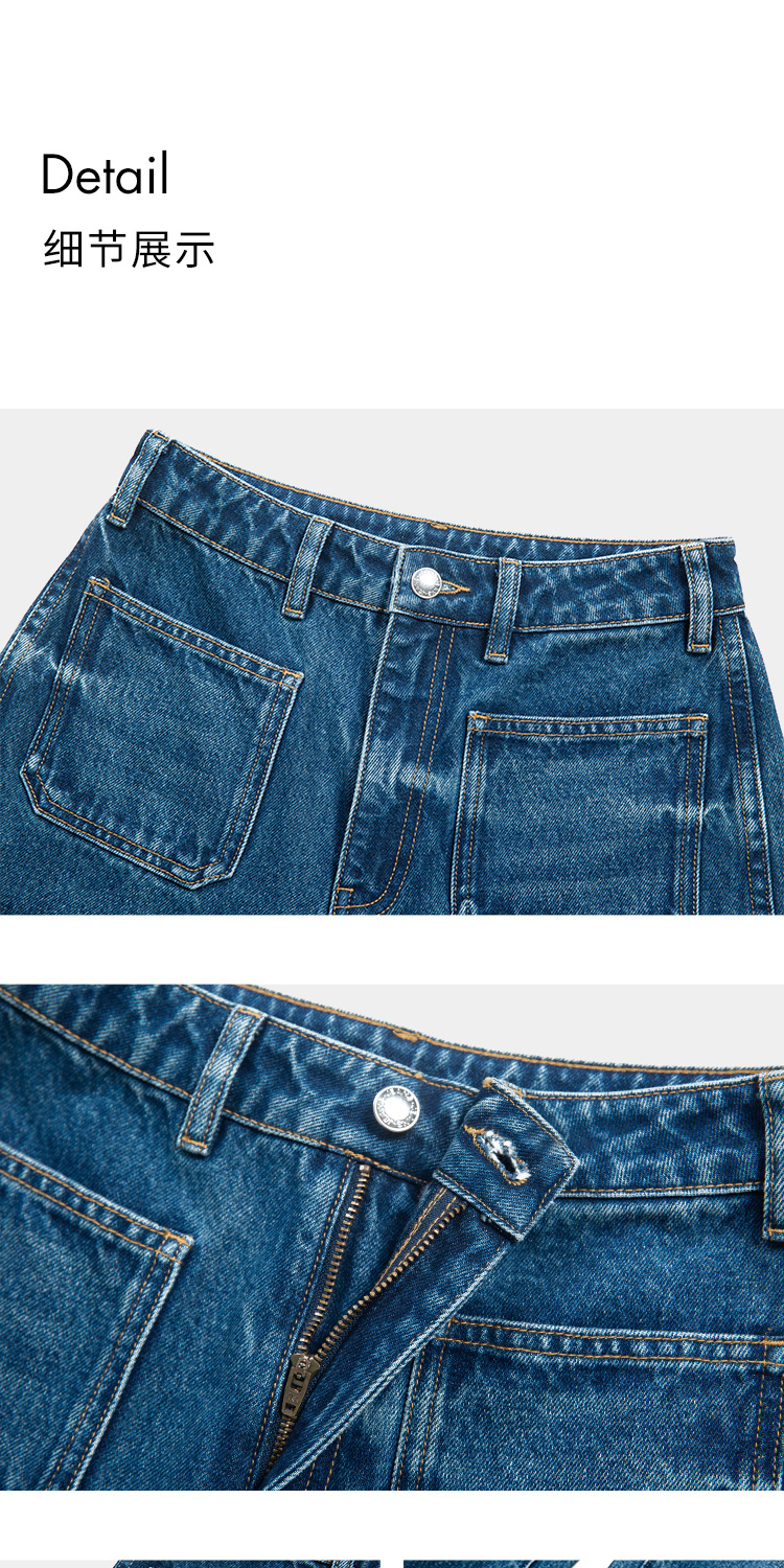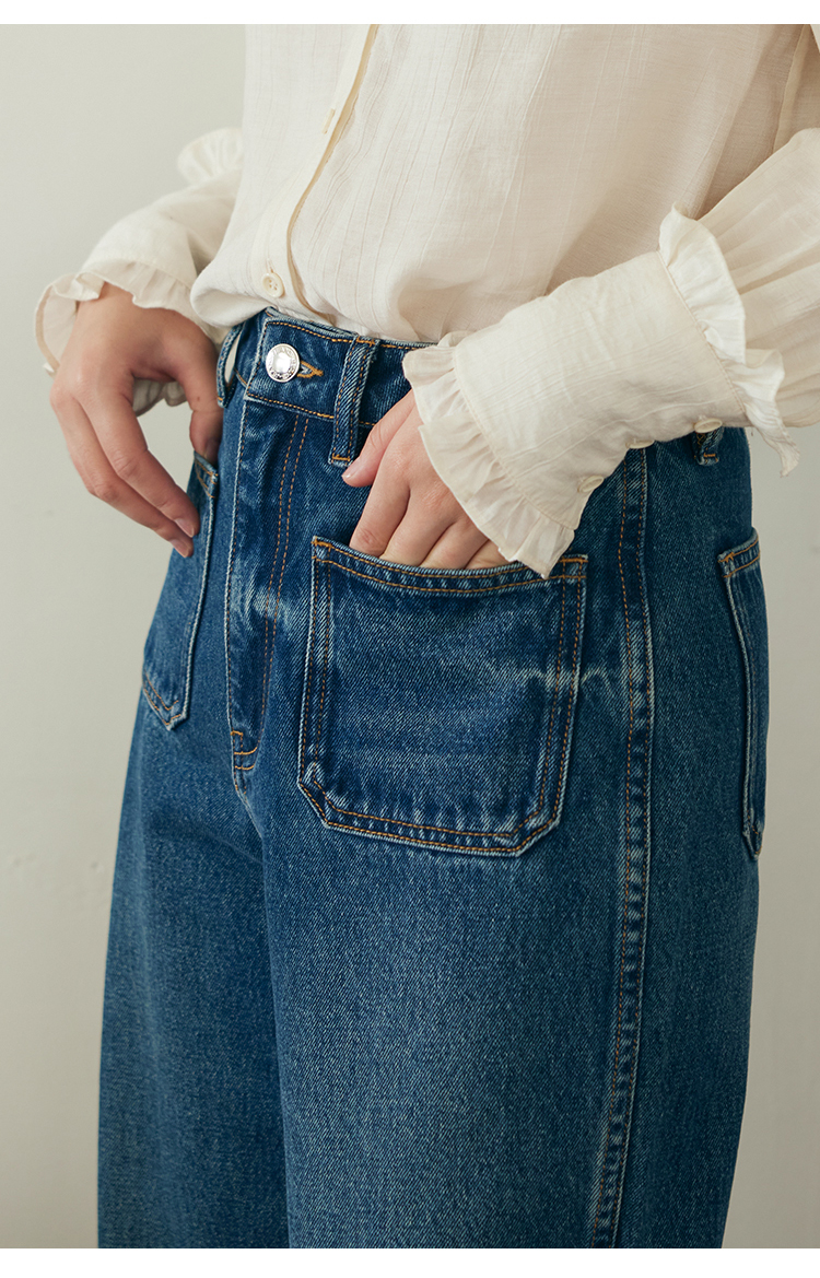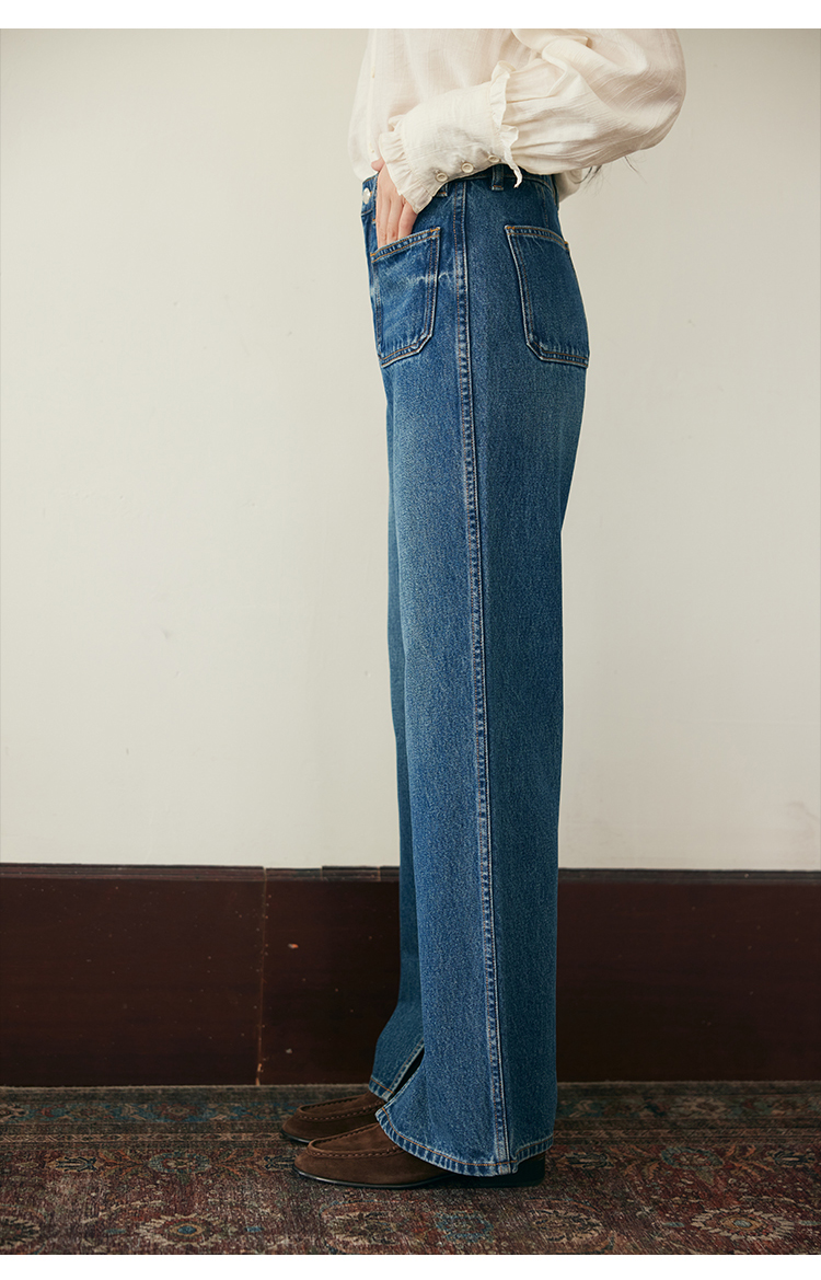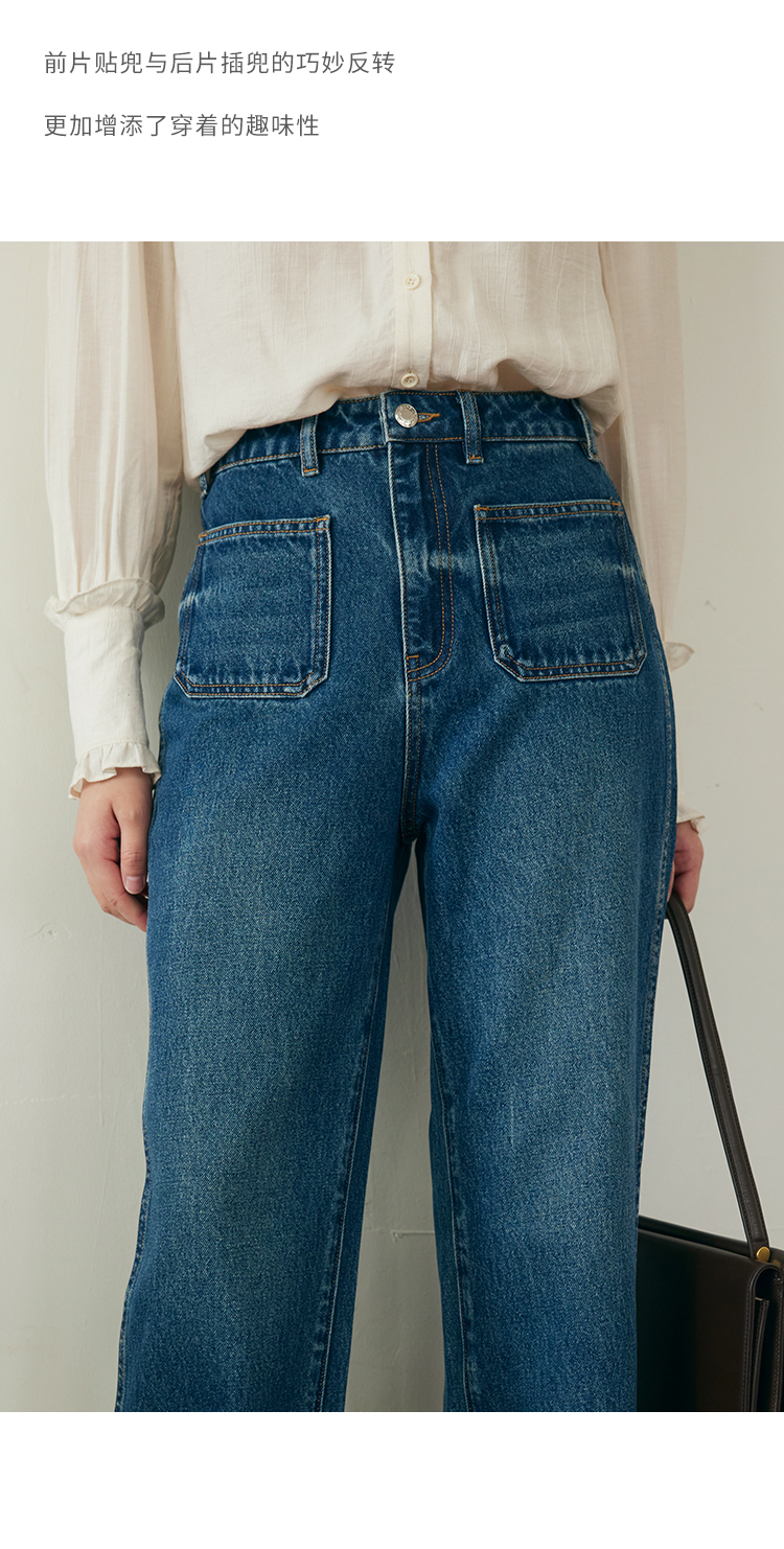 (小眠专属)HeyDress复古双口袋牛仔裤女秋冬宽松高腰阔腿微喇裤深蓝色裤子