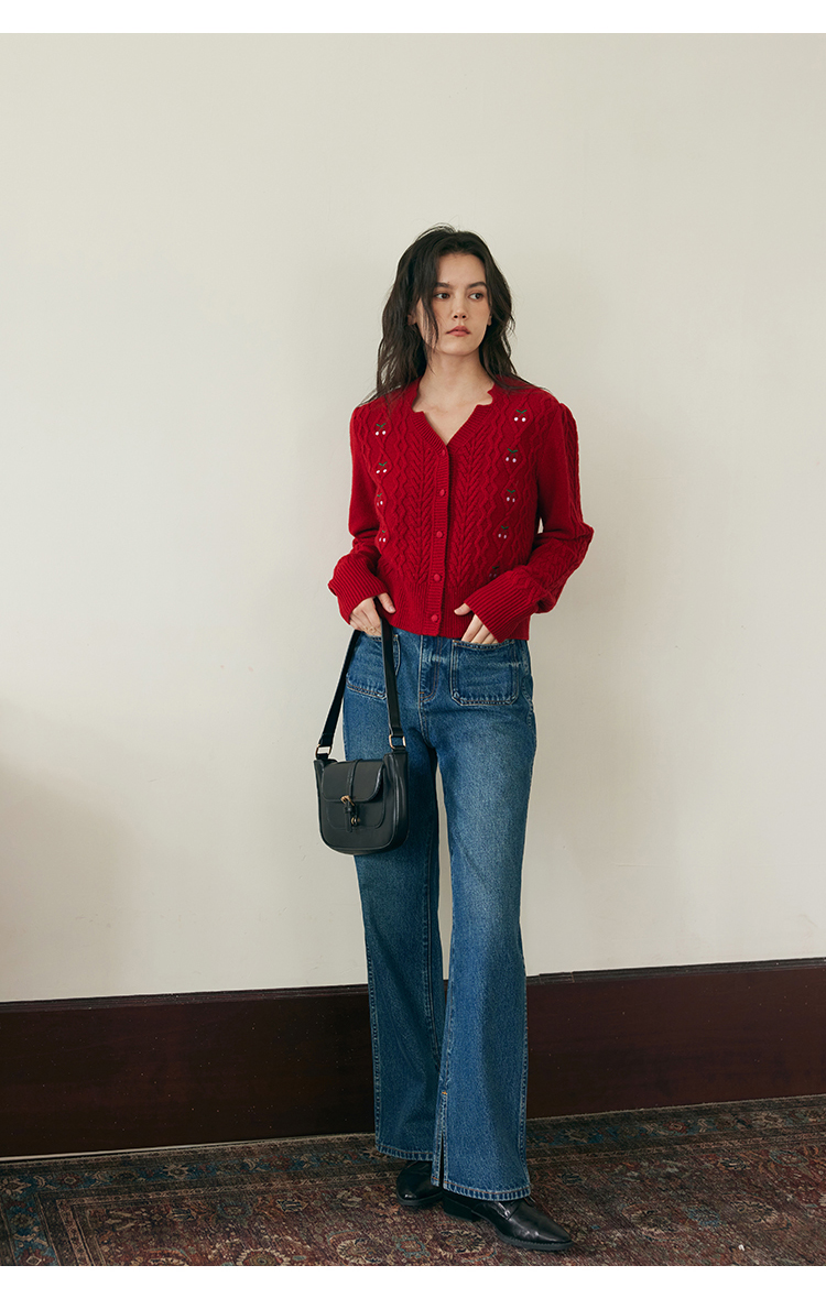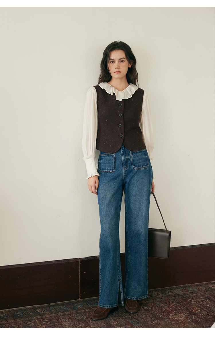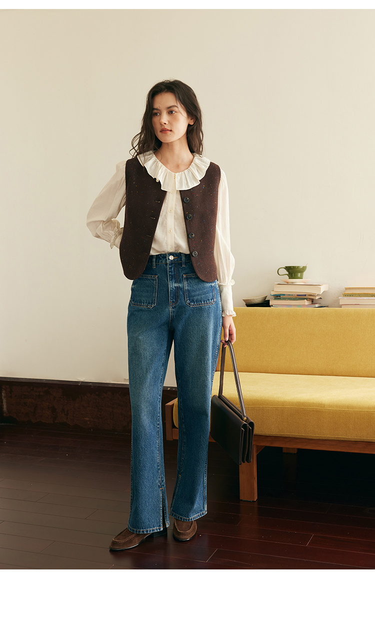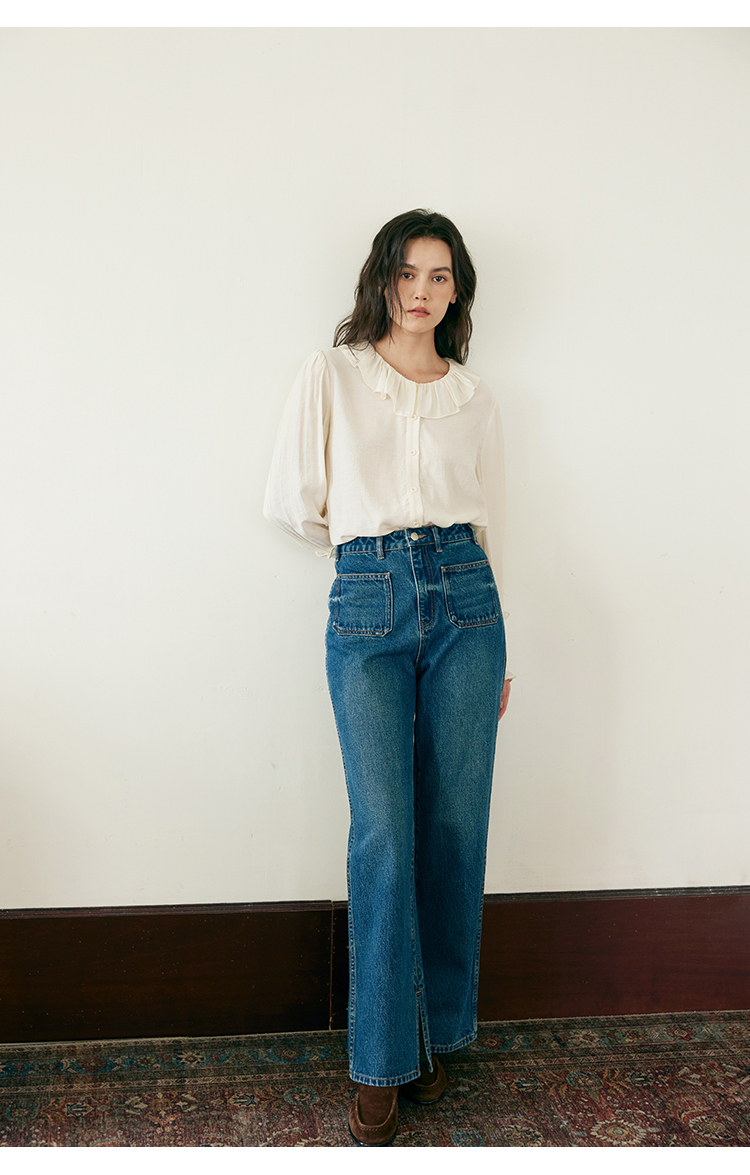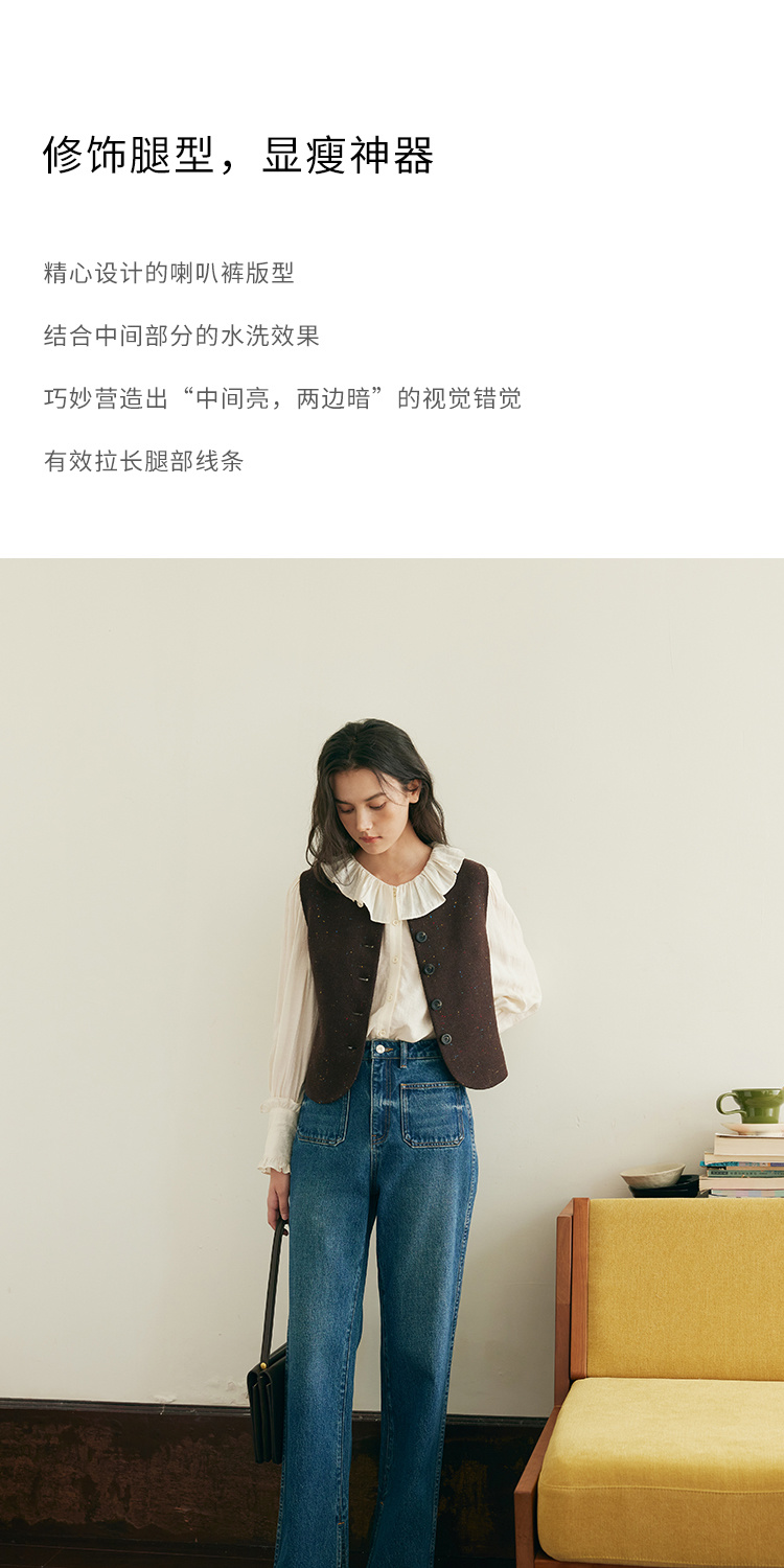 (小眠专属)HeyDress复古双口袋牛仔裤女秋冬宽松高腰阔腿微喇裤深蓝色裤子
