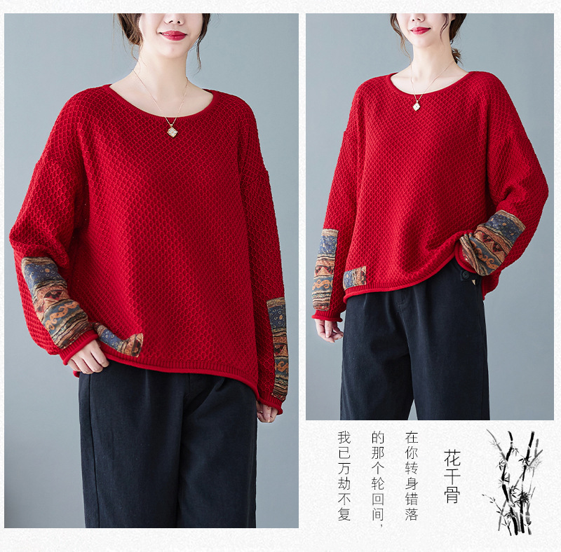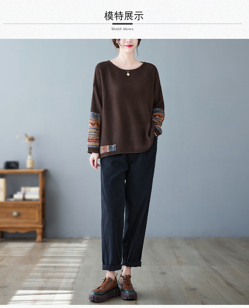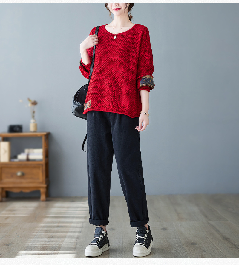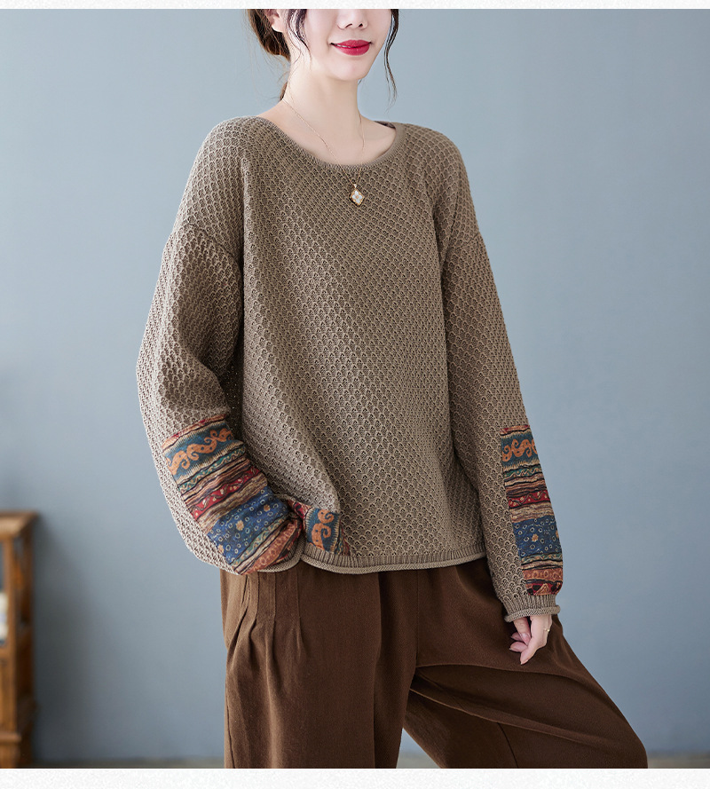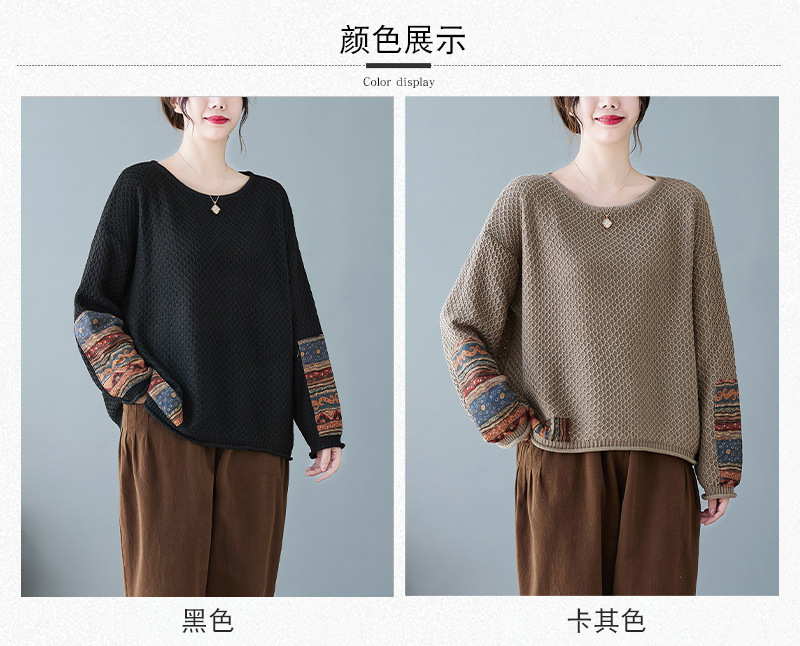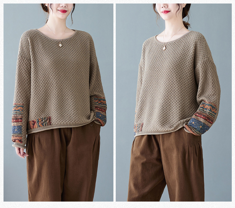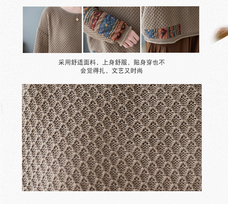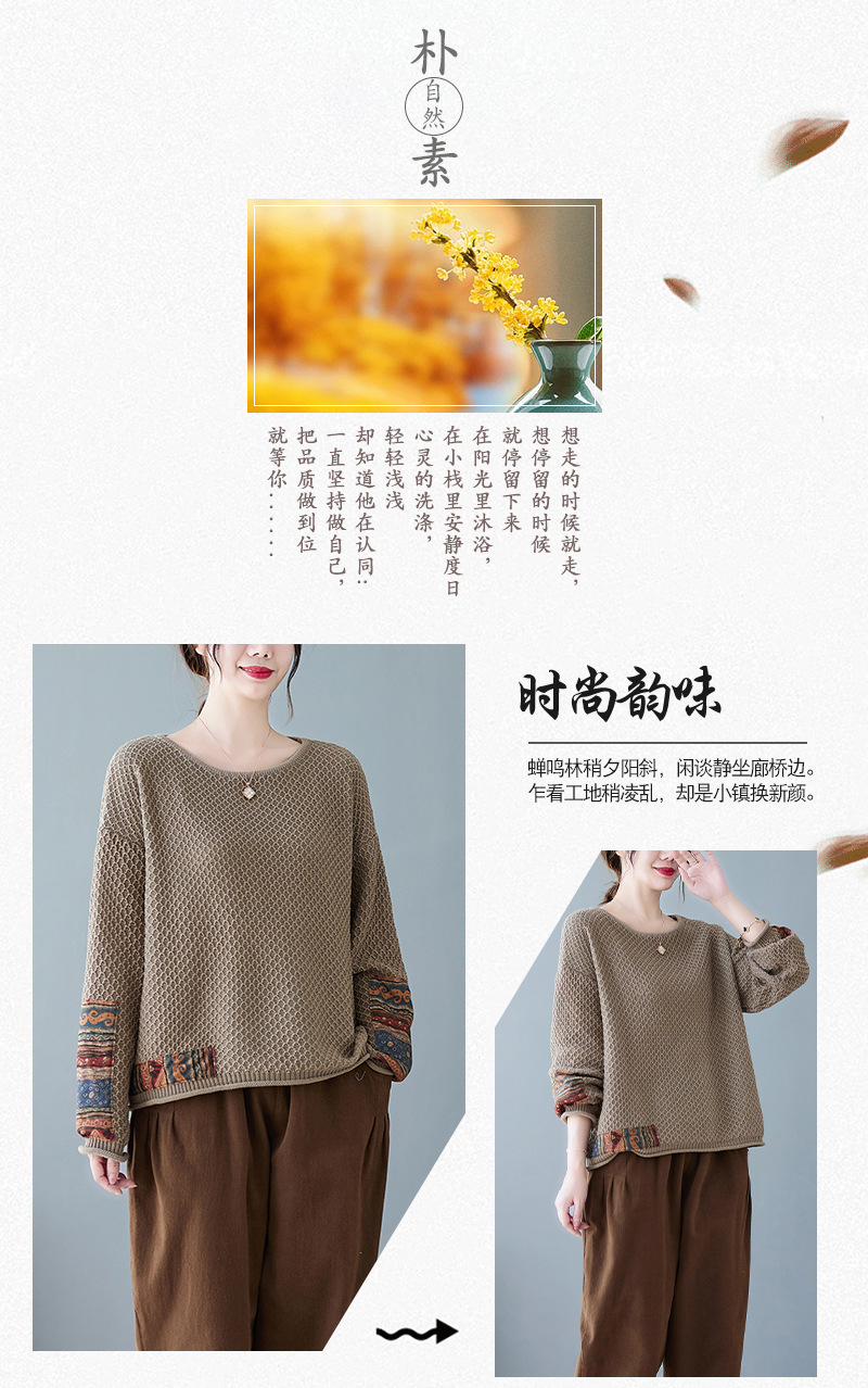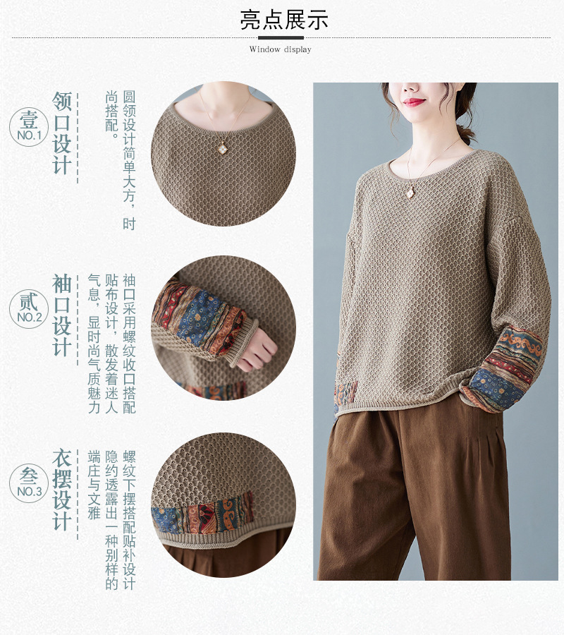 GYH 8528复古民族风贴布棉线针织毛衣圆领套头