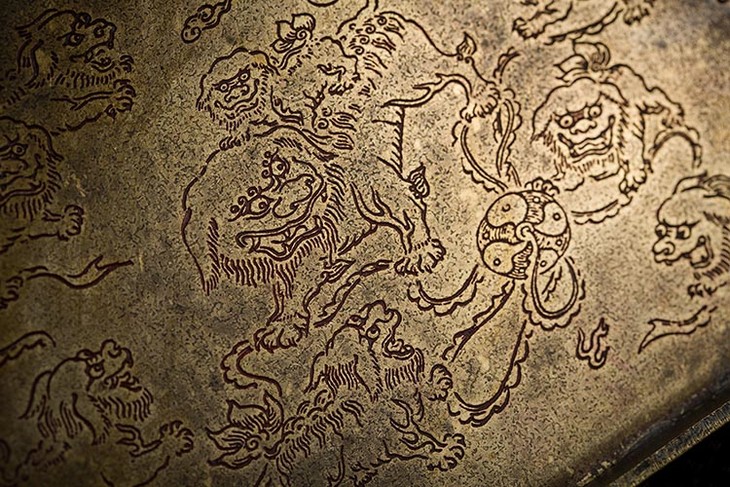 线条细腻繁复,填以朱漆,鲜艳明丽,