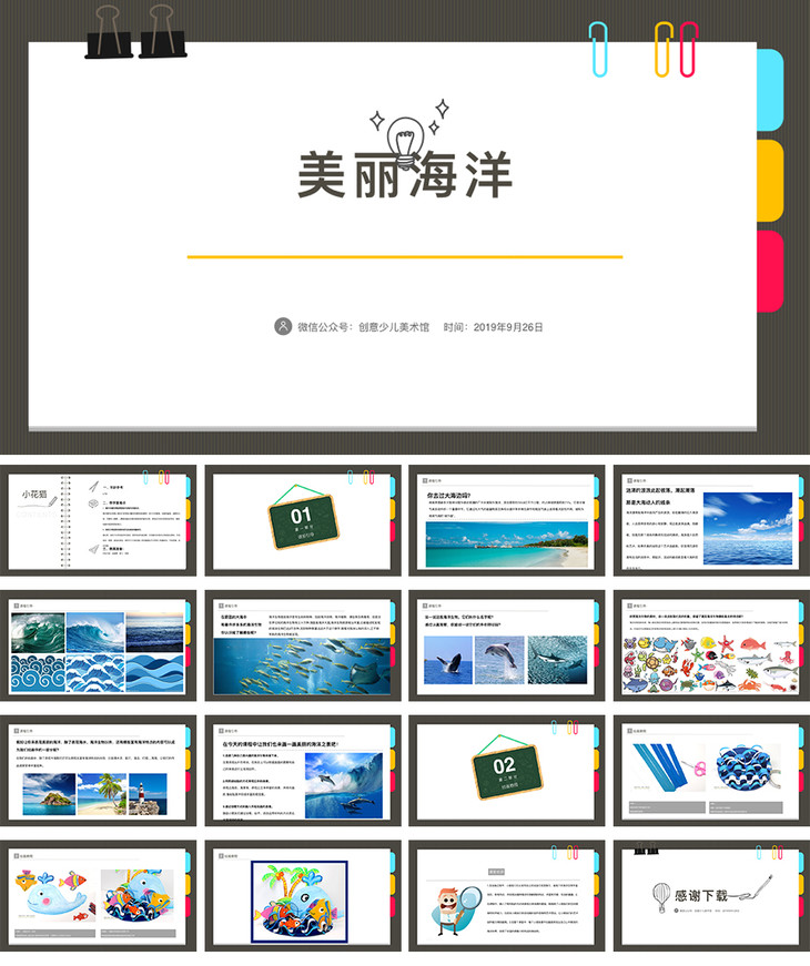 海洋里的生物是小朋友们非常感兴趣和热爱表现的题材,有大大的鲸鱼、凶猛的鲨鱼、温柔的水母、可爱的小鱼群......勇敢地画出你喜欢或熟悉的海洋生物,表现出它的外形和色彩特点,锻炼绘画中造型和色彩能力。