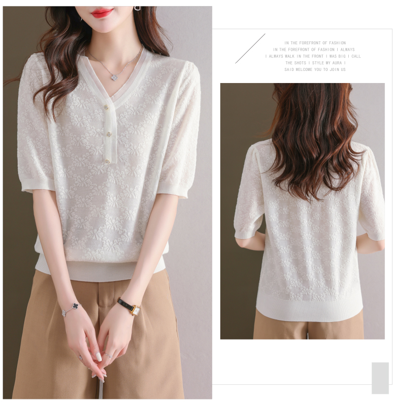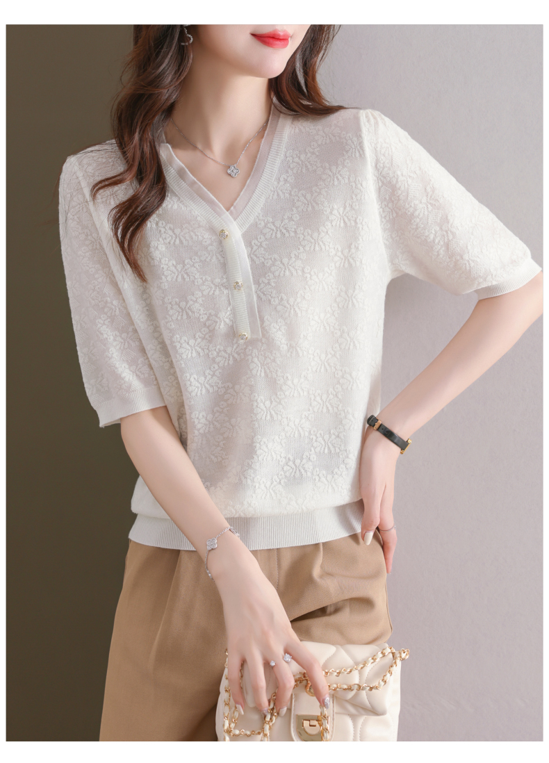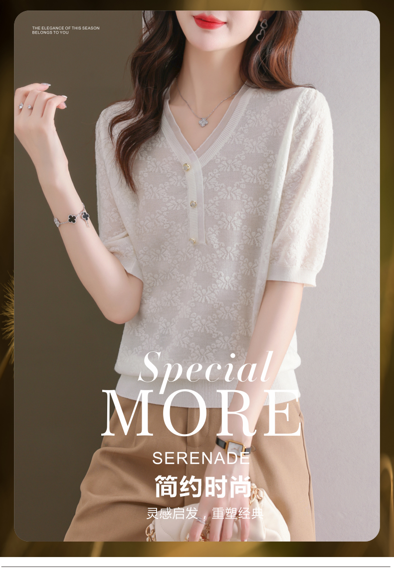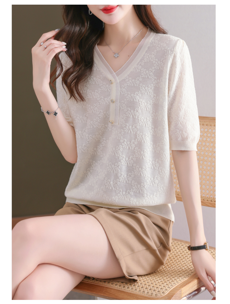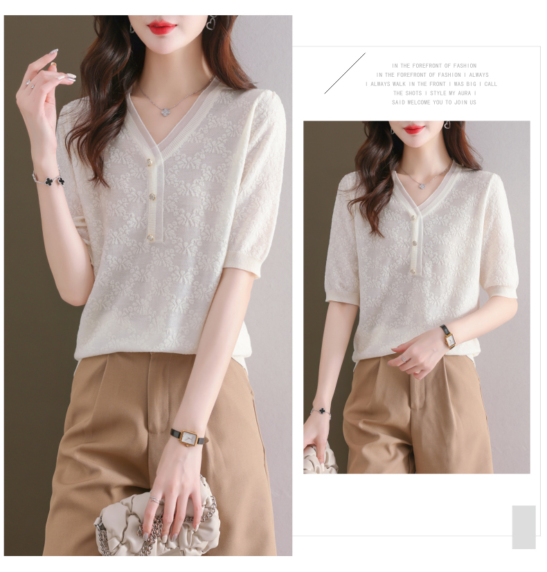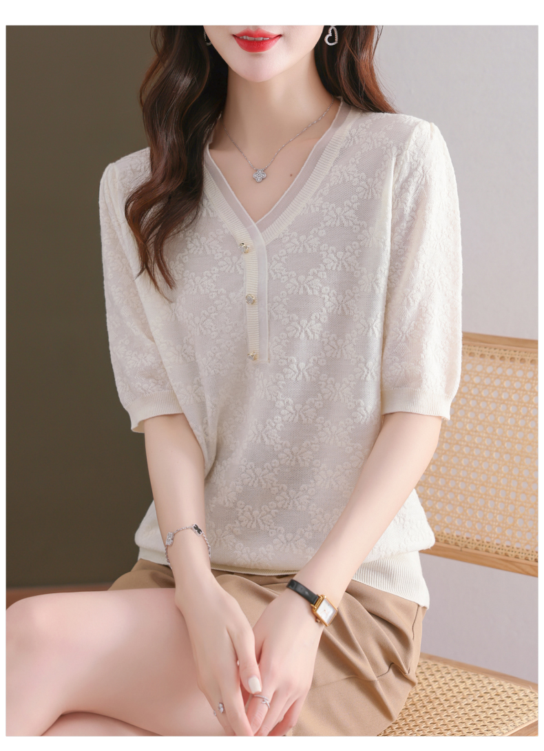 年轻妈妈夏装含桑蚕丝薄款针织衫蕾丝上衣CC-23073