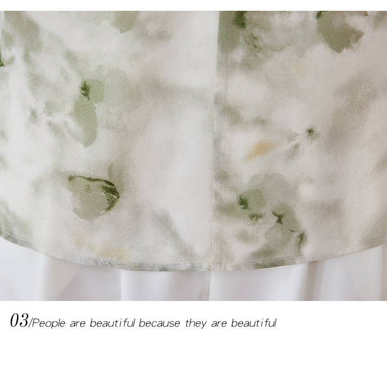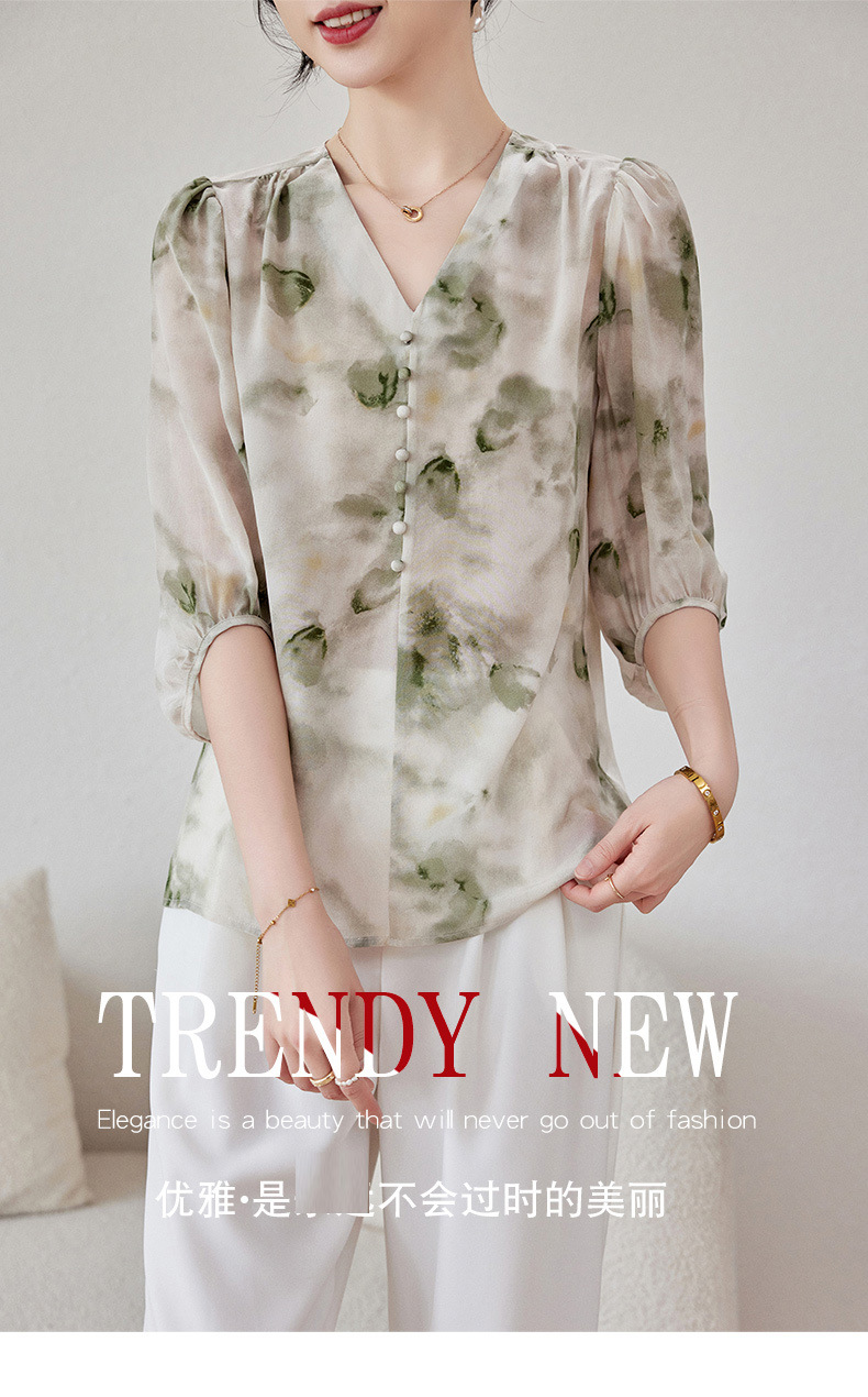 渲染水墨印花真丝,双绉V领五分袖素雅上衣KQN-11256