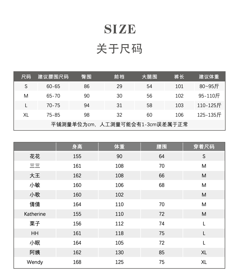 裤子是微宽松版型,卡码不用拍大,例如:介于M与L之间,可拍M!