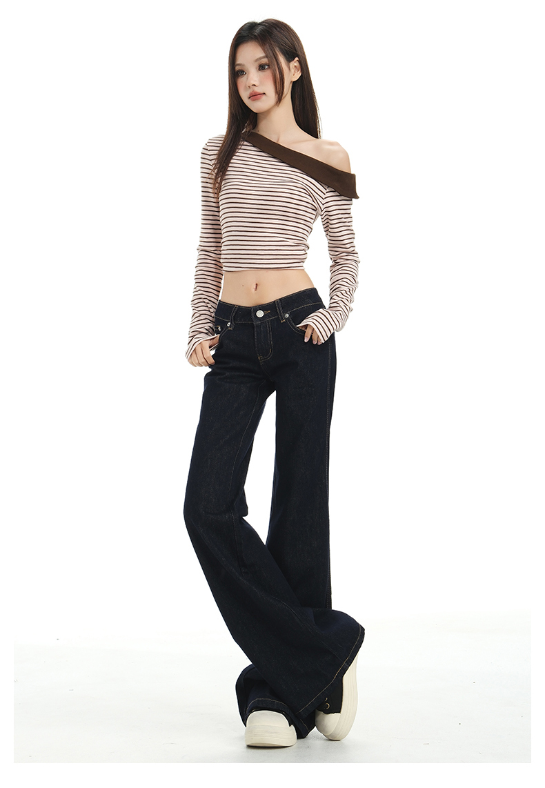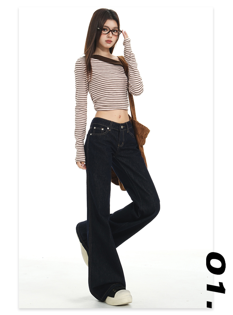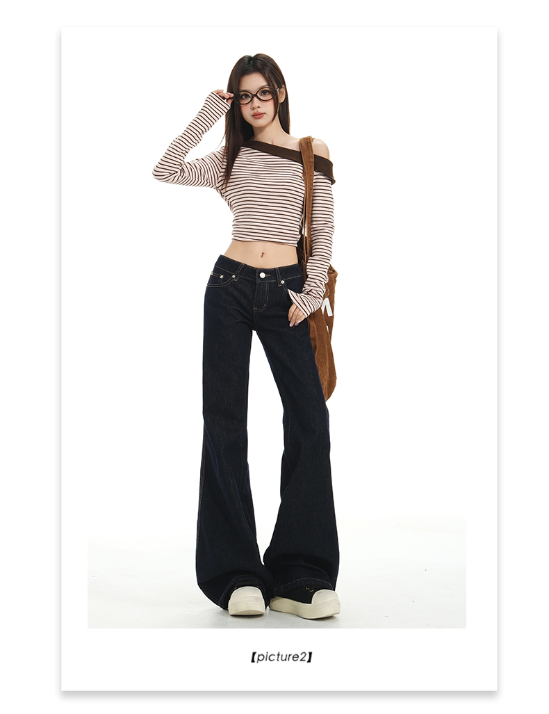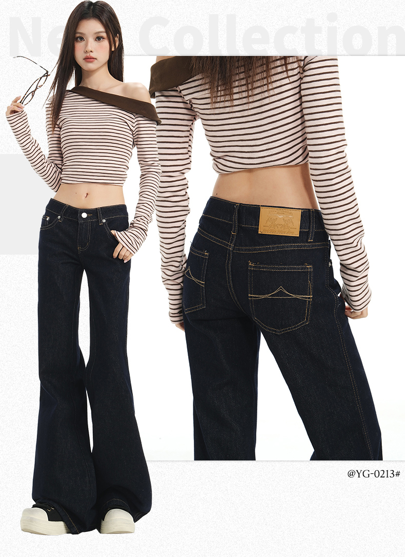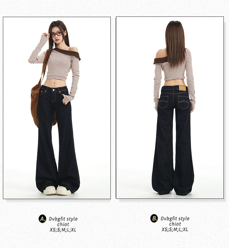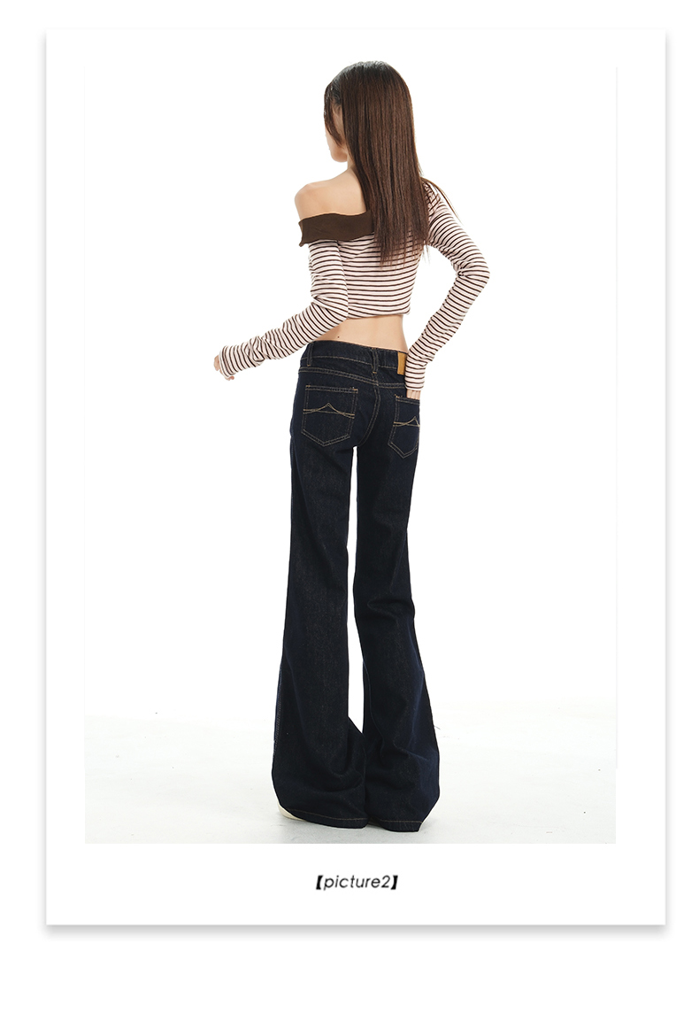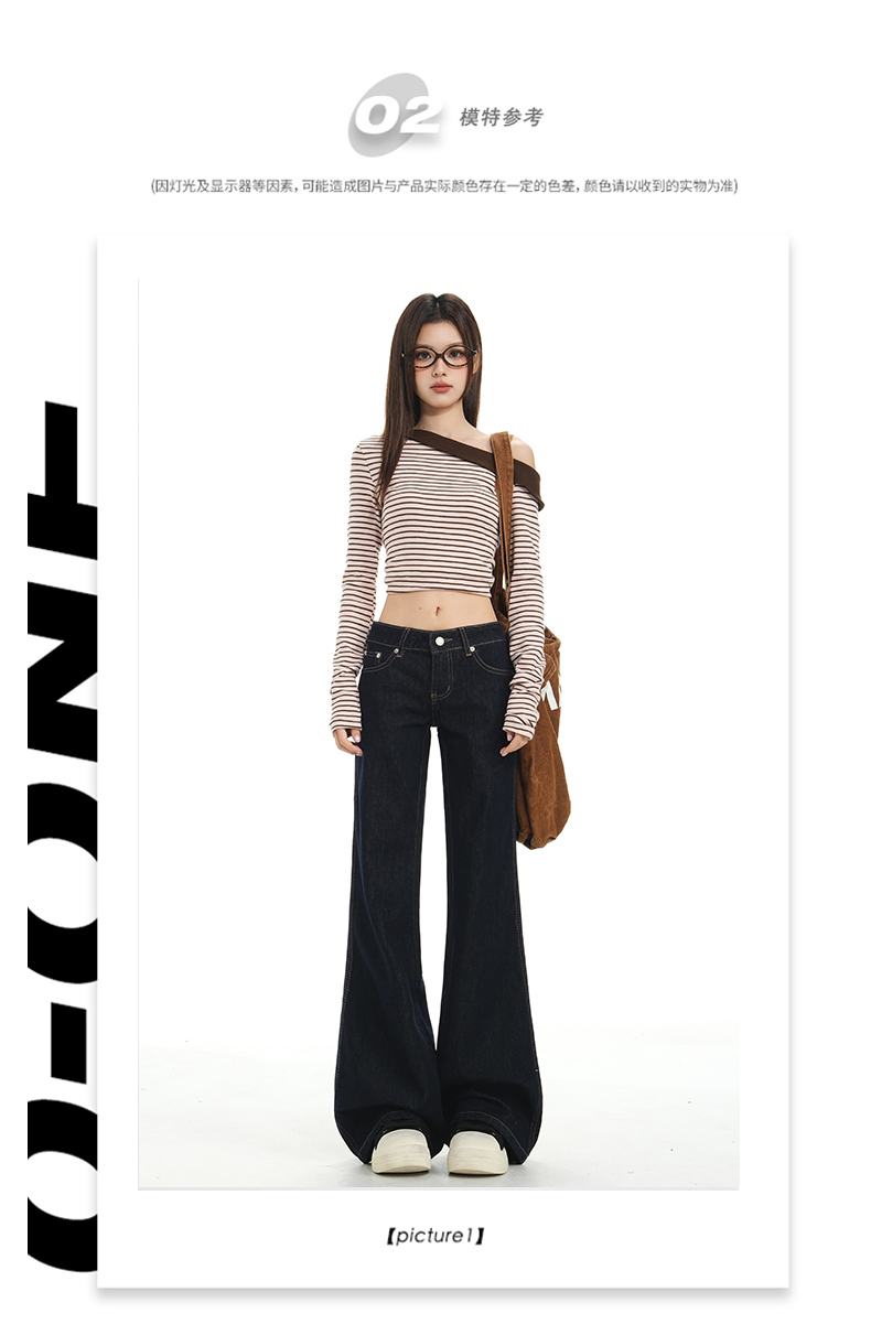 罗蒙春秋款女士深蓝原色牛仔裤低腰微喇美式复古宽松显瘦百搭拖地长裤