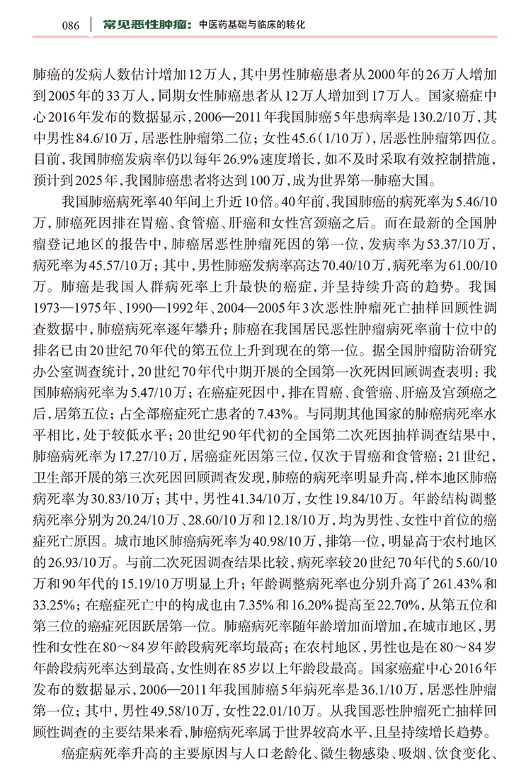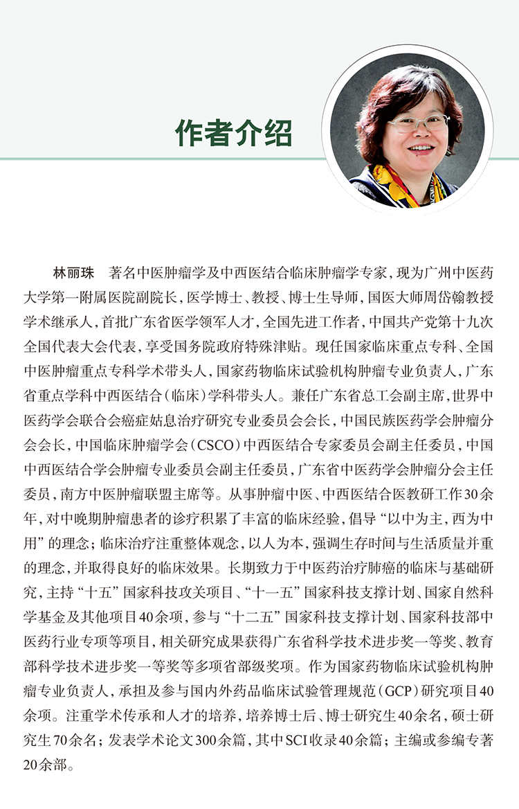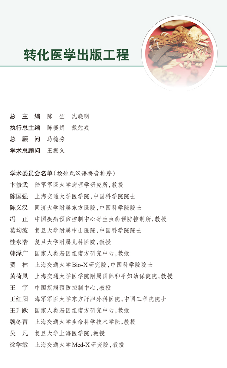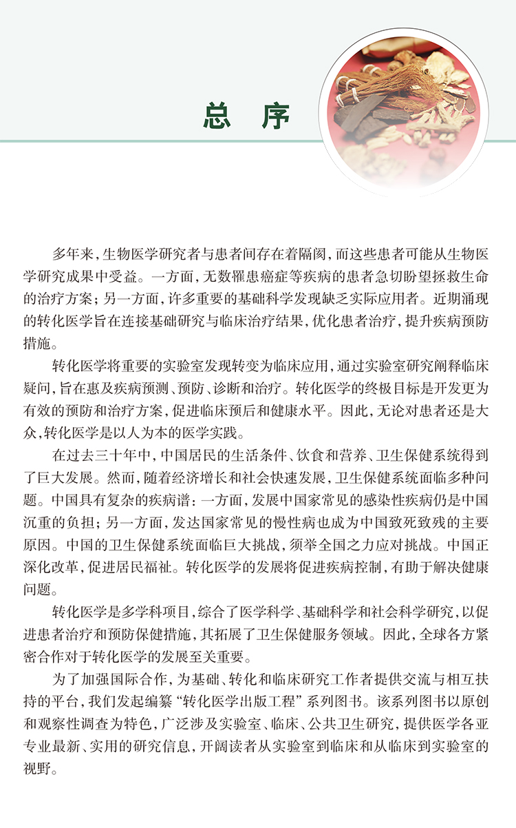 本书是“转化医学出版工程・肿瘤系列”之一,主要介绍了中医肿瘤学与转化医学研究结合的模式,中医肿瘤学与转化医学结合的临床实践方法,中医药转化研究的政策保障与人才培养,中医肿瘤转化医学平台构建的现状、挑战与未来;肺癌、肝癌、乳腺癌、胃癌、大肠癌、食管癌、血液肿瘤中医药转化研究的基础、诊治的现状与挑战、中医药“未病先防、既病防变”成功的经验及展望、常见肿瘤中医转化研究的方法、中医药在恶性肿瘤化疗骨髓抑制中的转化研究,中医药在恶性肿瘤常见伴随症状姑息治疗中的转化研究。本书以转化医学为切入点,强调顺应中医肿瘤学领域的自身需求,聚焦中医诊疗技术的特色和优势,同时吸纳现代医学研究成果,建立以转化为最终目的的疾病诊疗和预防新方法的系统回顾与展望,对研究生、从事中医药转化研究的科研人员以及临床医师,都具有很好的参考价值与指导意义。