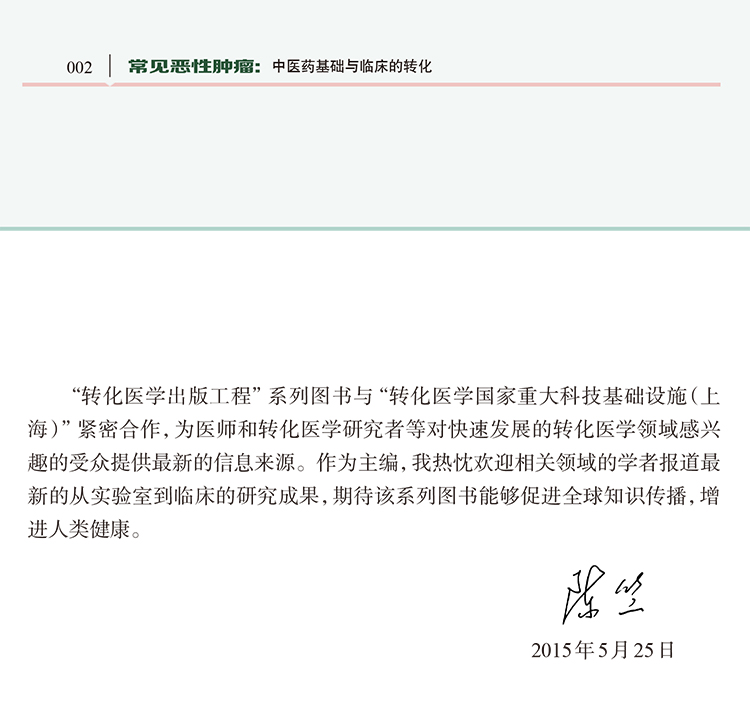 中医是我国及世界医学的瑰宝,是我国人民在古代长期医疗实践中逐步形成并发展起来的医学理论和诊疗实践体系,在当代依然发挥着重要作用。本书借鉴国内外多个肿瘤临床中心的实践经验,依托生物医药、转化医学等平台,形成跨领域、大合作的对常见恶性肿瘤中医药基础与转化医学研究成果。