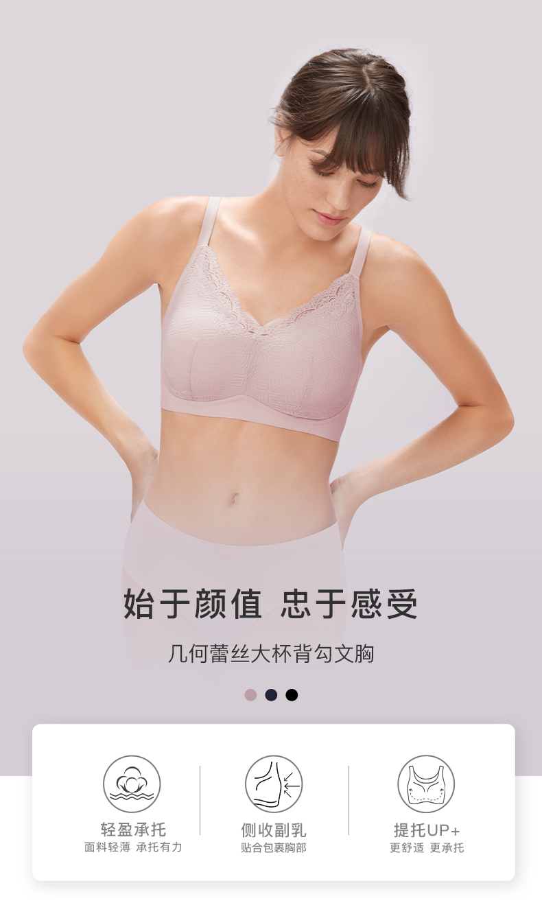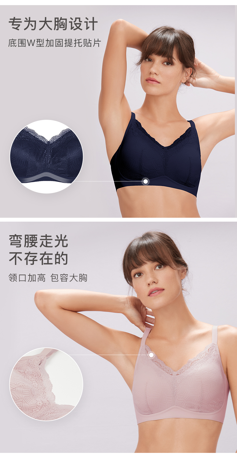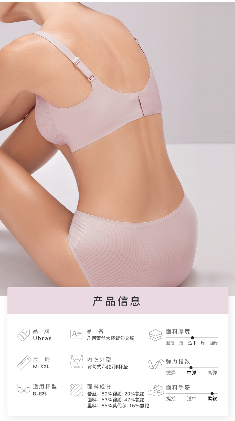 Ubras几何蕾丝大杯背勾文胸V领内衣女无钢圈性感透气女士胸罩