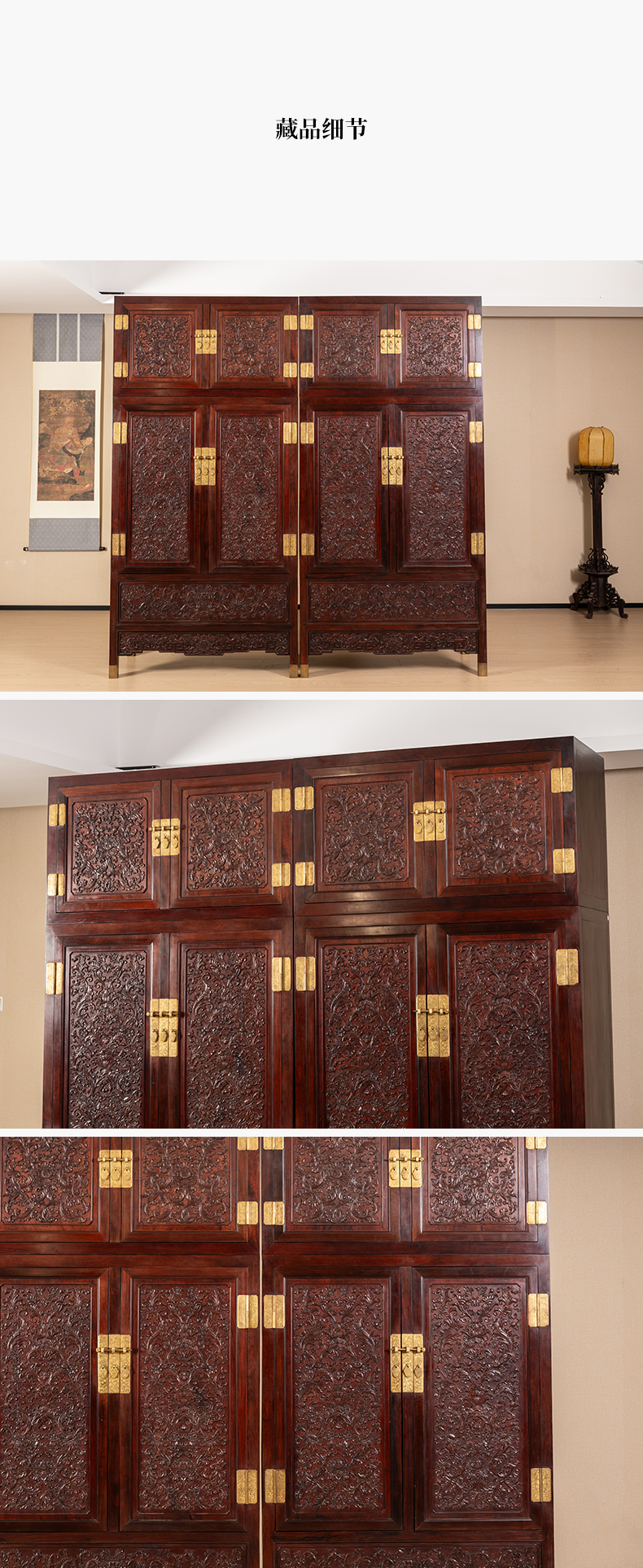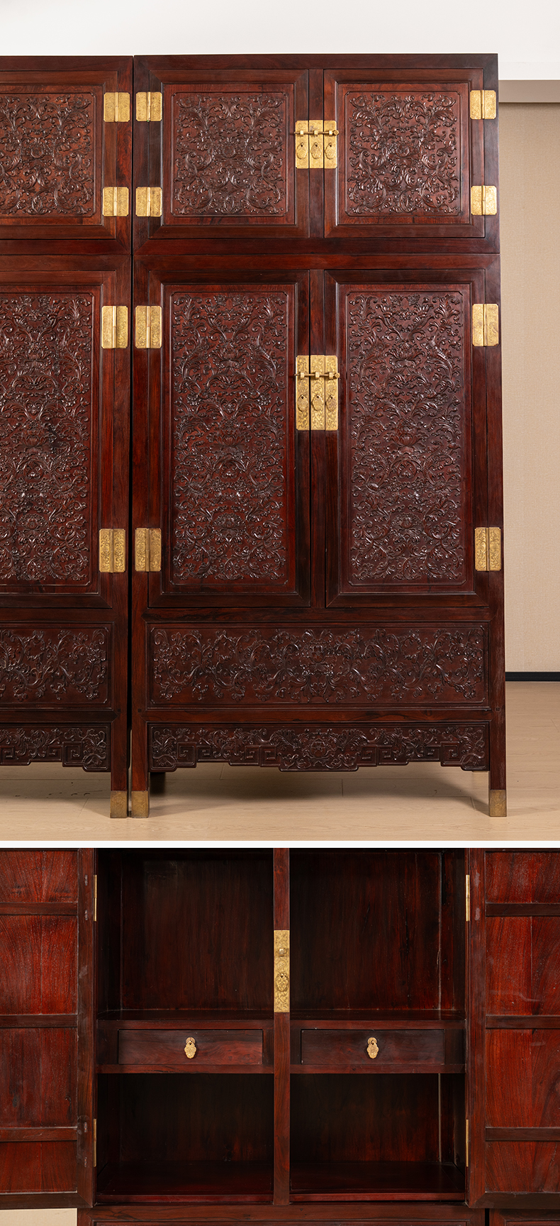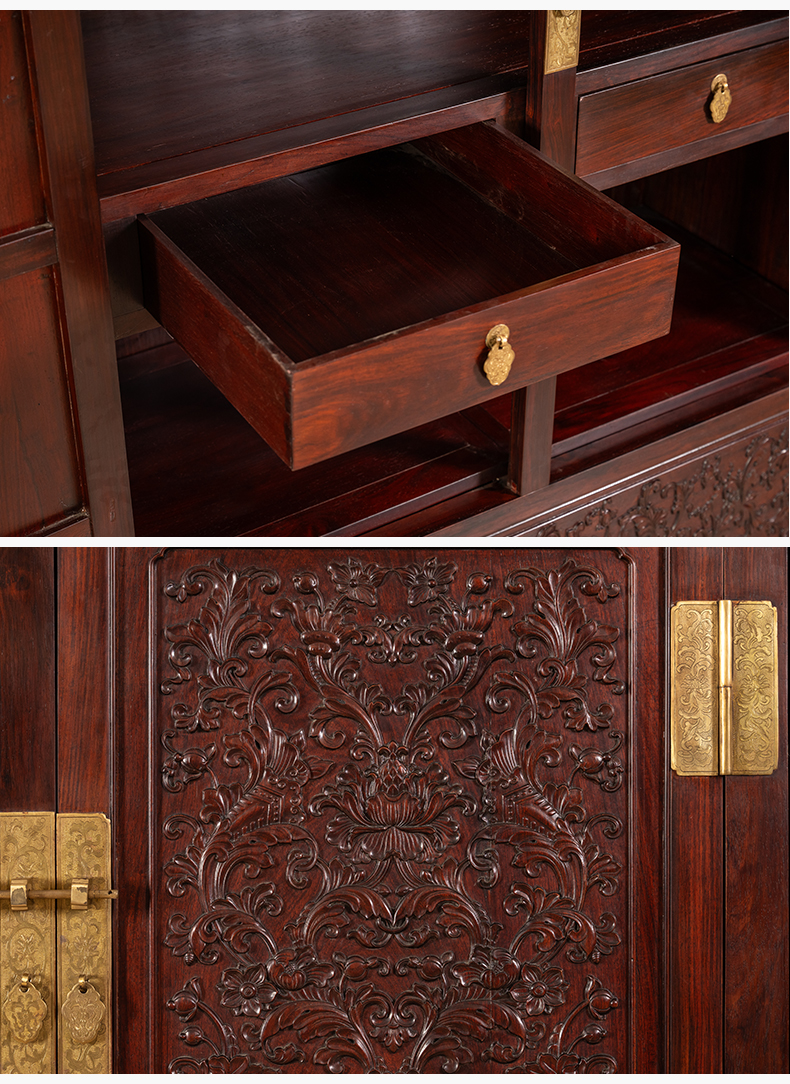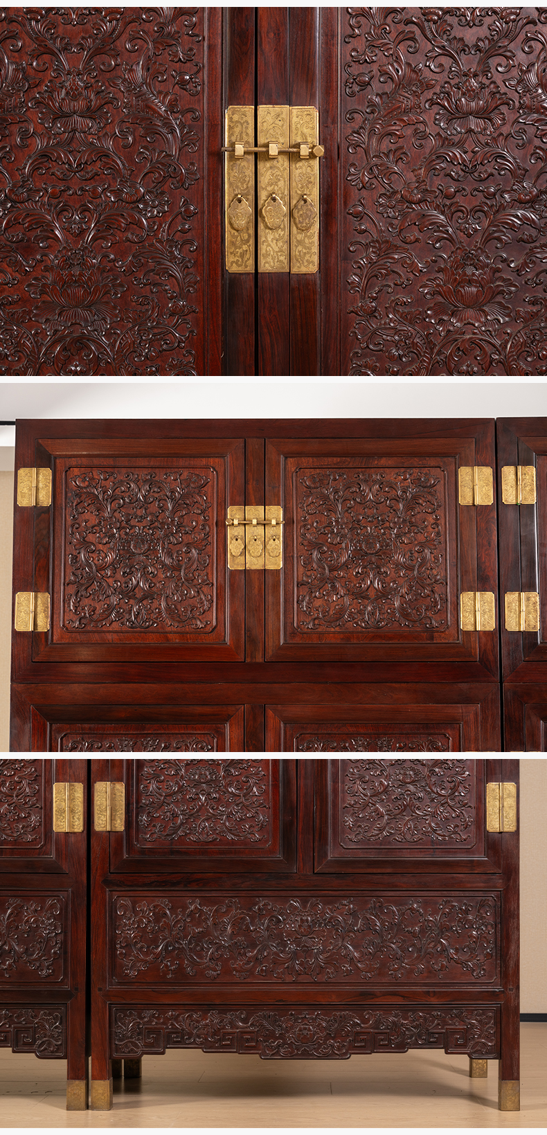 二十世纪 红木浮雕西番莲纹顶箱柜(一对)