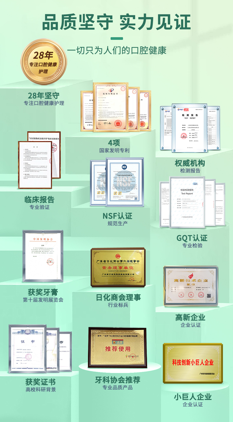 - 洁灵牙膏,由南方医科大学研制,牙膏的核心8081功效成分效果出众,在第十届全国发明展览会成为获奖牙膏。
