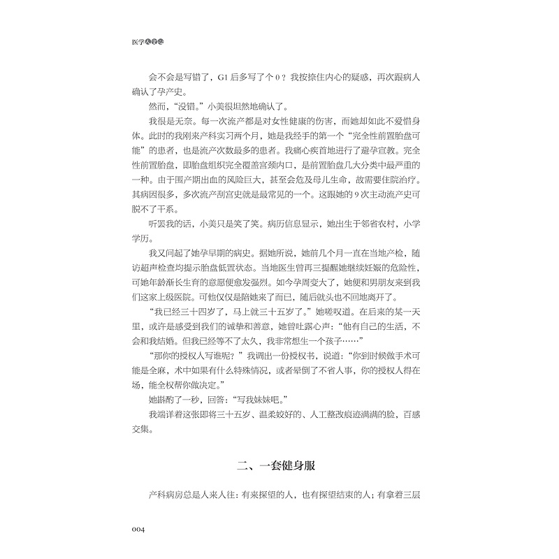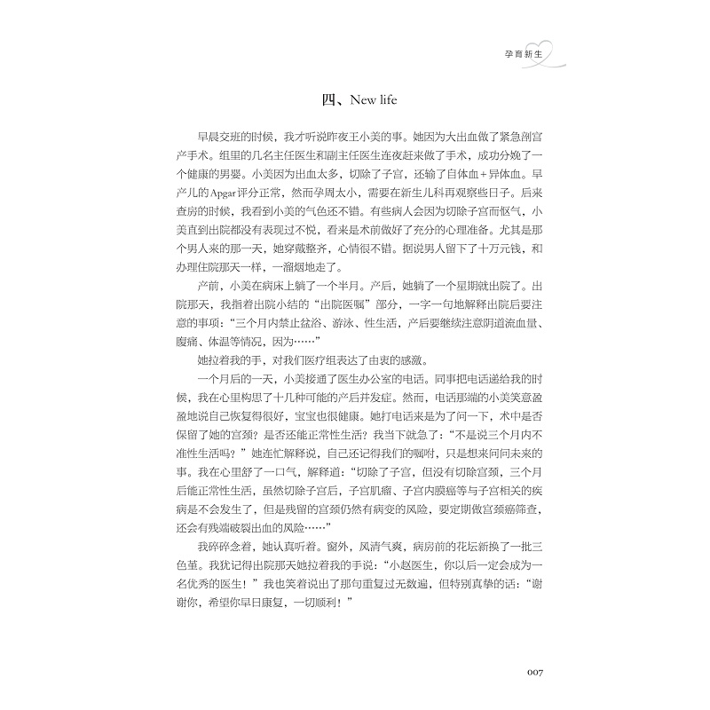 叙事医学是基于医学的叙事性特征发展的新兴学科。本书以叙事医学为落地点,由浙江大学医学院临床医学博士后执笔,记录了他们在住院医师临床工作中所经历的一个个感人至深、发人深思的医学人文小故事。本书分为《孕育新生》《绽放微笑》《温情时刻》《破茧成蝶》《攻坚克难》《以爱沟通》《生命尽头》七个篇章,展现了年轻医生优秀的人文职业素养;而浙江大学将叙事性作品阅读融入医学教育体系,也是一种全新的尝试。叙事医学是“由叙事能力所实践的医学”,充分挖掘了个体的叙事能力,在很大程度上整合了医学的专业性与普世性,为科学与人文之间的交流开辟了通道。