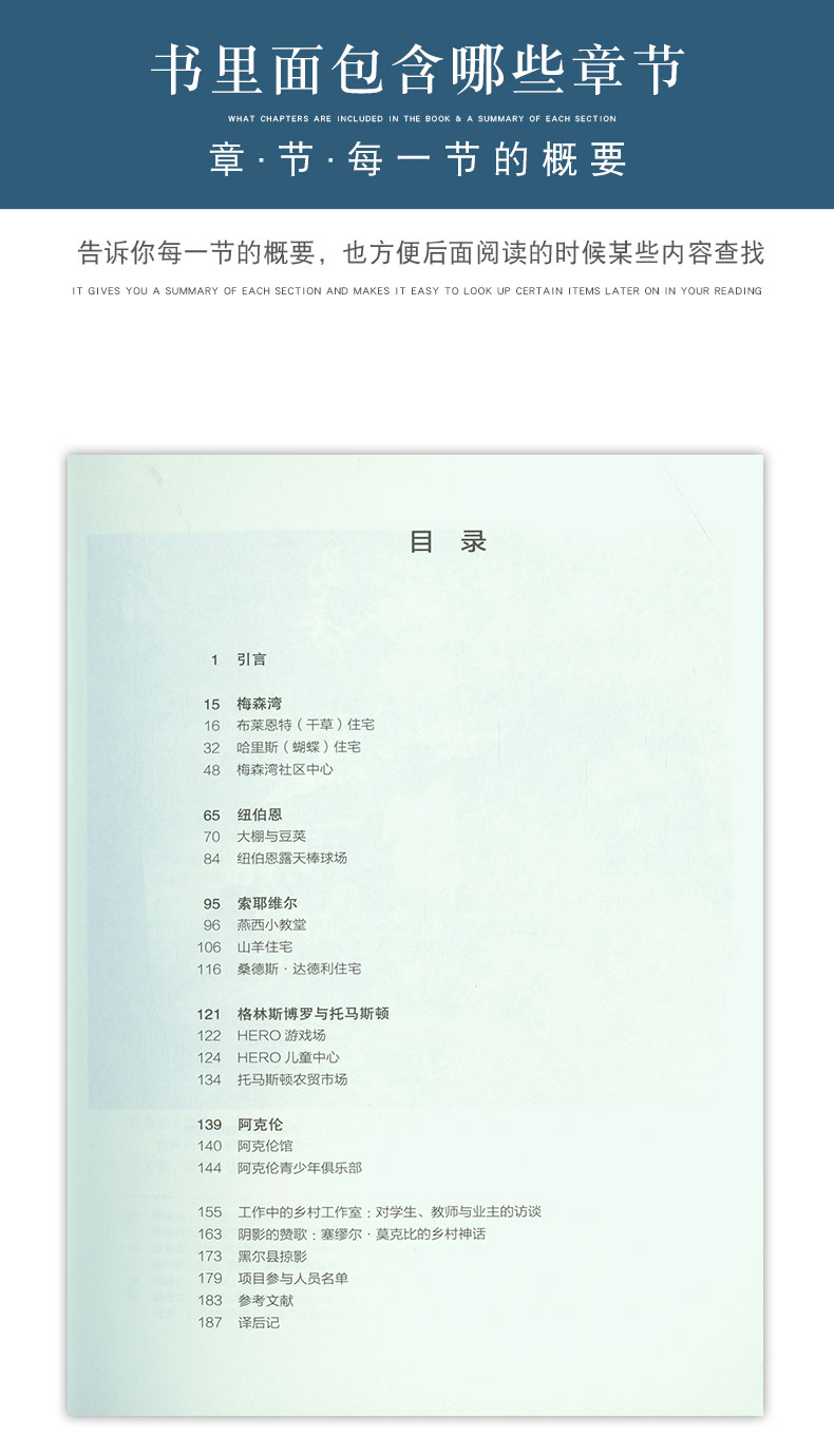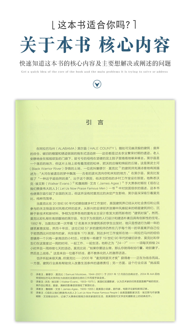 这本书主要介绍了一位美国建筑师在其生前致力于带领学生为阿拉巴马州贫困社区筹划、设计并建造住房和社区建筑,其特点可概括为:建筑的社会责任和人文关怀、现代主义与地区文化的结合、废弃材料和建筑的创造性使用、教学方式的一种实验性尝试。