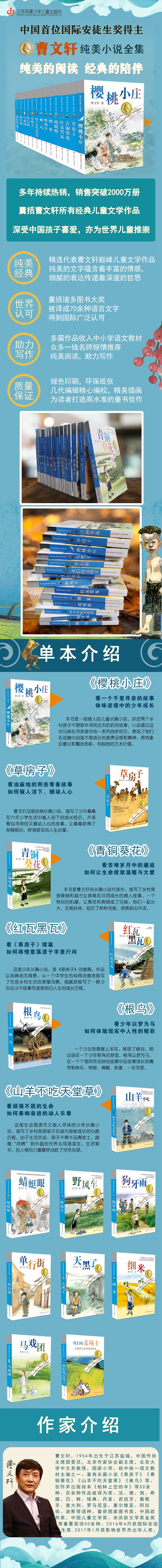 曹文轩,北京大学中文系教授,中国作家协会主席团委员,北京作家协会副主席,国家统一语文教材主编之一。主要长篇小说有《山羊不吃天堂草》《草房子》《红瓦》《根鸟》《细米》《青铜葵花》《蜻蜓眼》《樱桃小庄》等。创作并出版绘本《飞翔的鸟窝》《羽毛》《柏林上空的伞》等五十余种。出版学术性著作《中国80年代文学现象研究》《第二世界——对文学艺术的哲学解释》《20世纪末中国文学现象研究》《小说门》等。出版《曹文轩文集》(19卷)。百余种作品被译为英文、法文、德文、希腊文、日文、韩文、瑞典文、丹麦文、葡萄牙文、俄文、意大利文等文字。曾获全国“五个一工程”奖、中国作协全国优秀儿童文学奖、中华优秀出版物奖、中国出版政府奖、国家图书奖、宋庆龄文学奖、冰心文学奖、陈伯吹国际儿童文学奖、输出版权优秀图书奖、金鸡奖编剧奖、中国电影华表奖、德黑兰国际电影节“金蝴蝶”奖、北京市文学艺术奖等重要奖项七十余种。2016年获得国际安徒生奖,是中国获此殊荣的人。