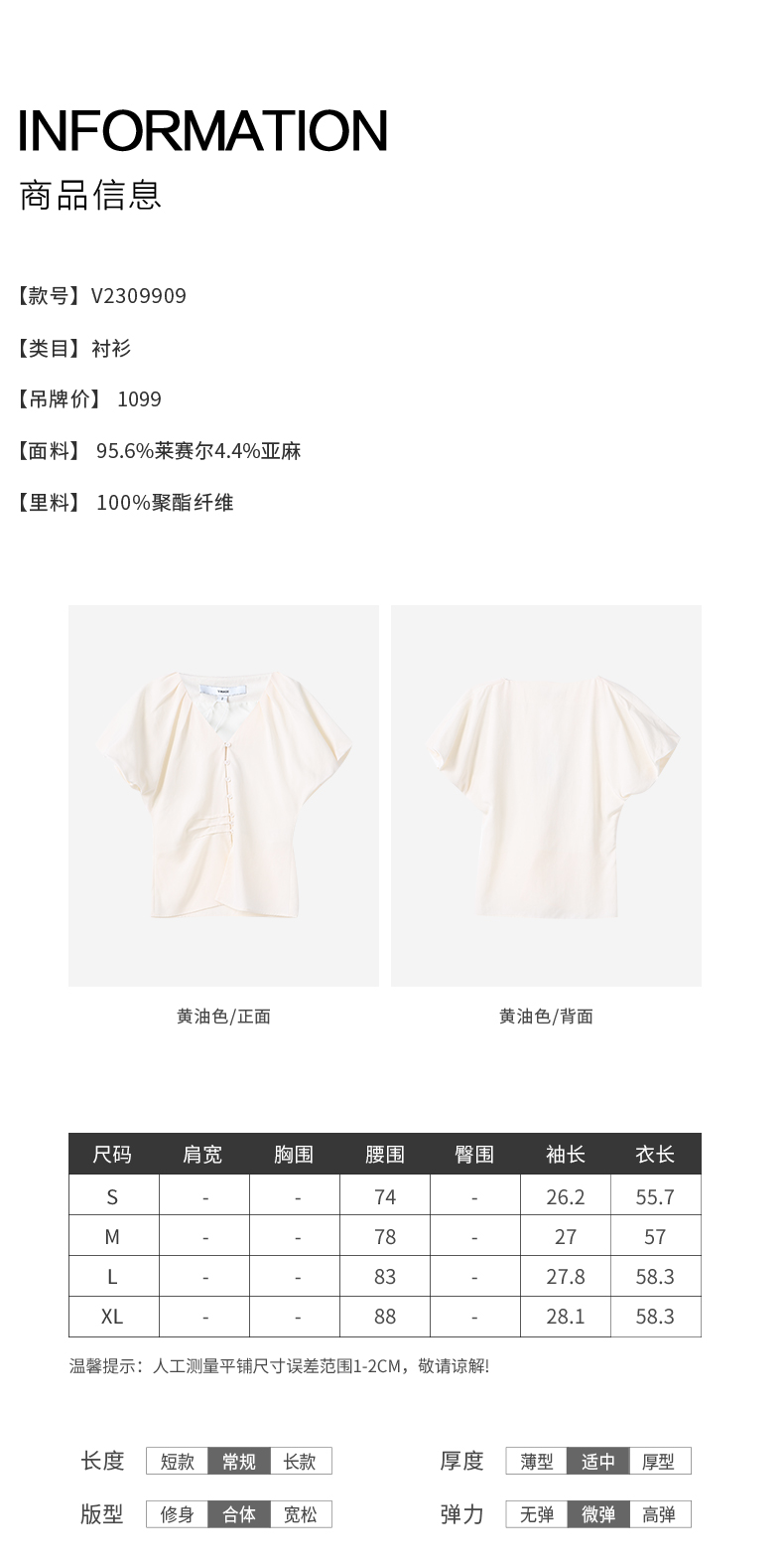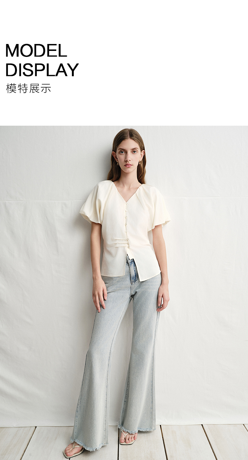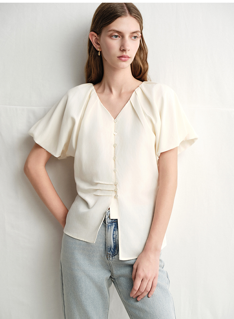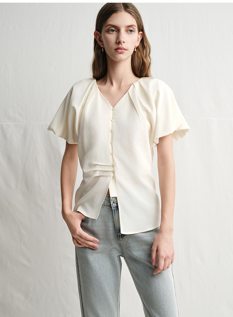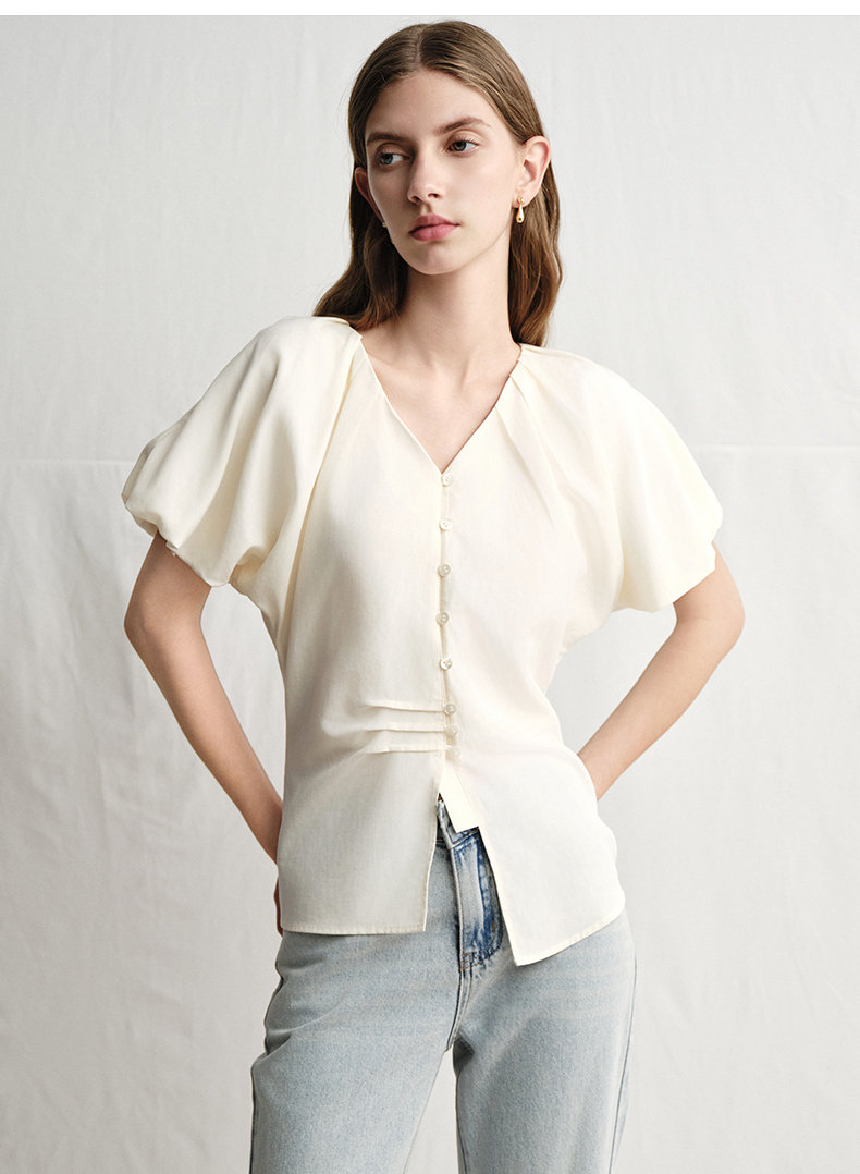 VIMAGE纬漫纪法式V领泡泡袖显瘦短袖压褶设计上衣女2025夏季新款V2309909