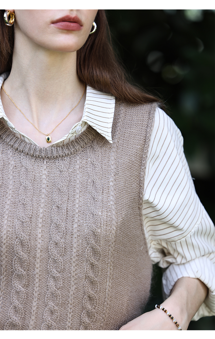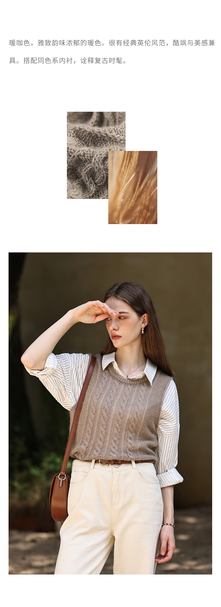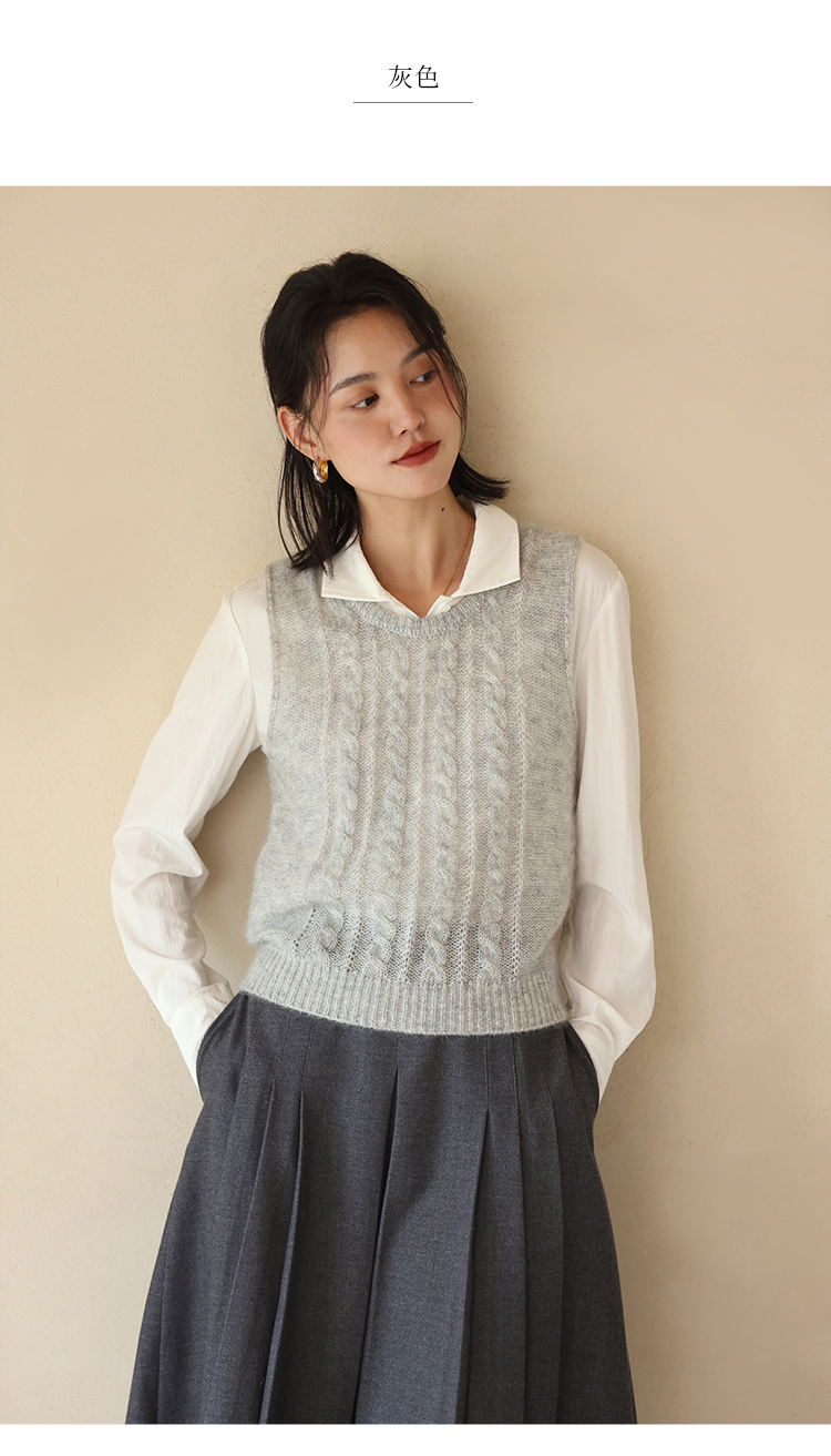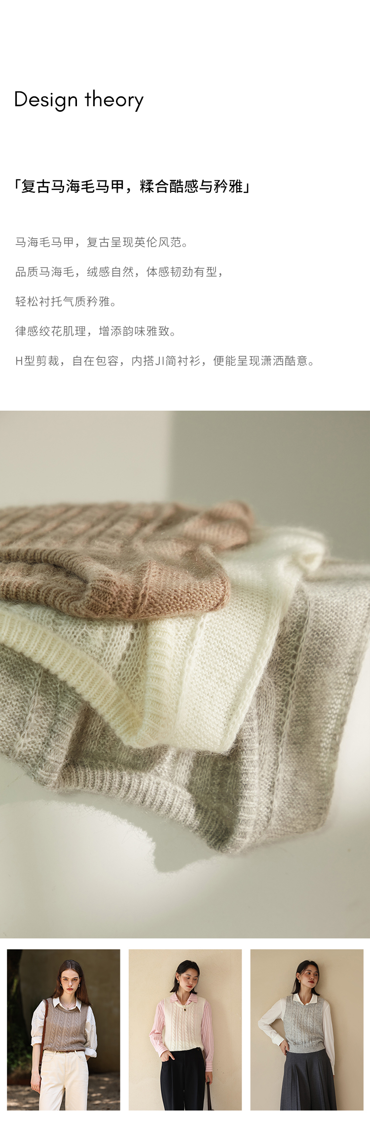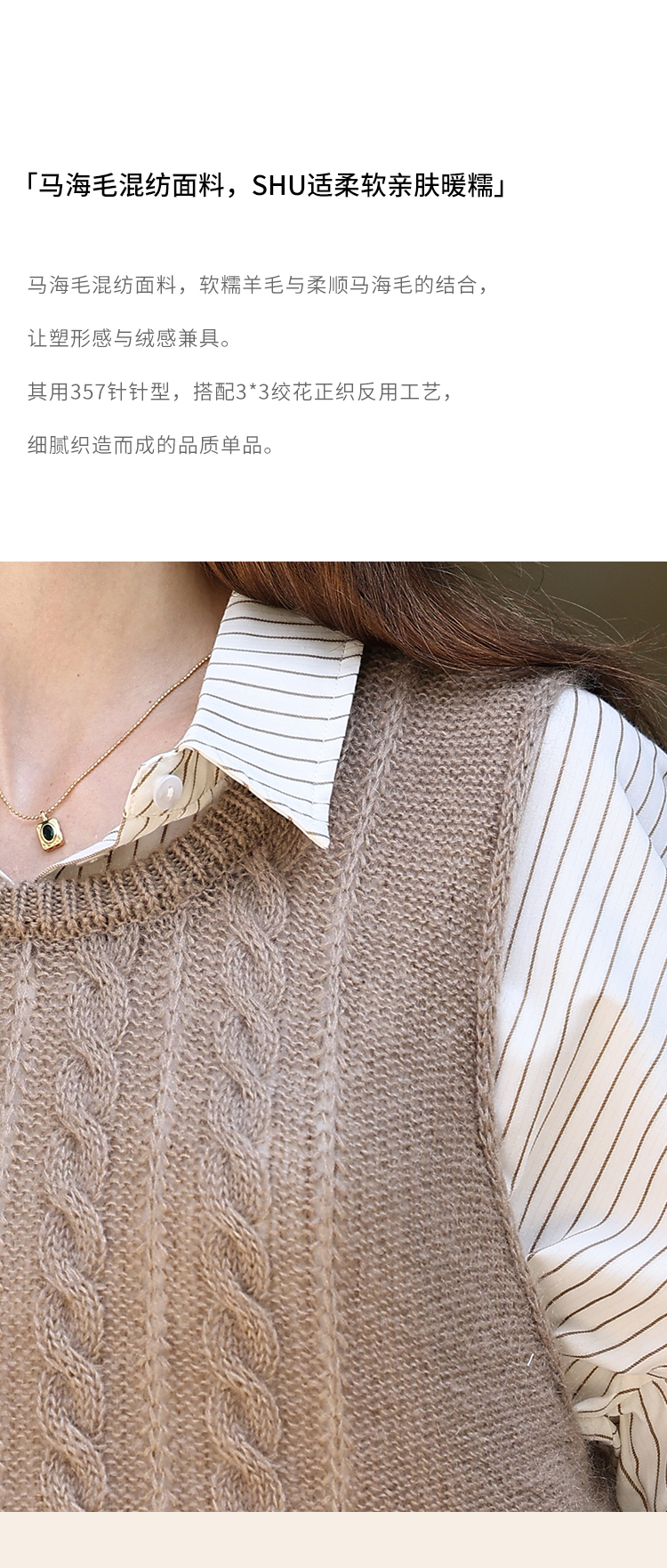 HeyDress马海毛针织马甲背心女秋季圆领宽松叠穿绞花设计羊毛马夹