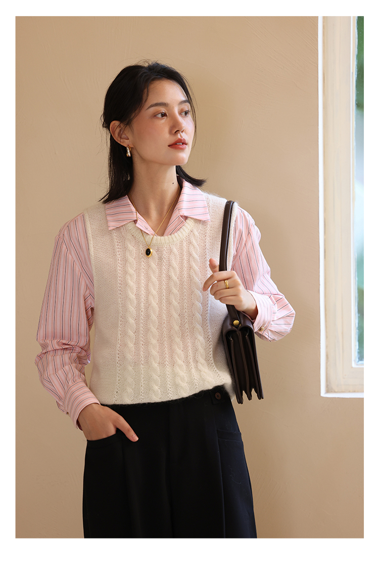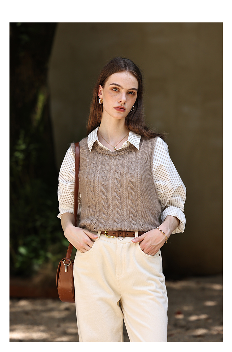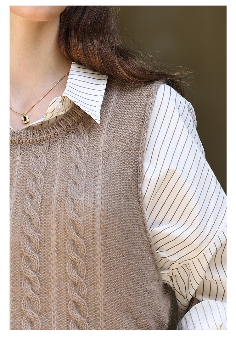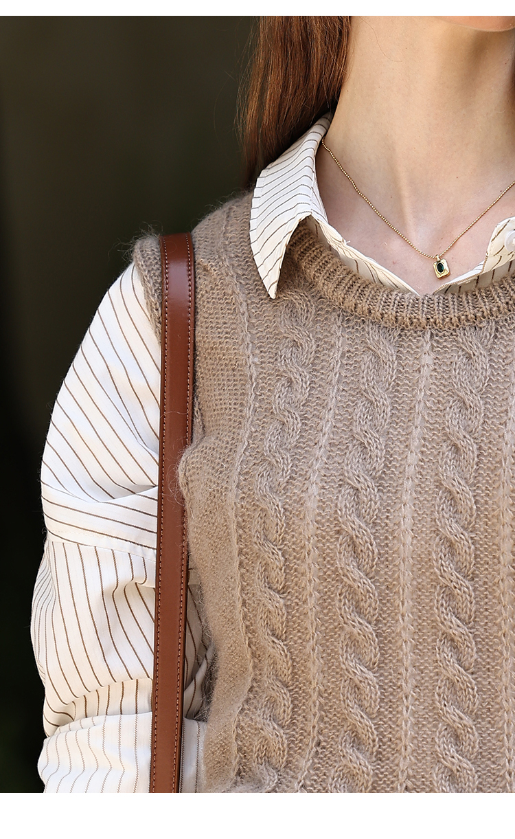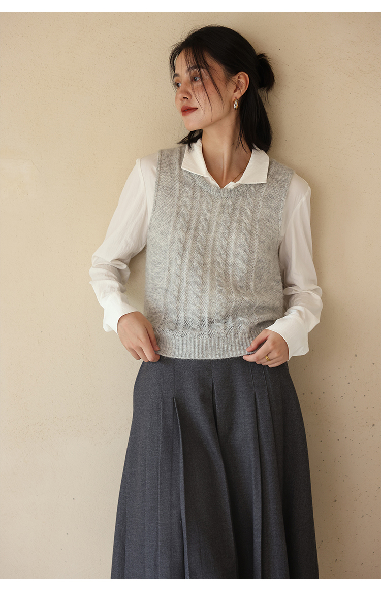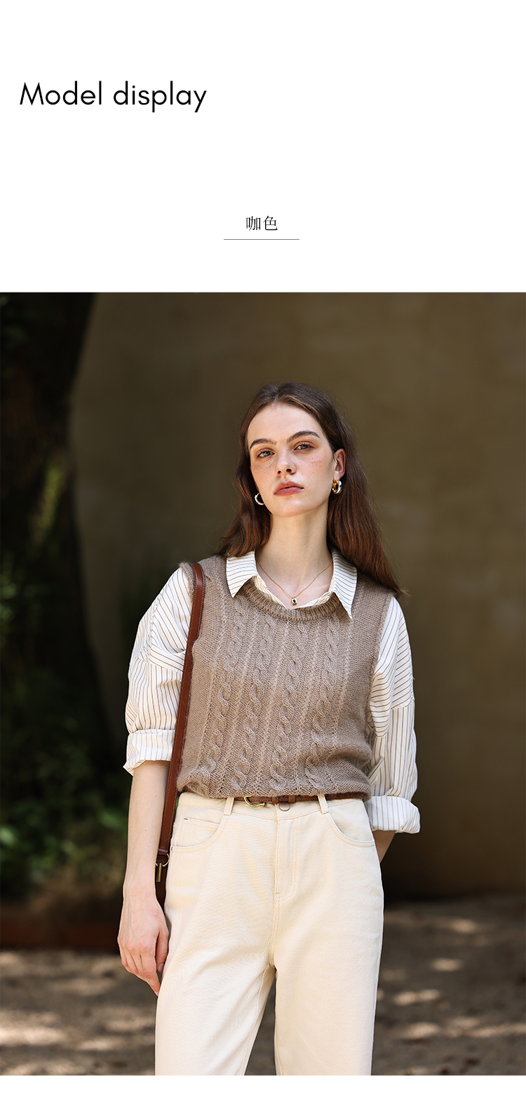 HeyDress马海毛针织马甲背心女秋季圆领宽松叠穿绞花设计羊毛马夹