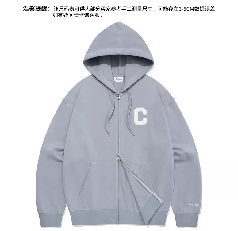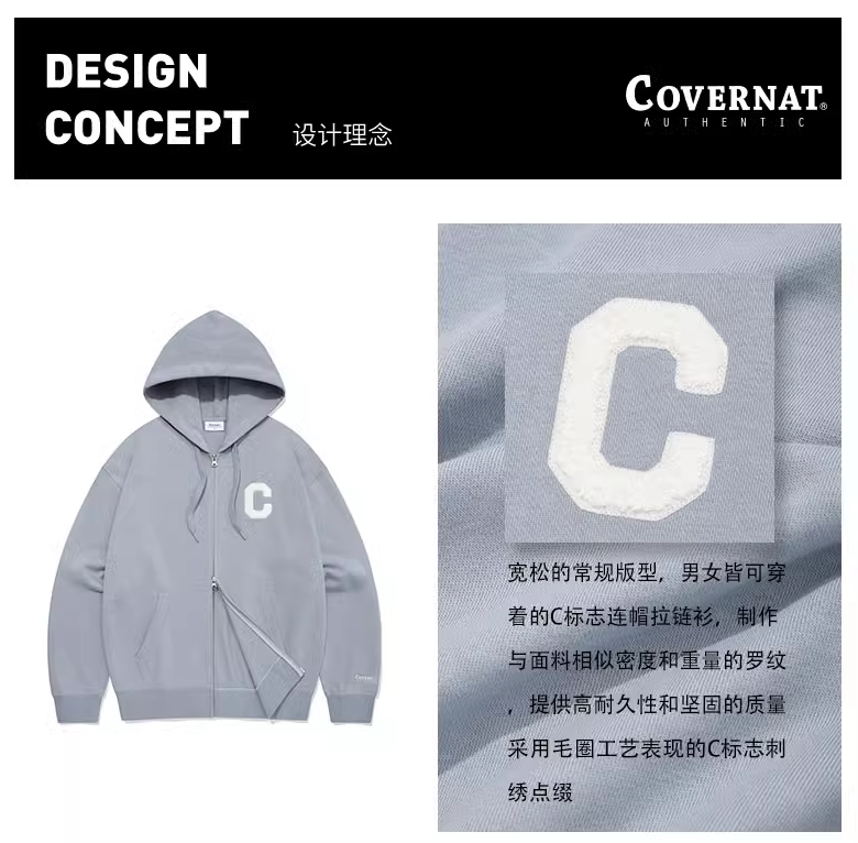 COVERNAT韩国潮牌秋冬新品拉链大C男女同款连帽卫衣CO2403HZ02