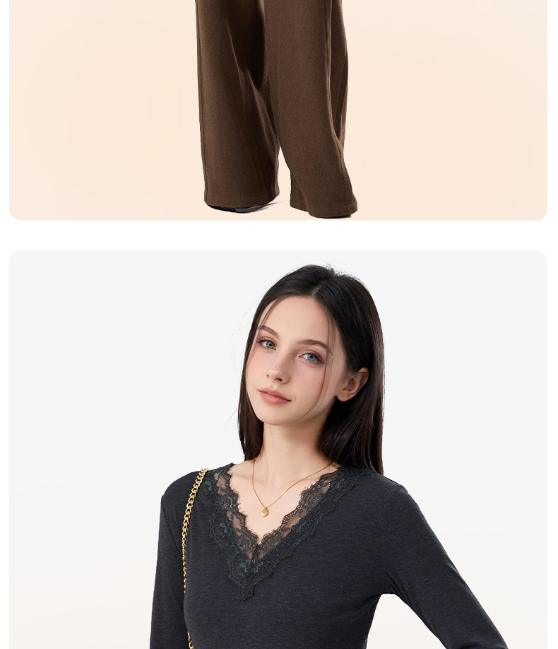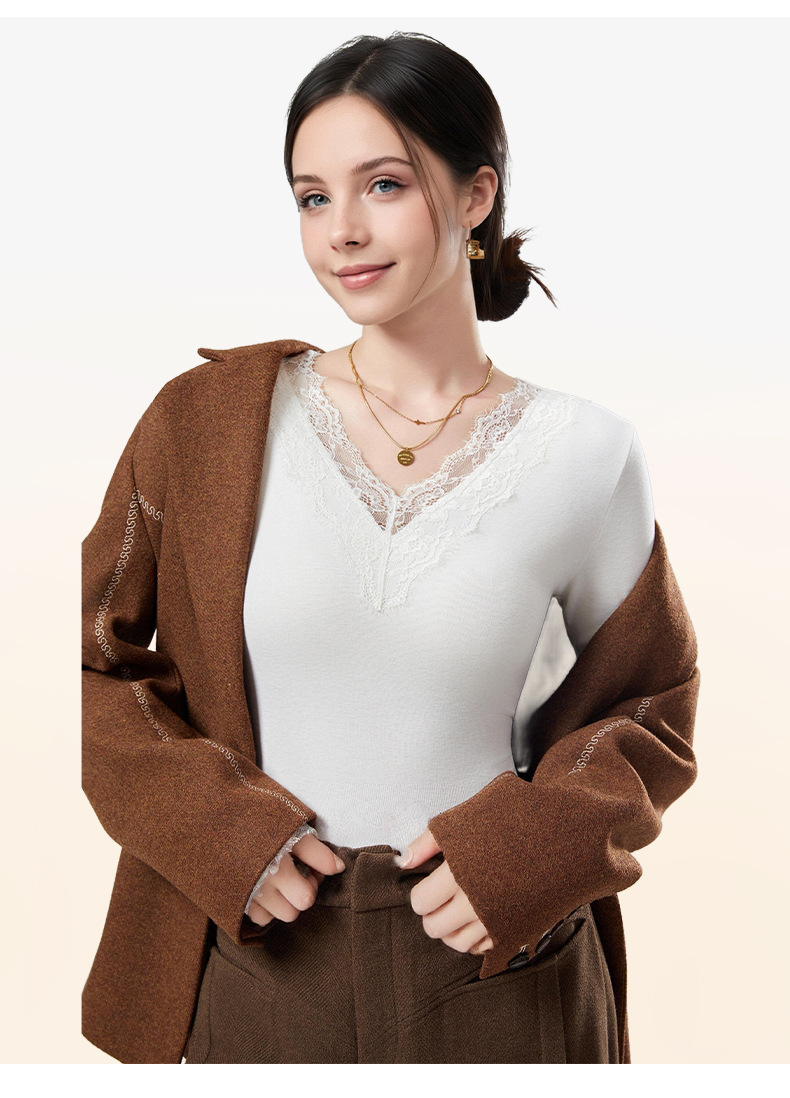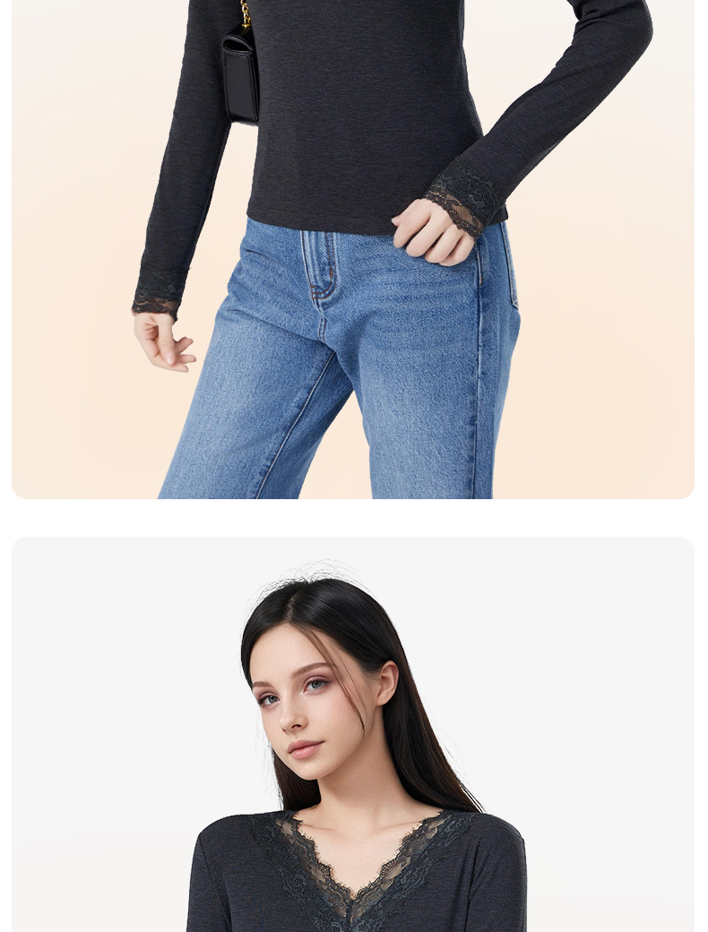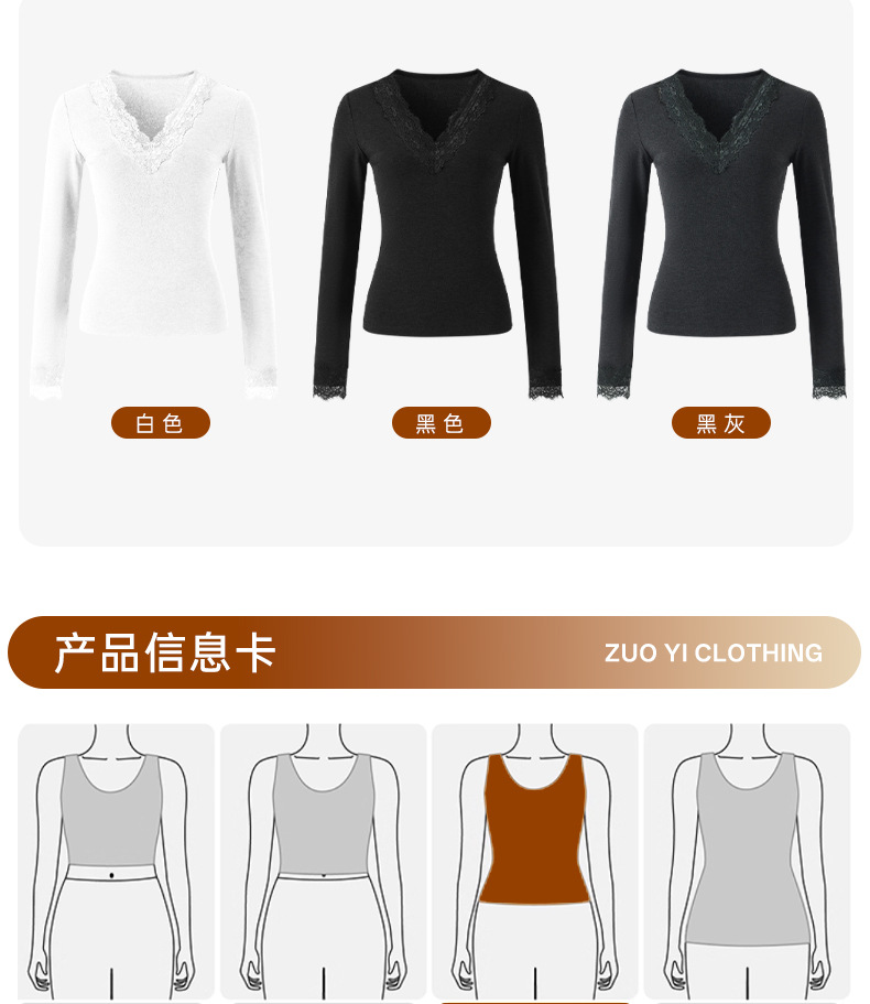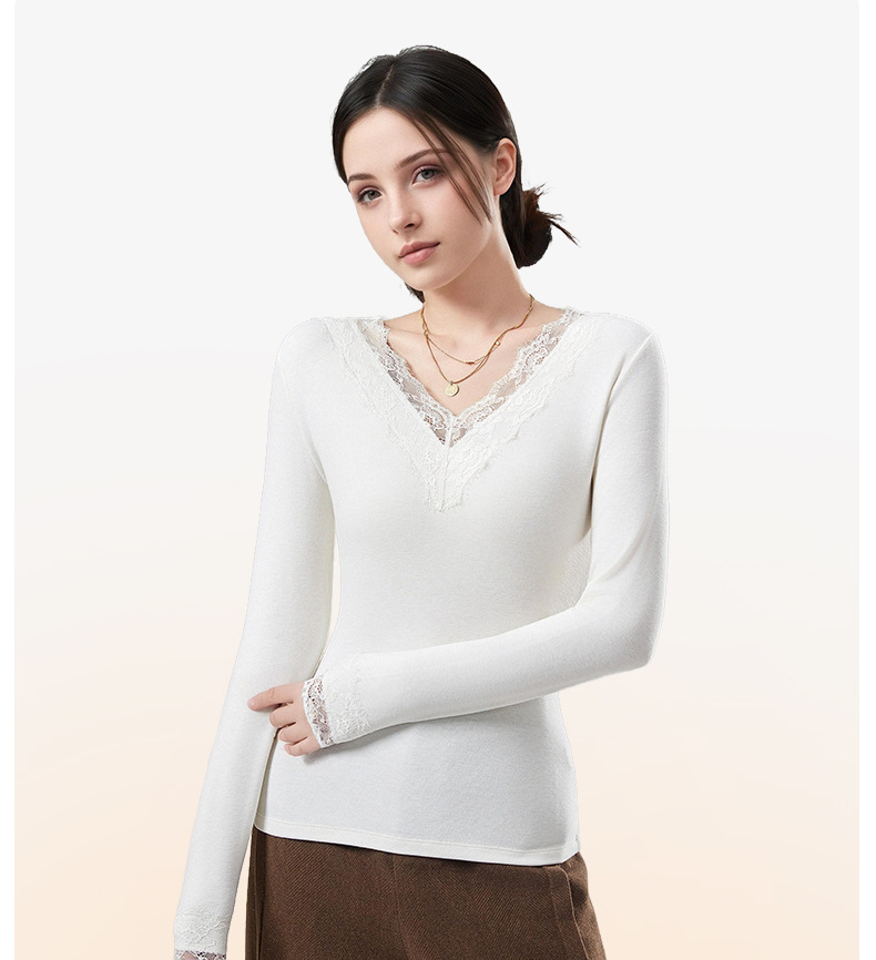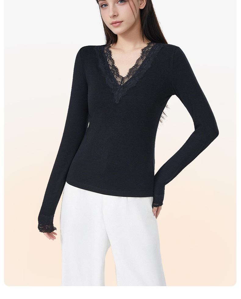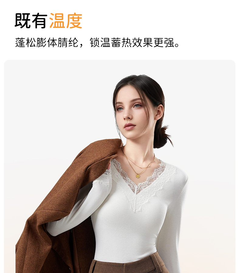 「自」全新升级【铂金会员146/天猫189/差价43】(01539)洛诗琳蕾丝V领抗菌打底衫2025秋冬修身德绒发热保暖上衣女