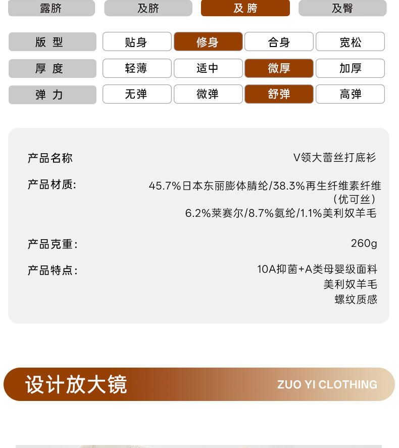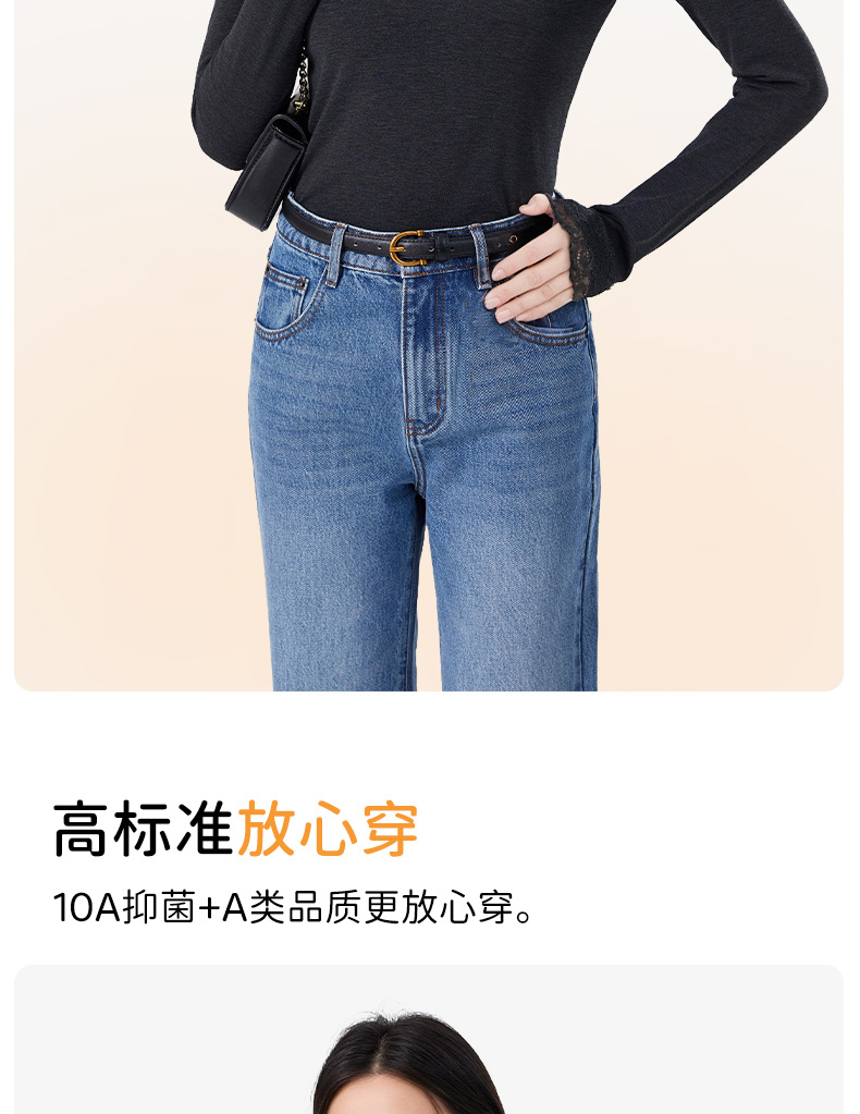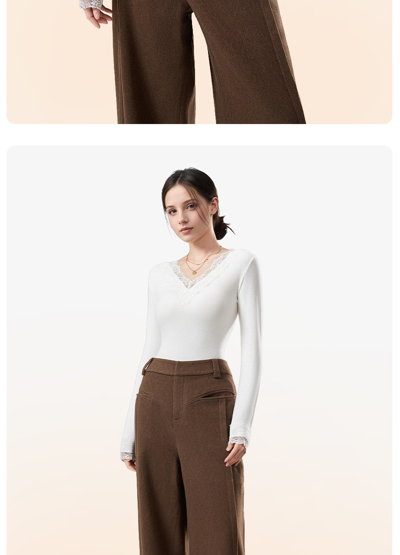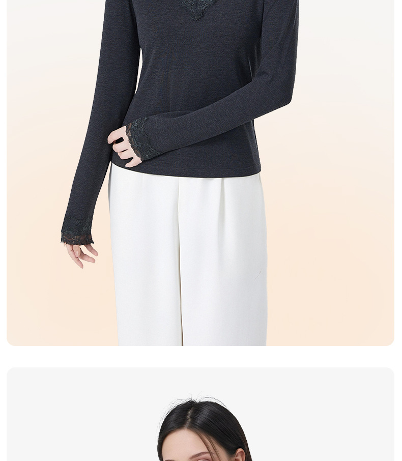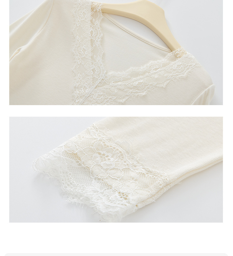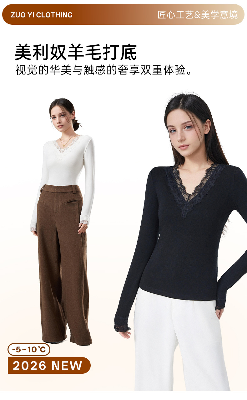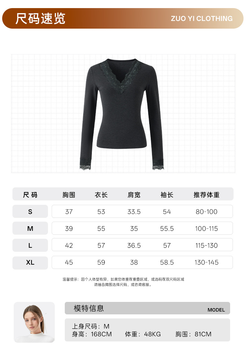 「自」全新升级【铂金会员146/天猫189/差价43】(01539)洛诗琳蕾丝V领抗菌打底衫2025秋冬修身德绒发热保暖上衣女