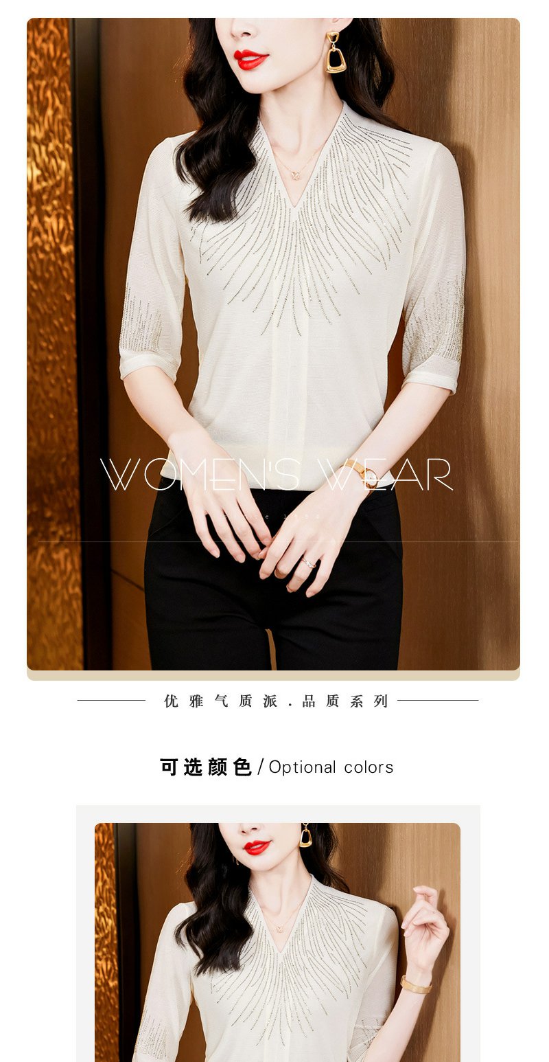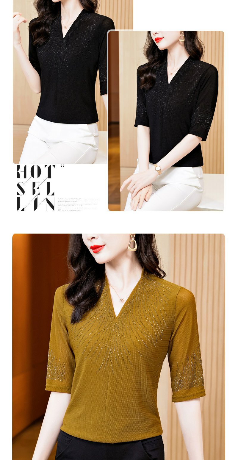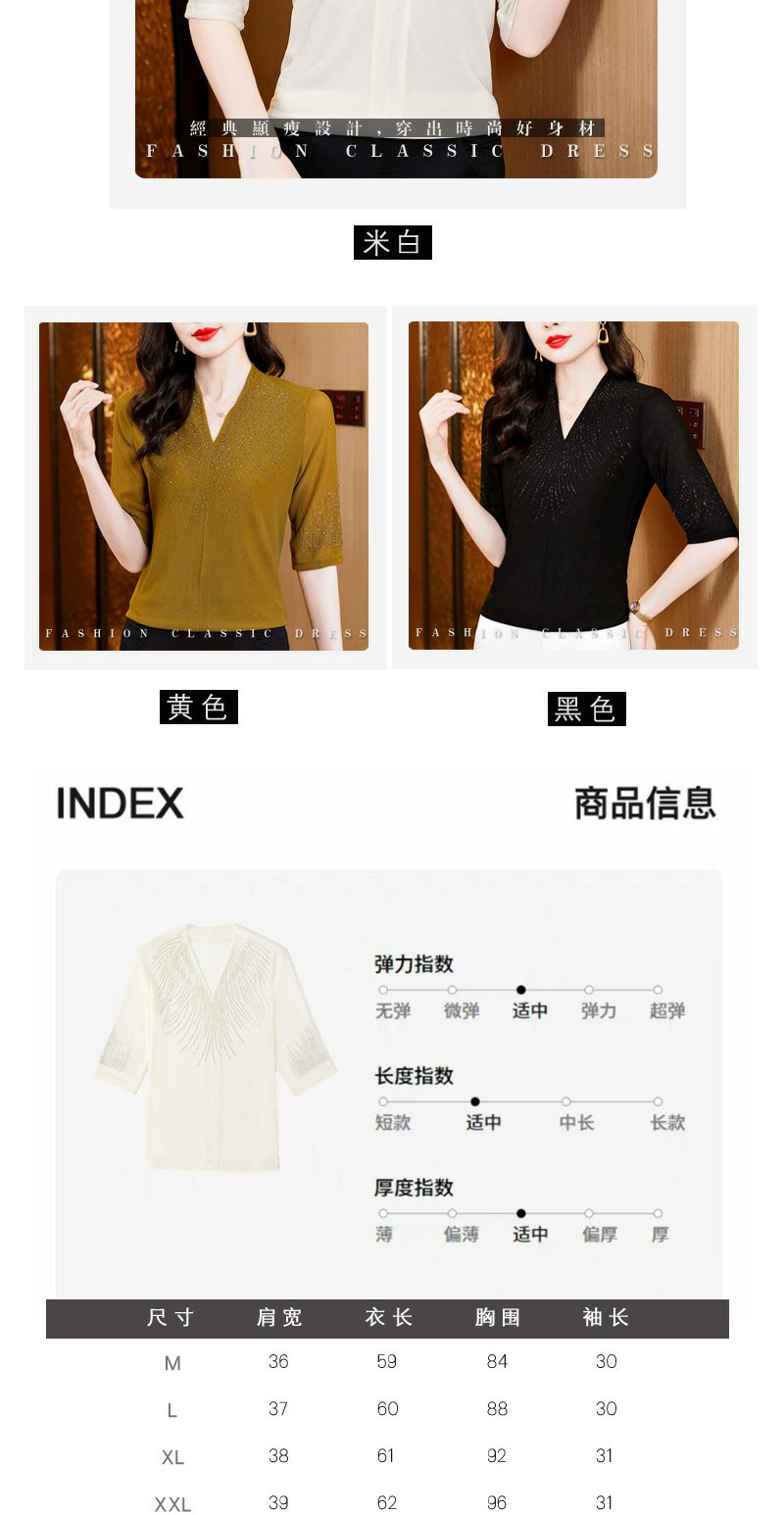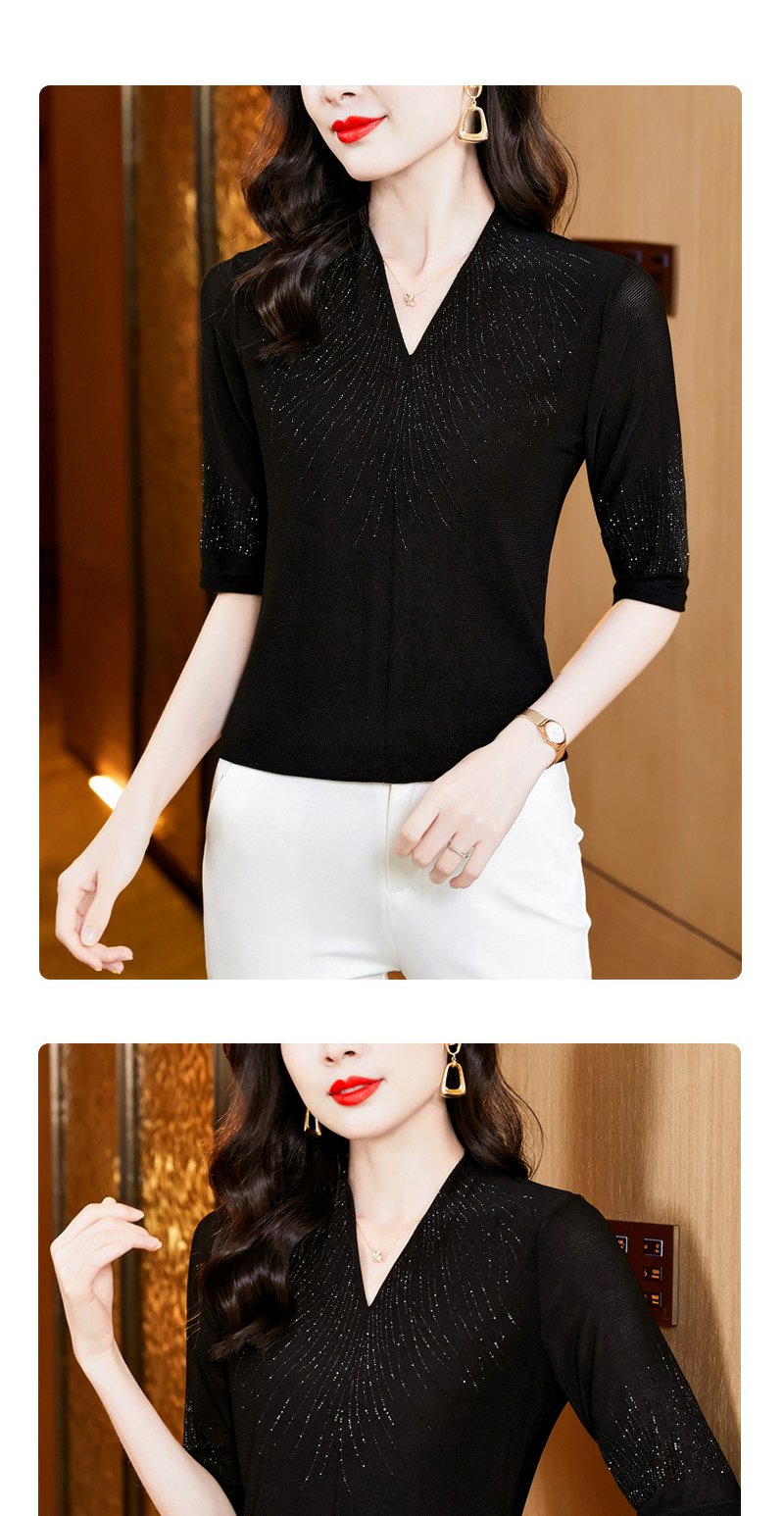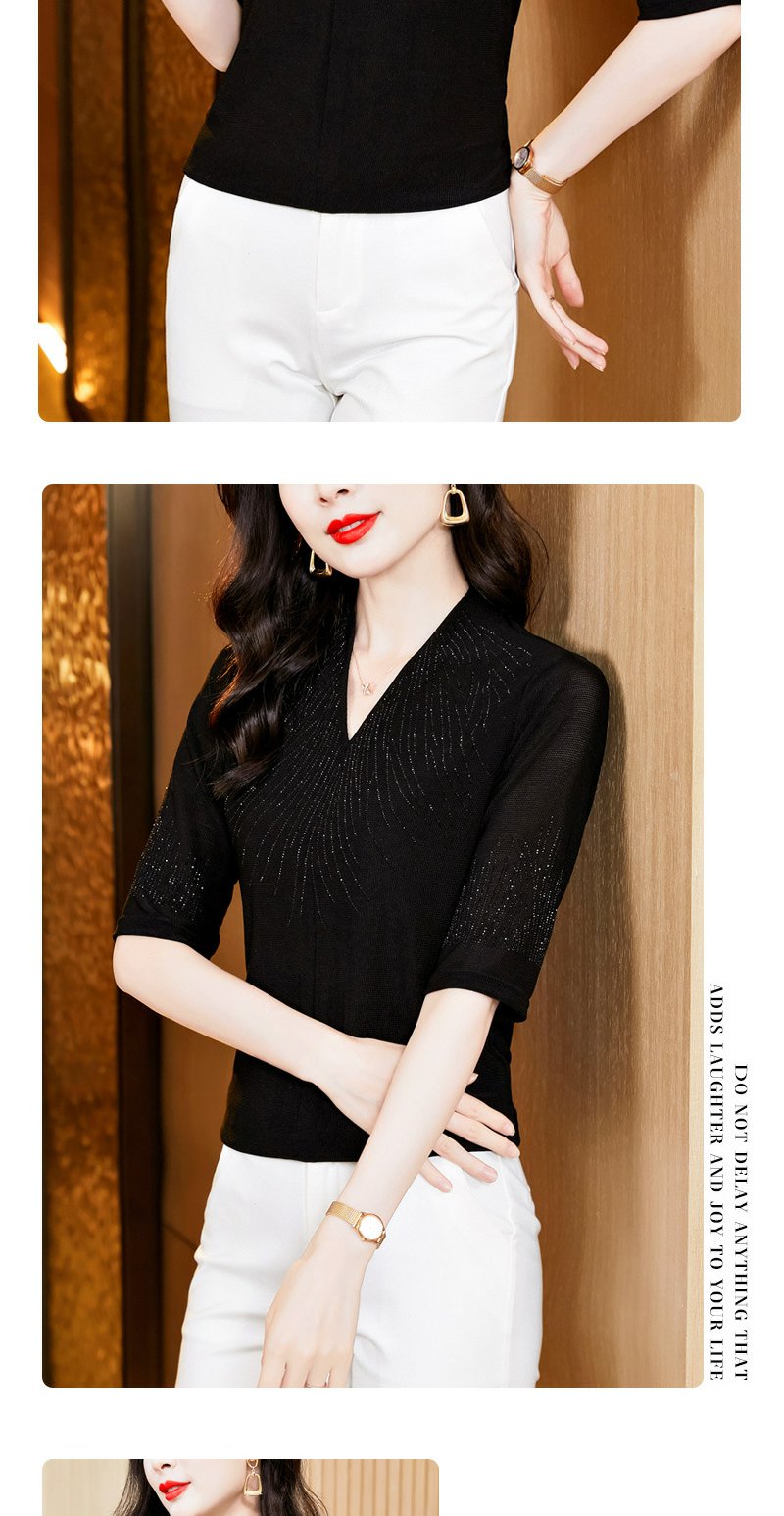 HT-2795实拍 新款气质百搭V领修身显瘦烫钻纯色中袖打底衫