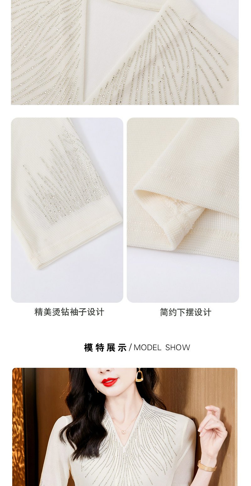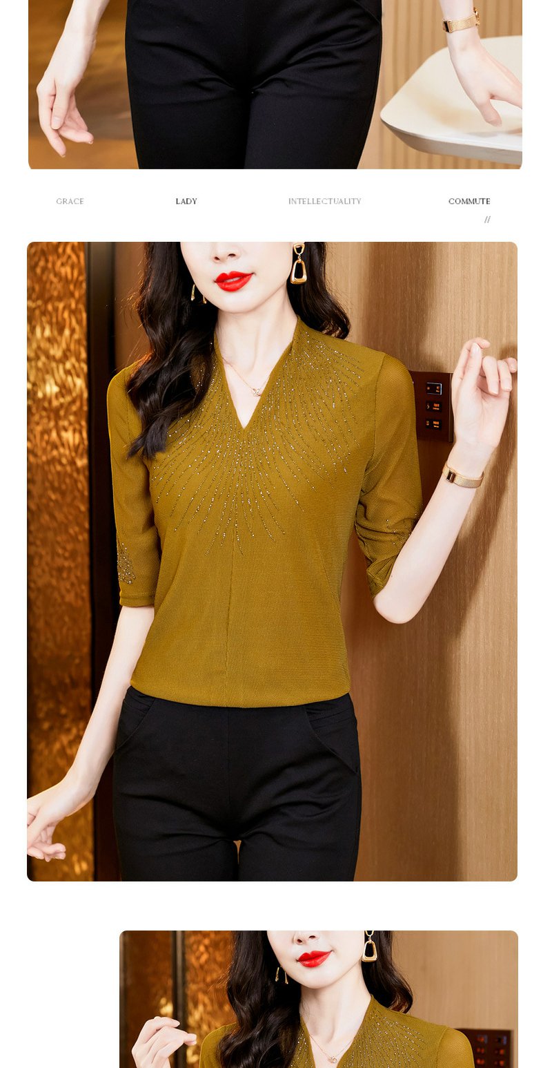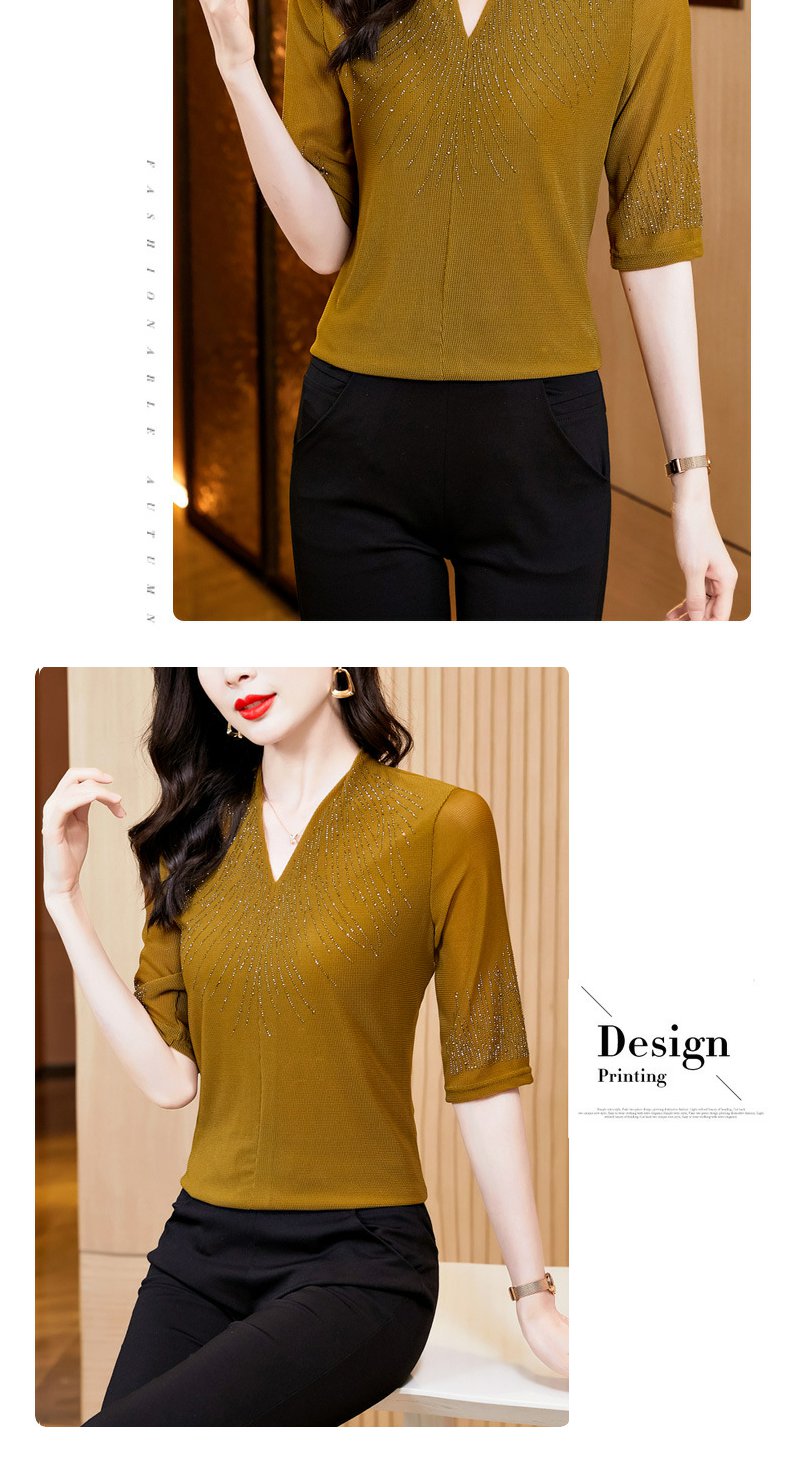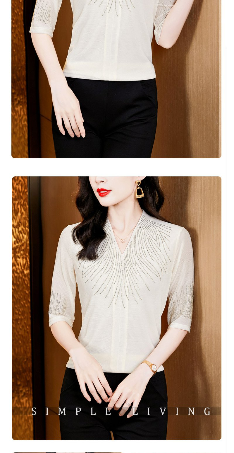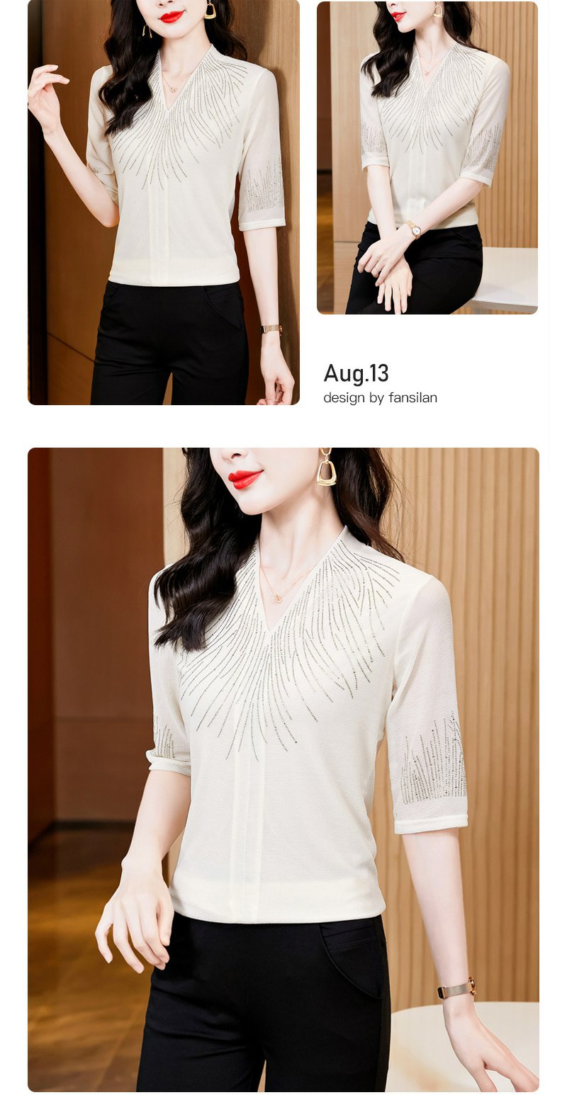 HT-2795实拍 新款气质百搭V领修身显瘦烫钻纯色中袖打底衫
