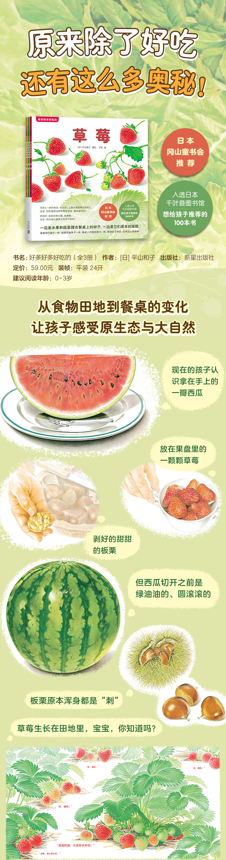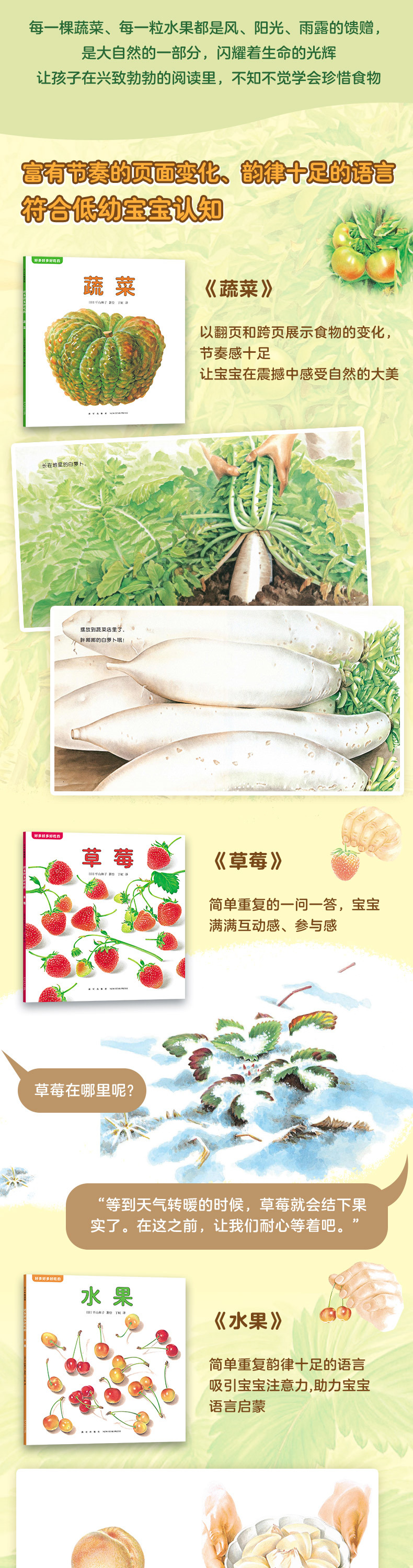 左侧的画面呈现出水果整体的形态,右侧的画面又以便于进食的形式将水果“递”给孩子们。平山和子细致地描绘出了水果清新细腻的触感,让孩子和大人爱上翻开每一页的过程!