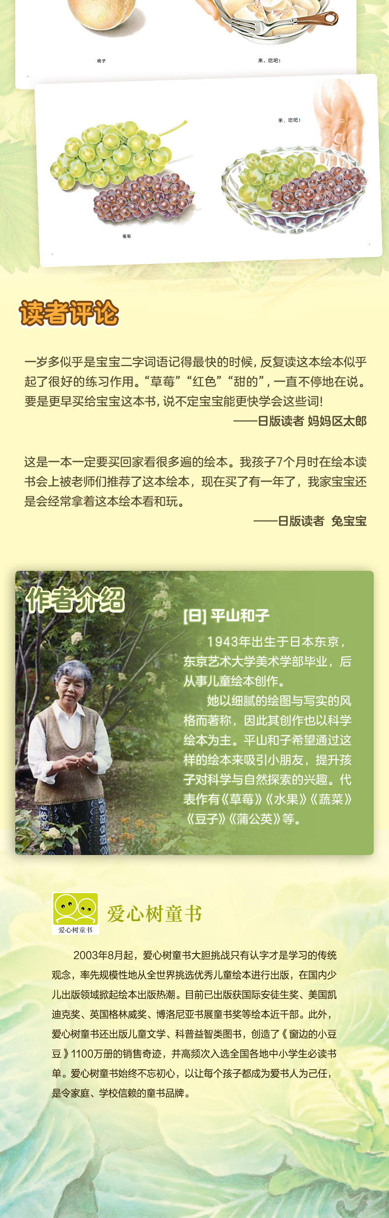 1943+年出生于日本东京,东京艺术大学美术学部毕业,后从事儿童绘本创作。她以细腻的绘图与写实的风格而著称,因此其创作也以科学绘本为主。平山和子希望通过这样的绘本来吸引小朋友,提升孩子对科学与自然探索的兴趣。代表作有《草莓》《水果》《蔬菜》《豆子》《蒲公英》等。