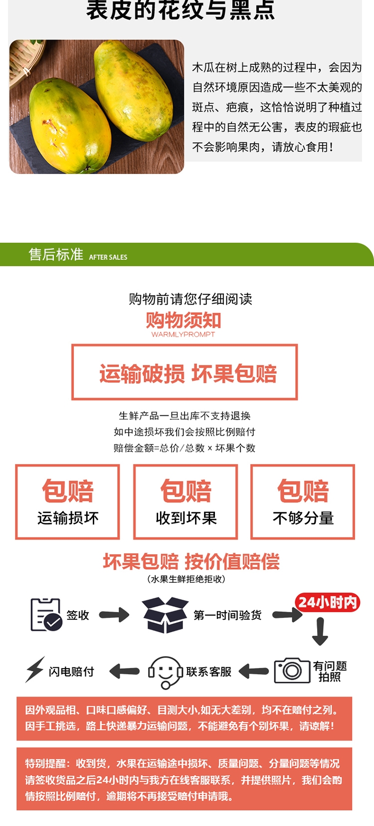 ③生鲜果蔬产品不支持退货退款,收到货后有任何质量问题,在24小时之内拍照联系客服进行售后理赔,售后方式按比例赔付(赔付金额=付款金额/产品总个数*坏果个数)。感谢您的信任,祝您购物愉快!